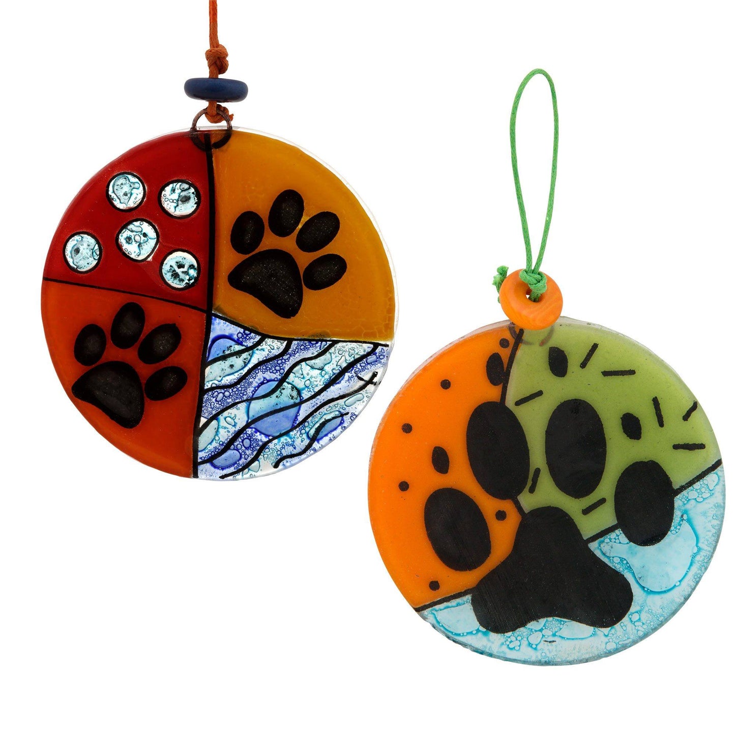Pretty paws decorate the bright colors and patterns of this recycled ornament. Add some pawzazz to your home and Christmas tree.
