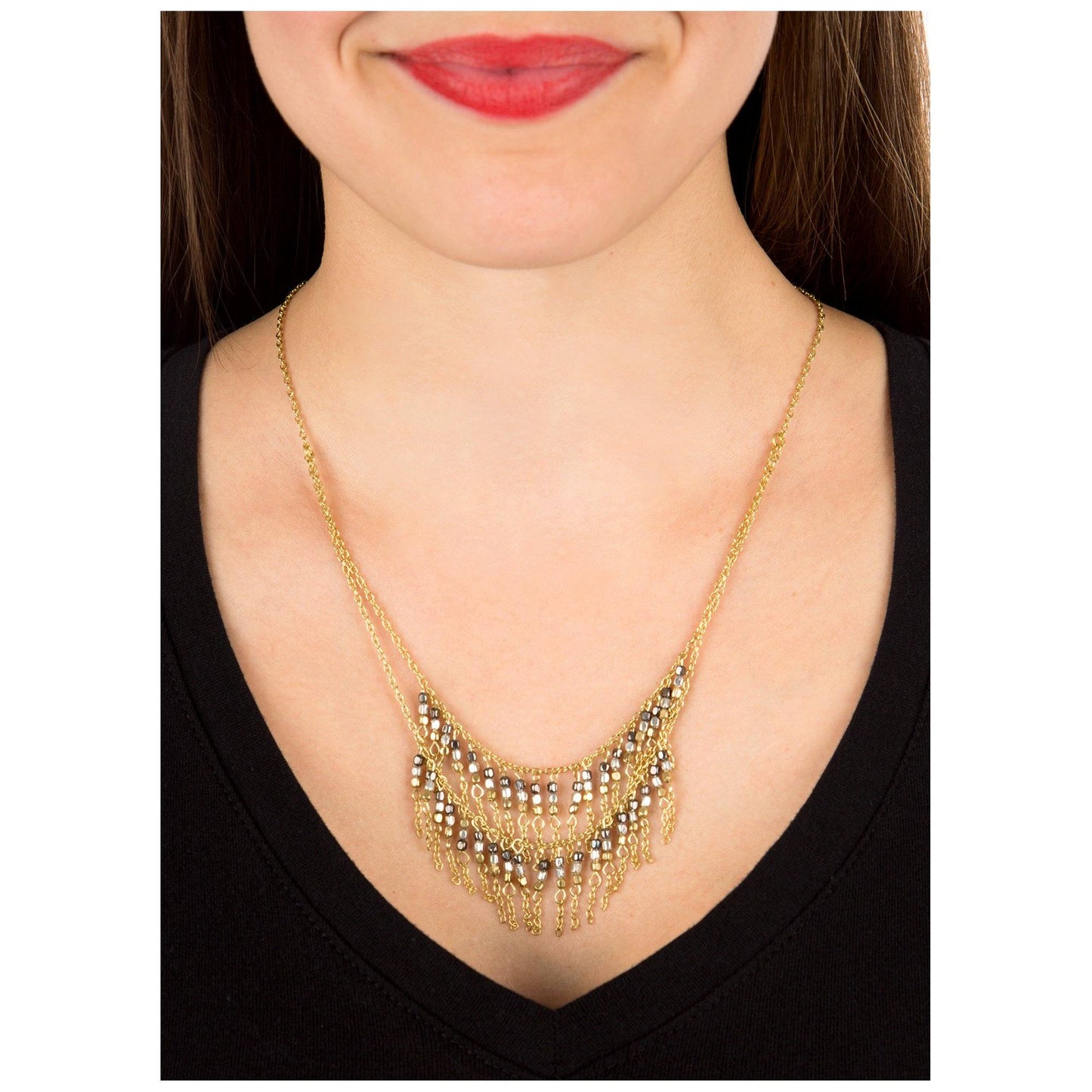 A metallic waterfall with layers of gold and silver-tones create a stunning piece of jewelry. This handmade necklace brings a beautifully beaded design to formal and casual styles.