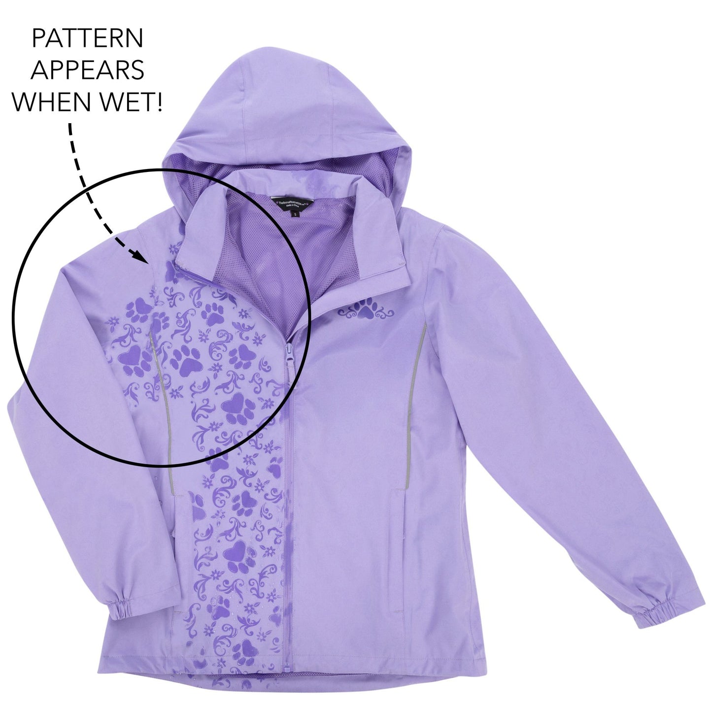 Simple when dry, simply magical when wet! This lightweight, pastel rain shell is made with special fabric that that has a hidden paw pattern revealed by the rain. Drizzly gray days now have a little brightness with this paw-printed design that disappears as the jacket dries.