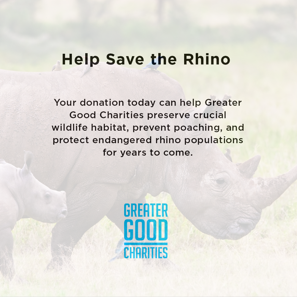You can help us protect rhinos. With your support, Greater Good Charities can work to halt deforestation, protect critical habitat, and put an end to poaching.