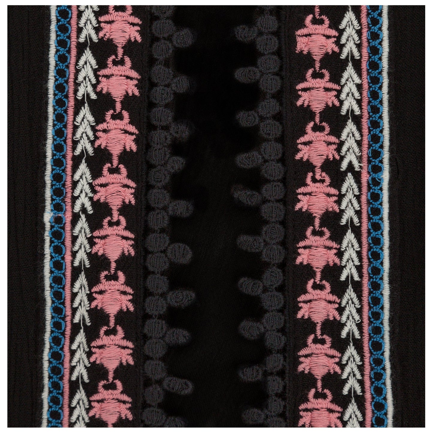An alluring top to finish off your ensemble, this beautiful black layer is sure to intrigue. Sheer, lightweight fabric is highlighted with embroidered stripes of pink, mint-green, and blue down the front and sleeve hems. Proof a light touch can easily transform your whole look!