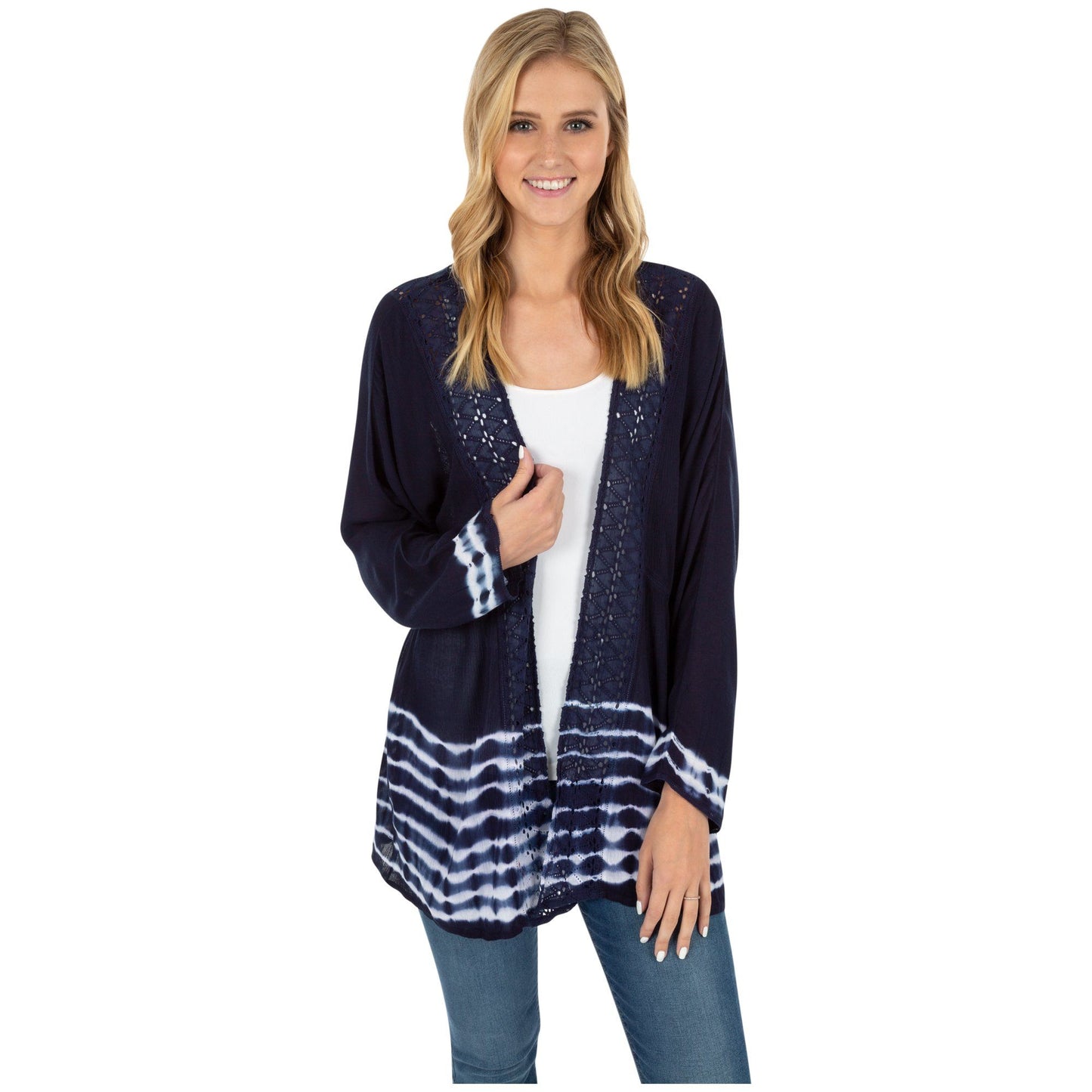 Gorgeous lace details throughout its design add sophistication to this brilliant navy-blue piece! Ideal for warm weather, this light layer is great for travel, and the white ripples set against the navy fabric add depth to this truly versatile topper.