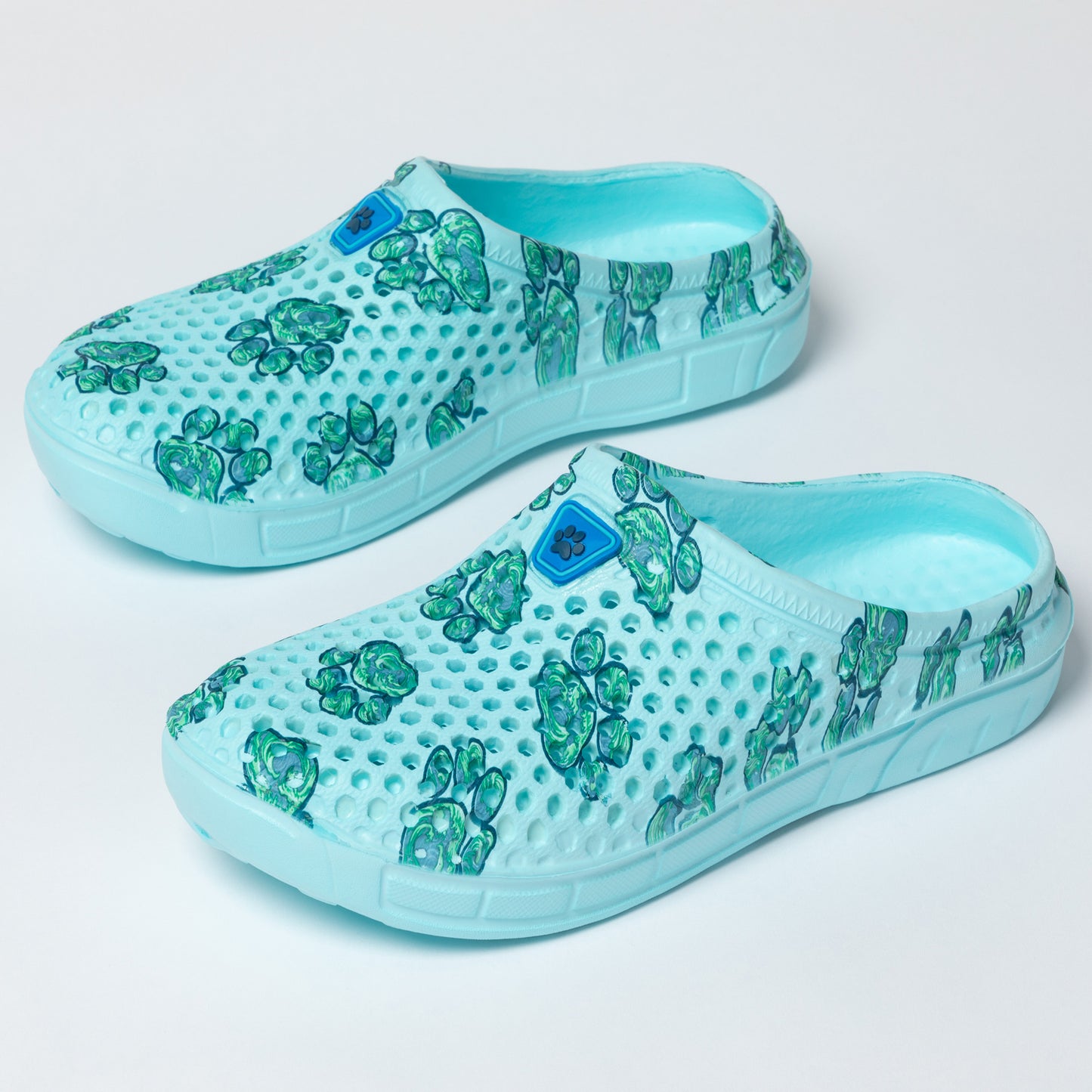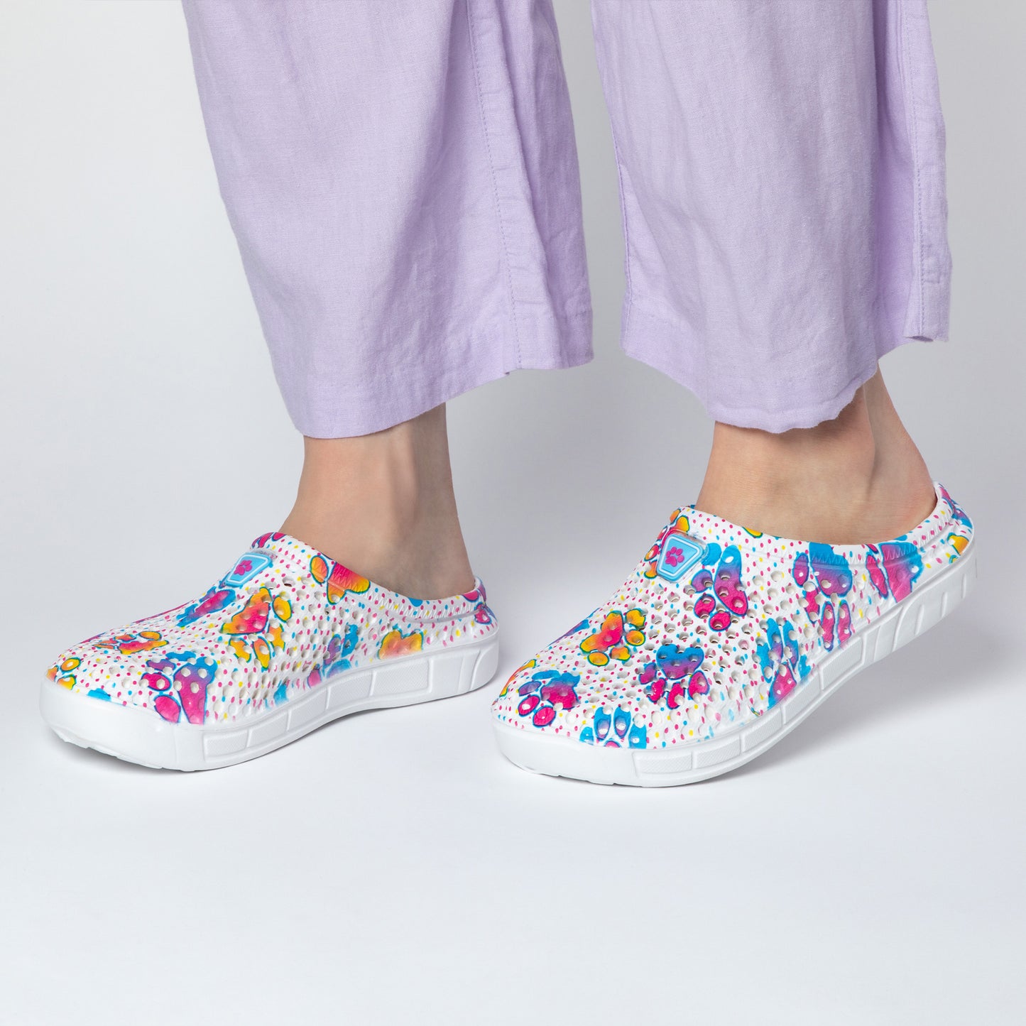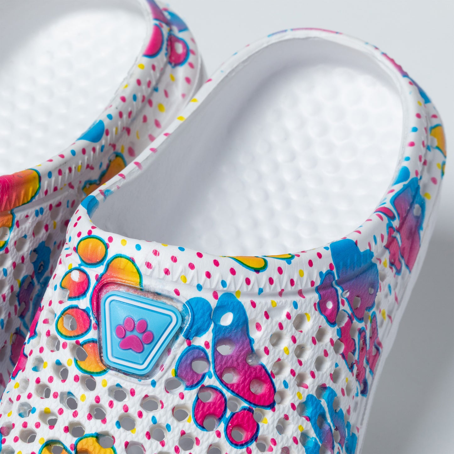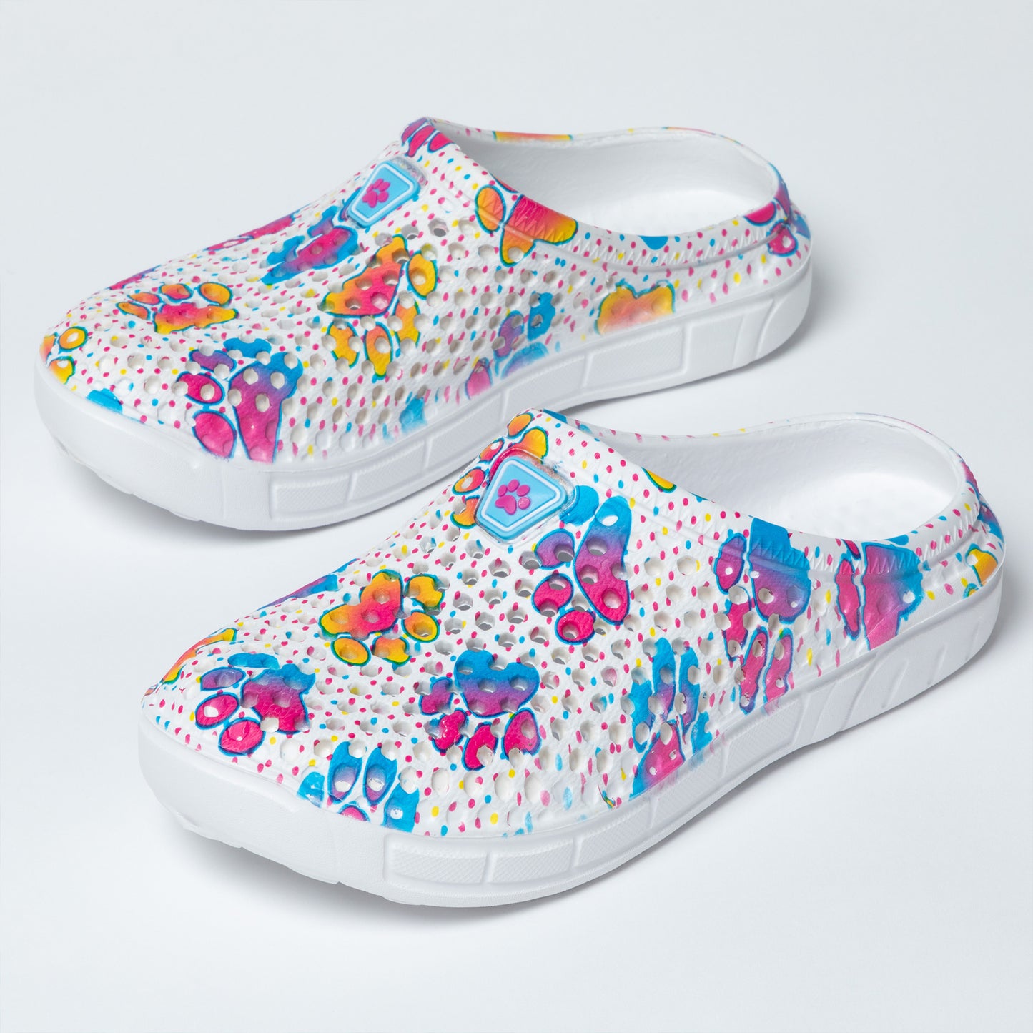Effortless appeal with a side of animal advocacy! This charming pastel pair of clog shoes is patterned in paw prints, and features hexagonal cutouts along the top for added breathability and comfort. The lightweight upper & outsole add comfort to these clog shoes, while the bright designs bring fun fashion!