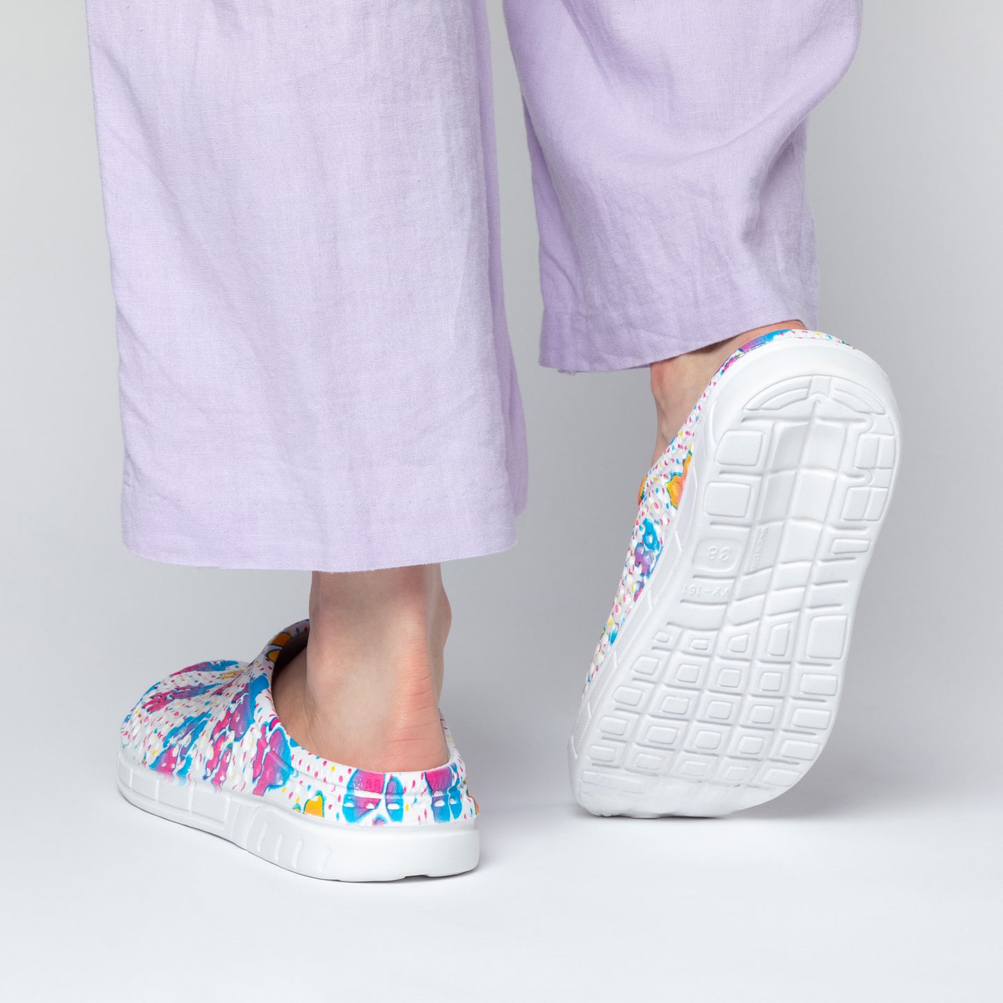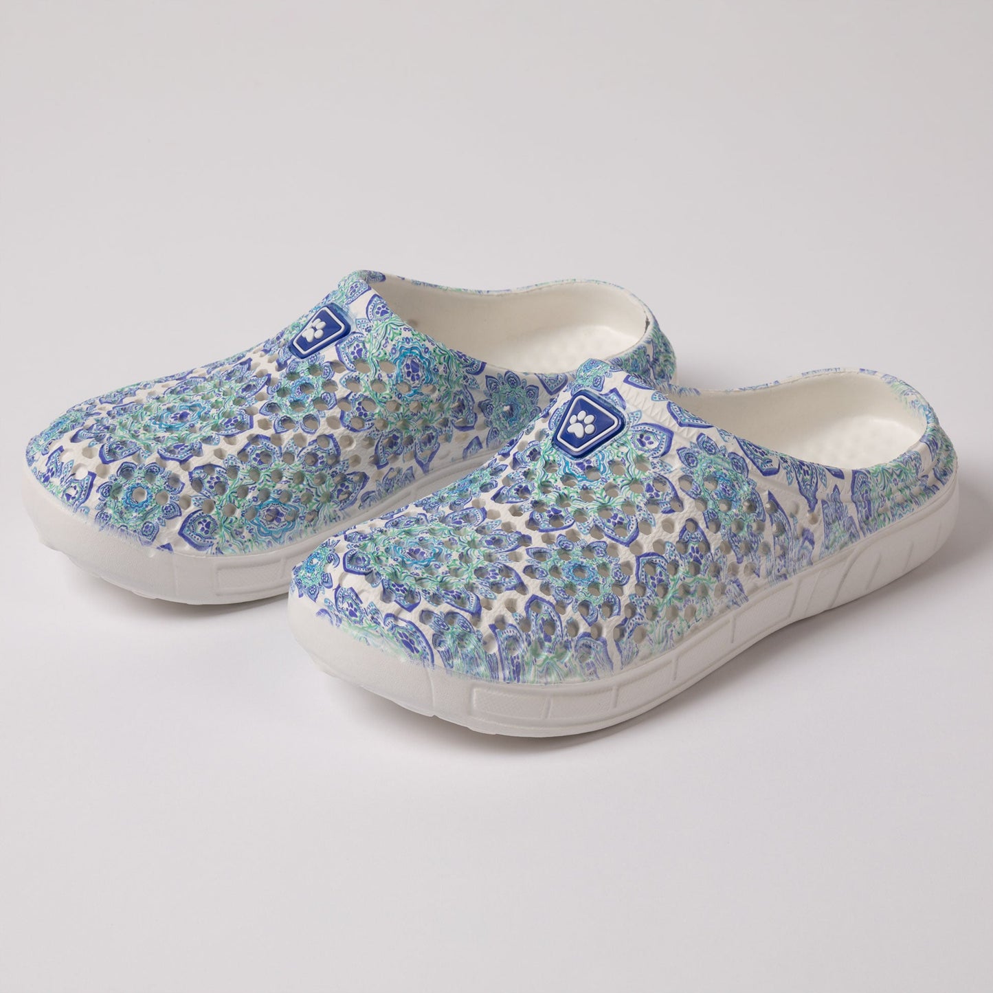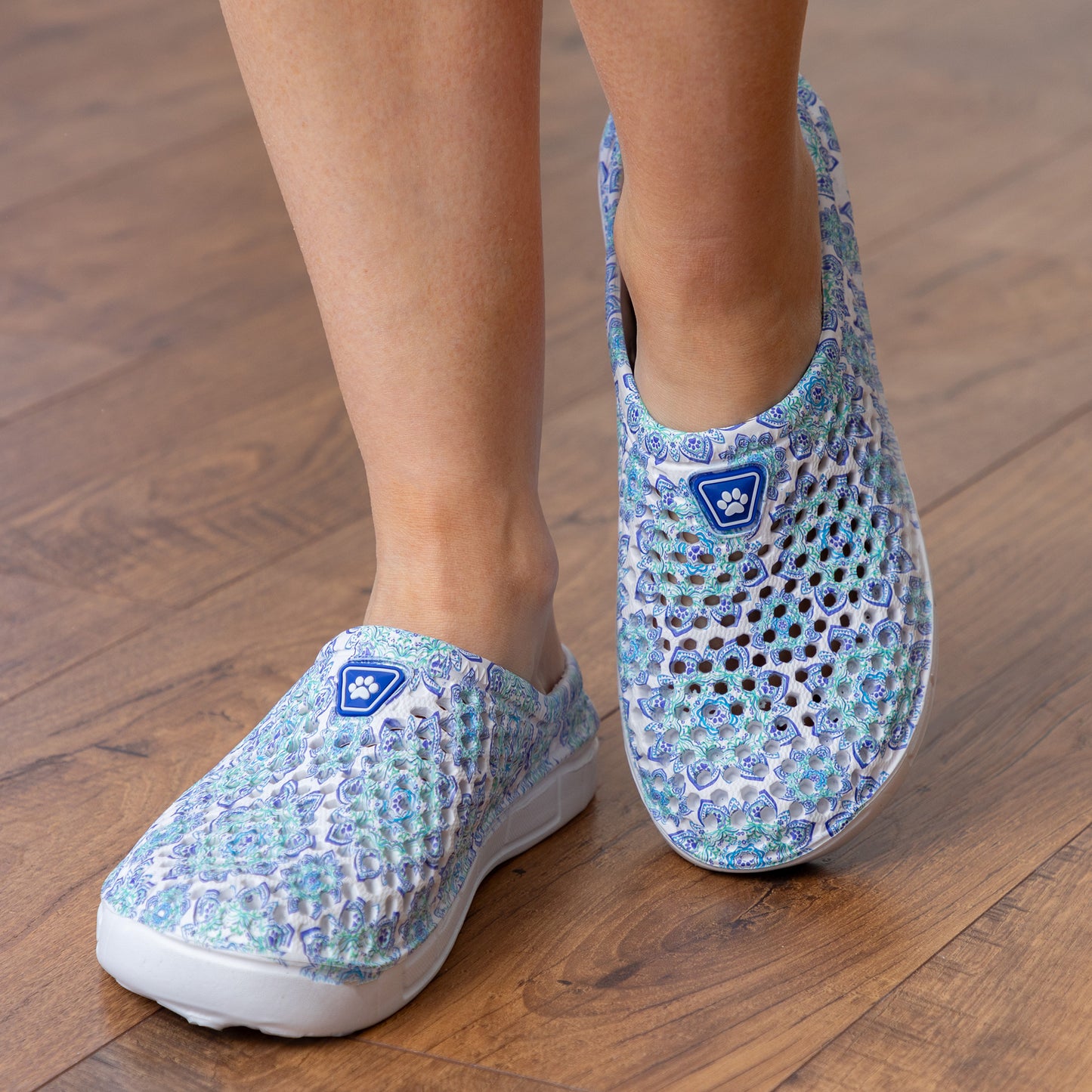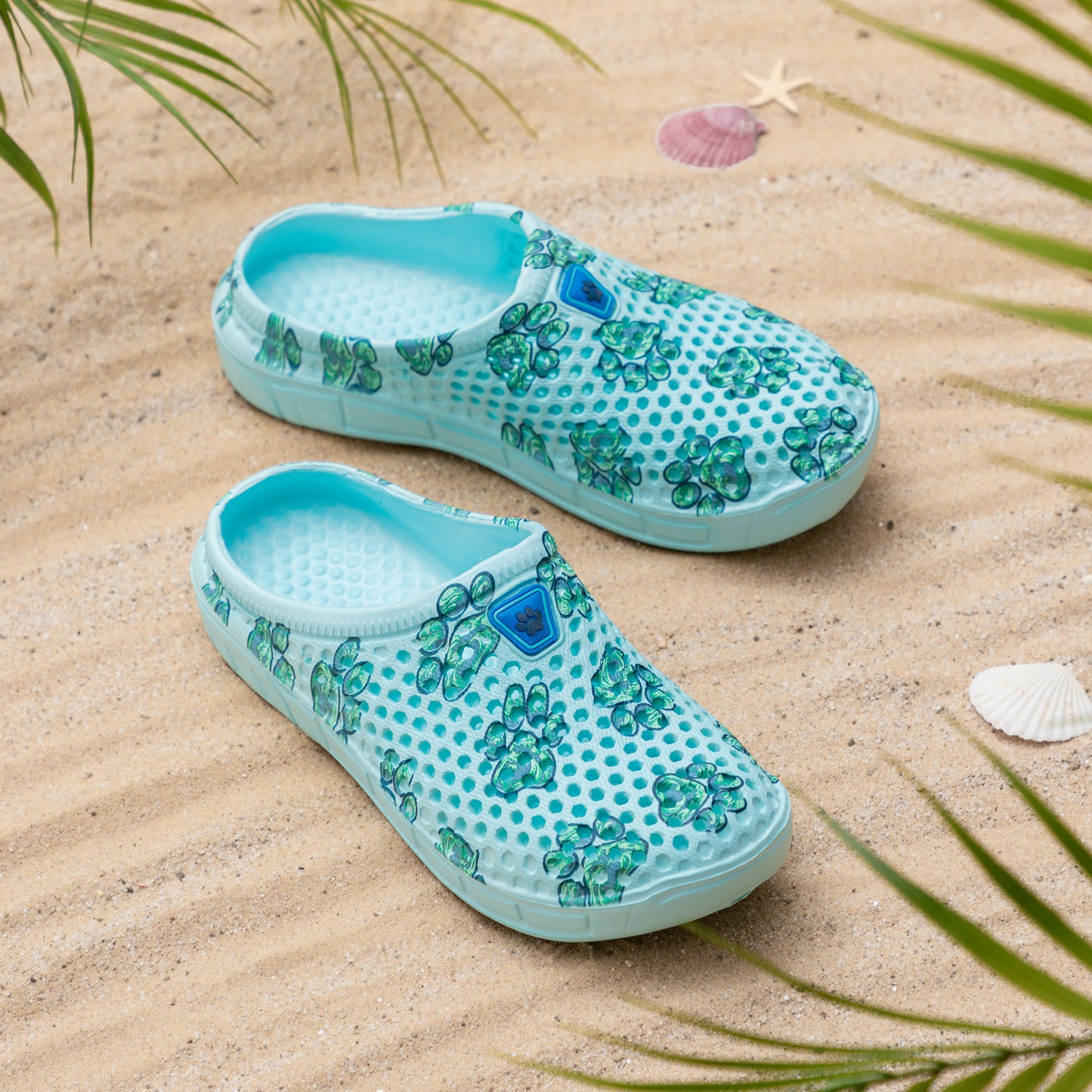 Effortless appeal with a side of animal advocacy! This charming pastel pair of clog shoes is patterned in paw prints, and features hexagonal cutouts along the top for added breathability and comfort. The lightweight upper & outsole add comfort to these clog shoes, while the bright designs bring fun fashion!
