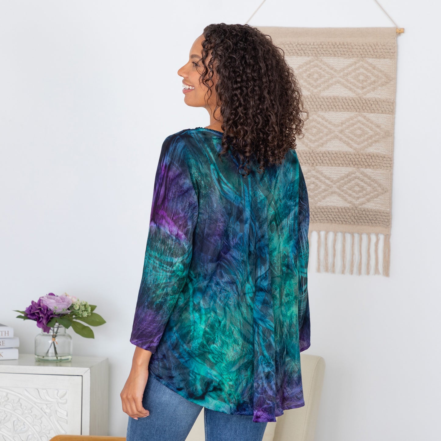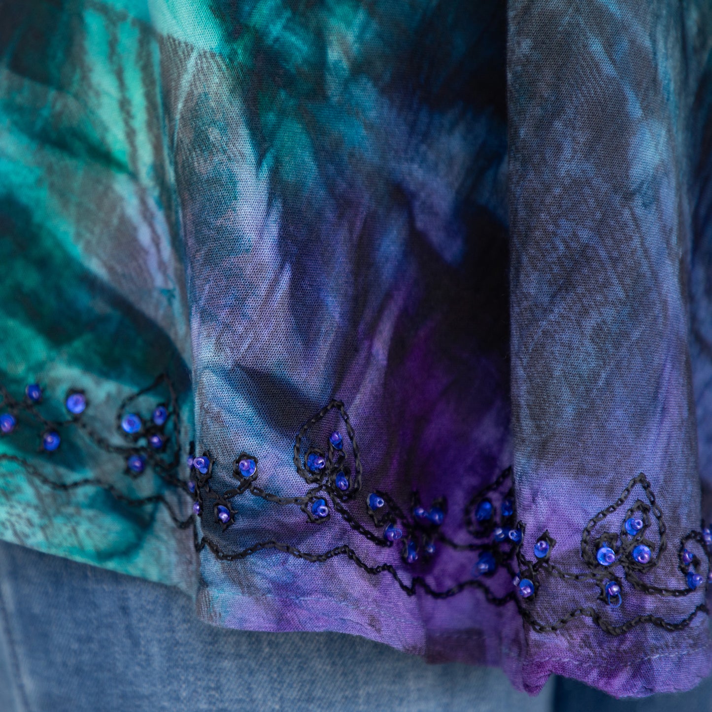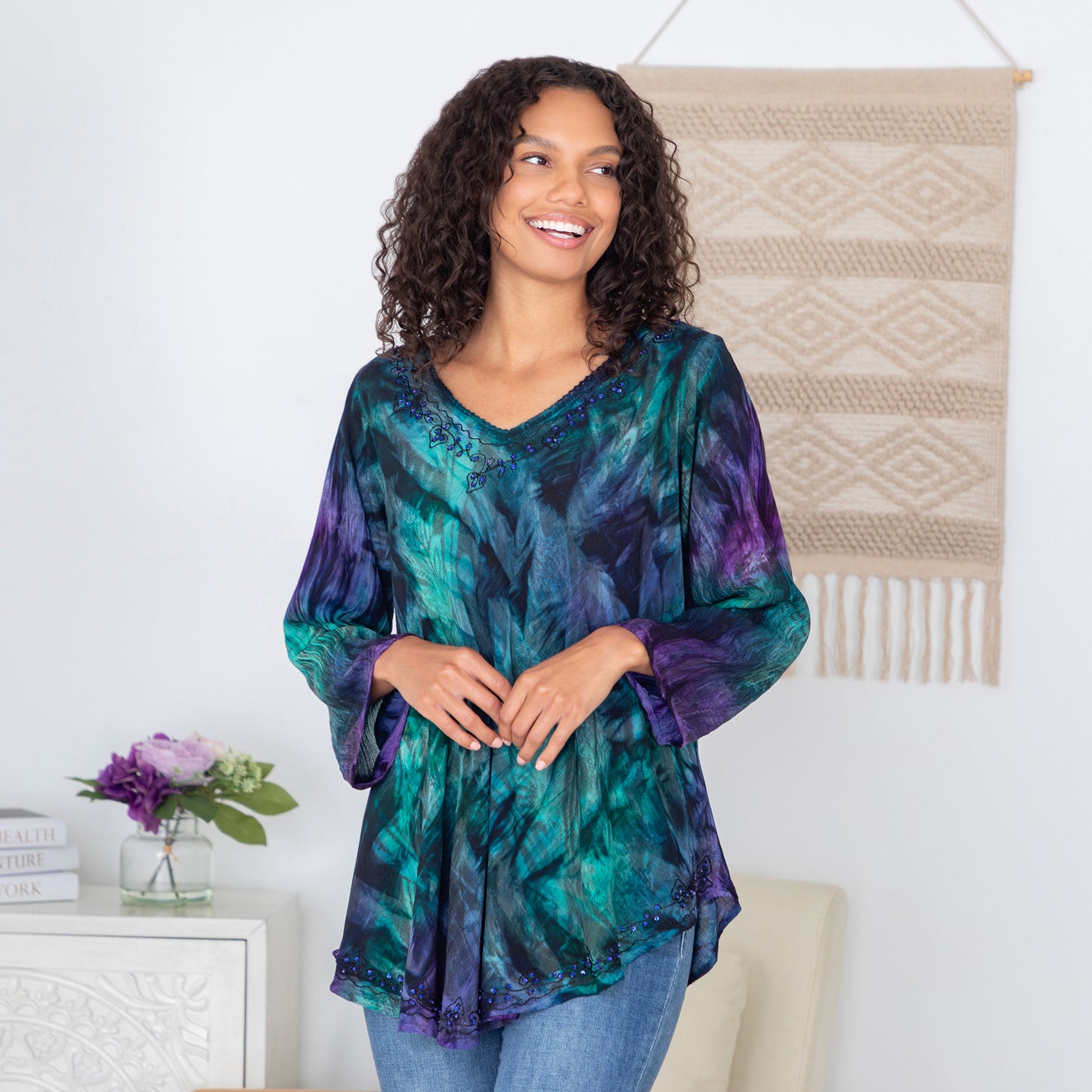 Dramatic gem-tones and dazzling details encourage you to fan your feathers in this flowy long sleeve tunic! Patterned in subtle plumage and finished with a stunning, beaded asymmetrical hem.