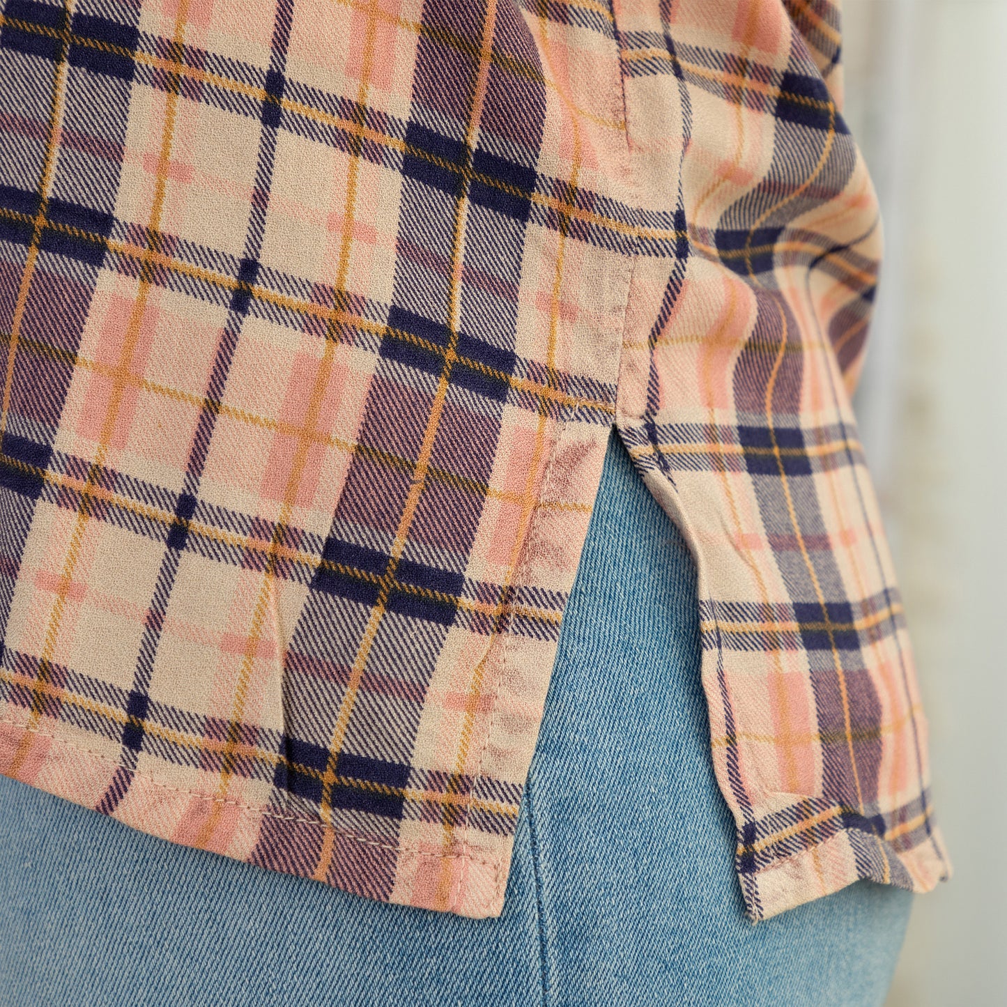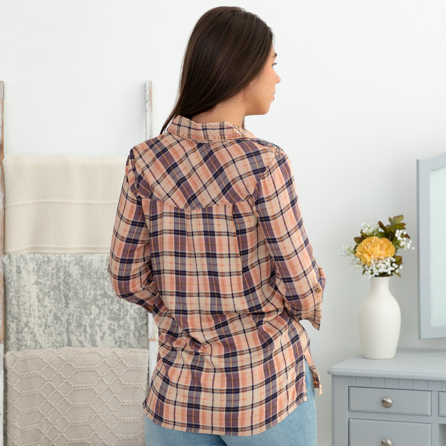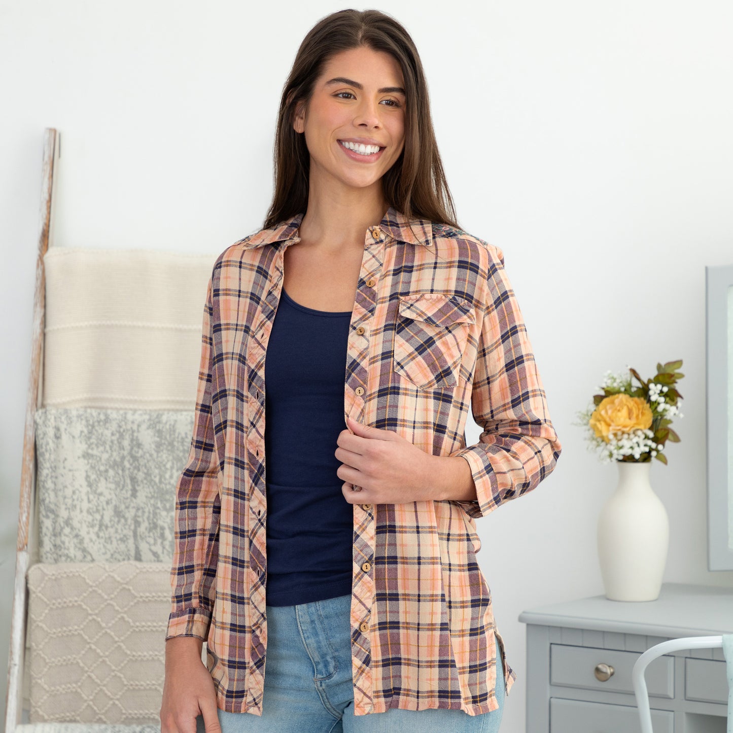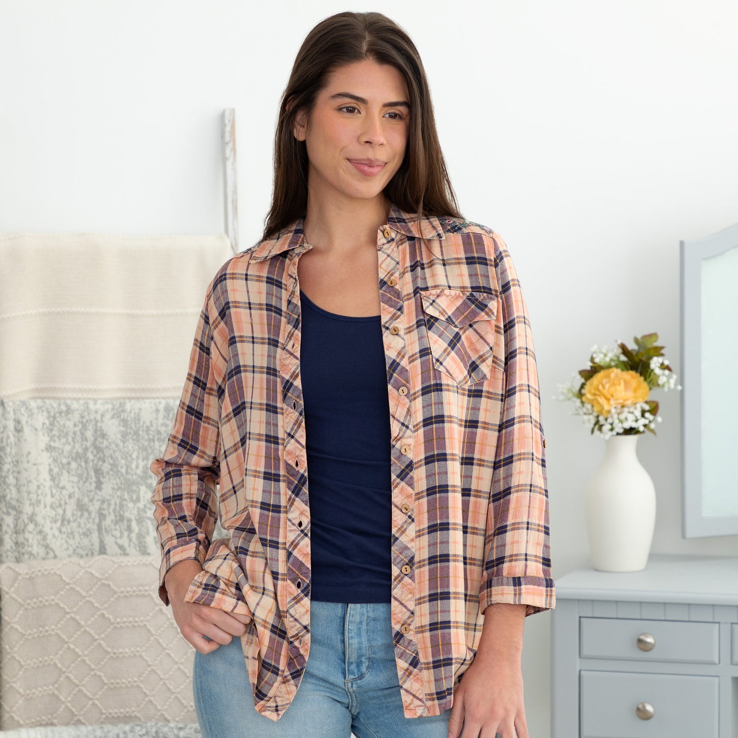 A beautiful blend of warm and cool colors weave through this soft, plaid button up shirt! Balancing the casual rugged look of a plaid button up is the charming, feminine detailing along the shoulders -- embroidered flowers with a few brilliant mirror sequins. Topped with roll-up three quarter sleeves and a front breast pocket, making it your new favorite go-to shirt!