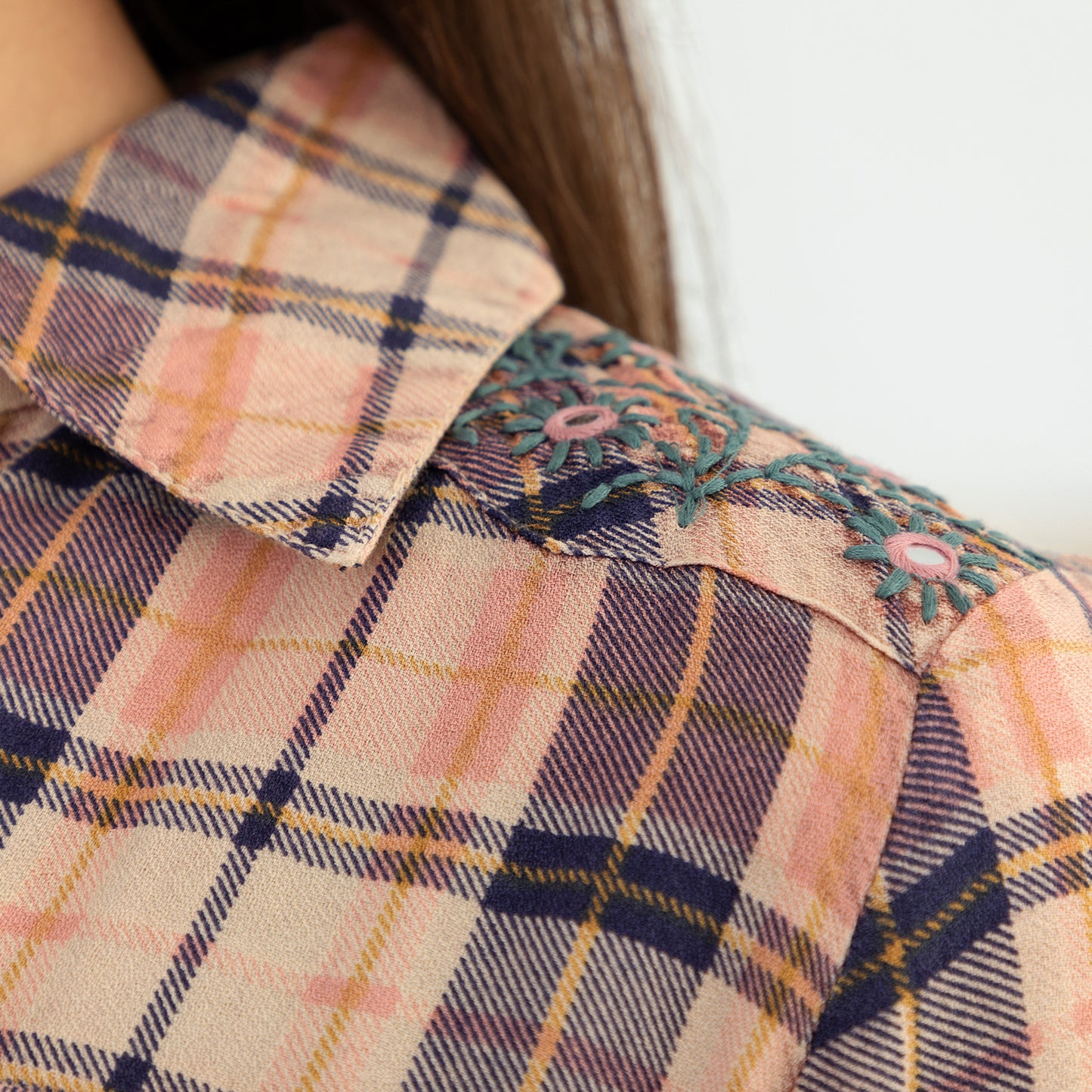 Floral Embroidery Plaid Button Up Shirt