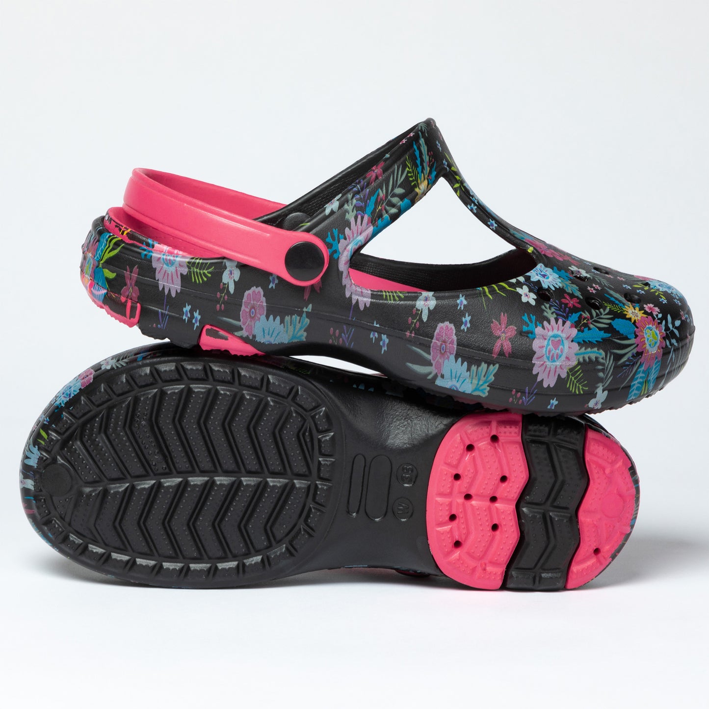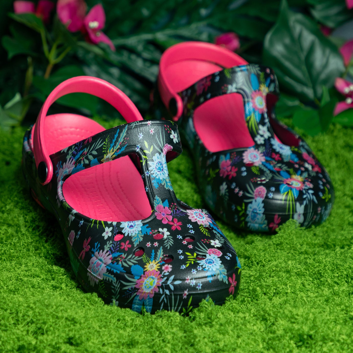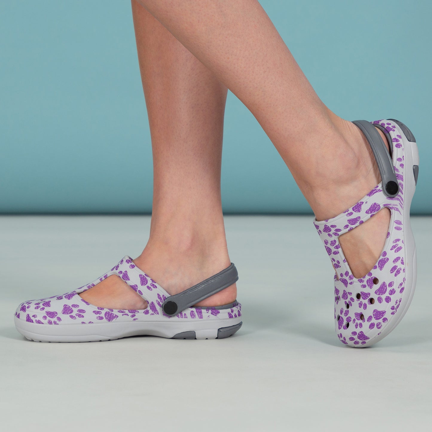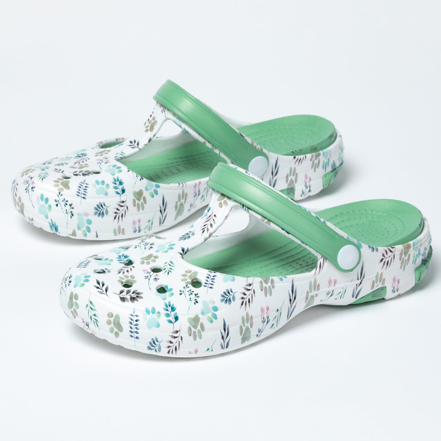 Cute with the unmistakeable mary jane design, this pair of lightweight clogs go flawlessly with the activities you and your furry friend have planned for the day! Patterned in paws of varying colors, or tropical design with butterflies or dragonflies, this easy pair of mary jane shoes features a textured insole and matching strap that can be worn over the top or behind the heel. Versatility and comfort combined!