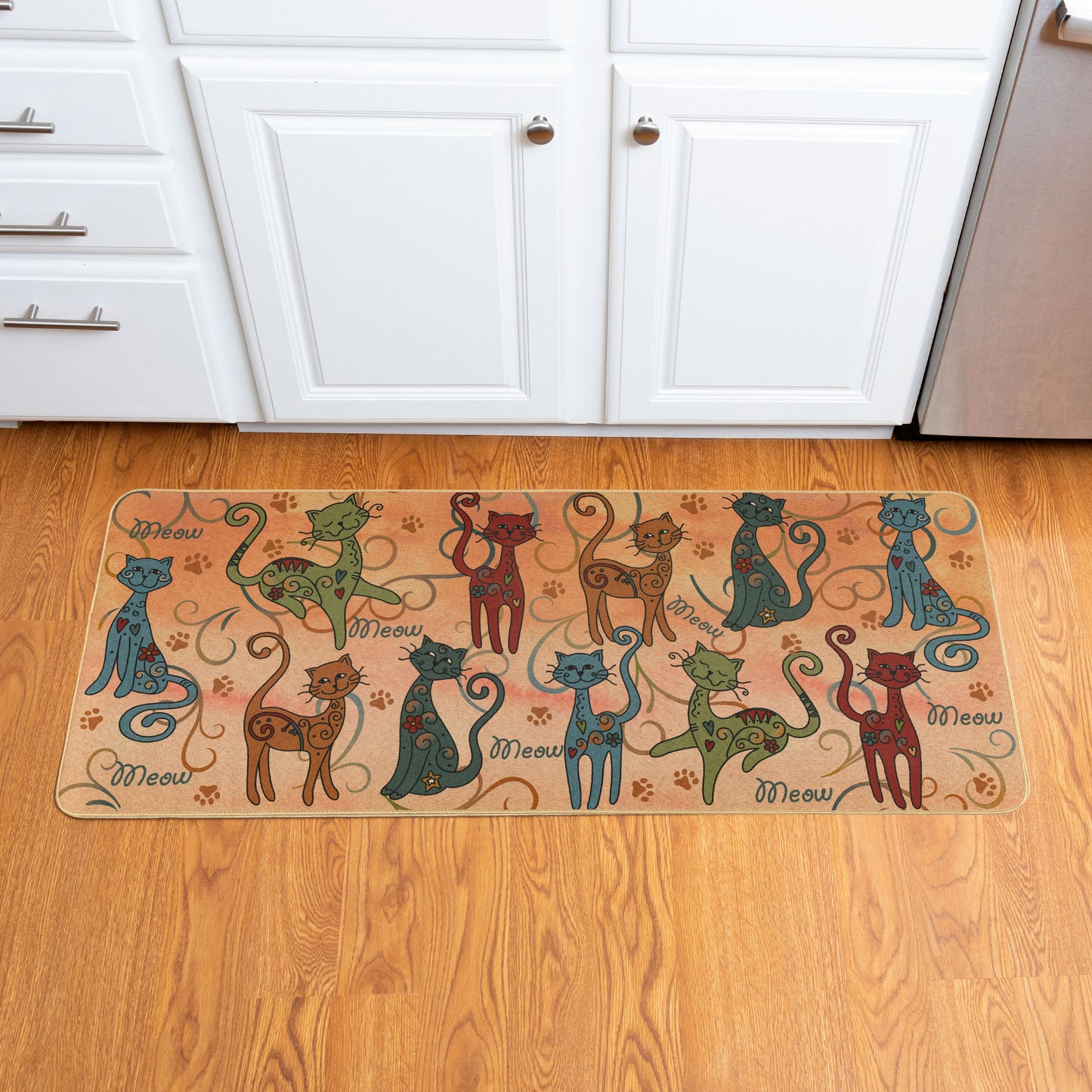I kept eyeing the kitty themed mat and finally purchased it.Vibrant colors, comfortable to stand on. The mat stays put on my tile floor, no slipping. I put the mat in front of my washer and dryer.Well made and so cute!!