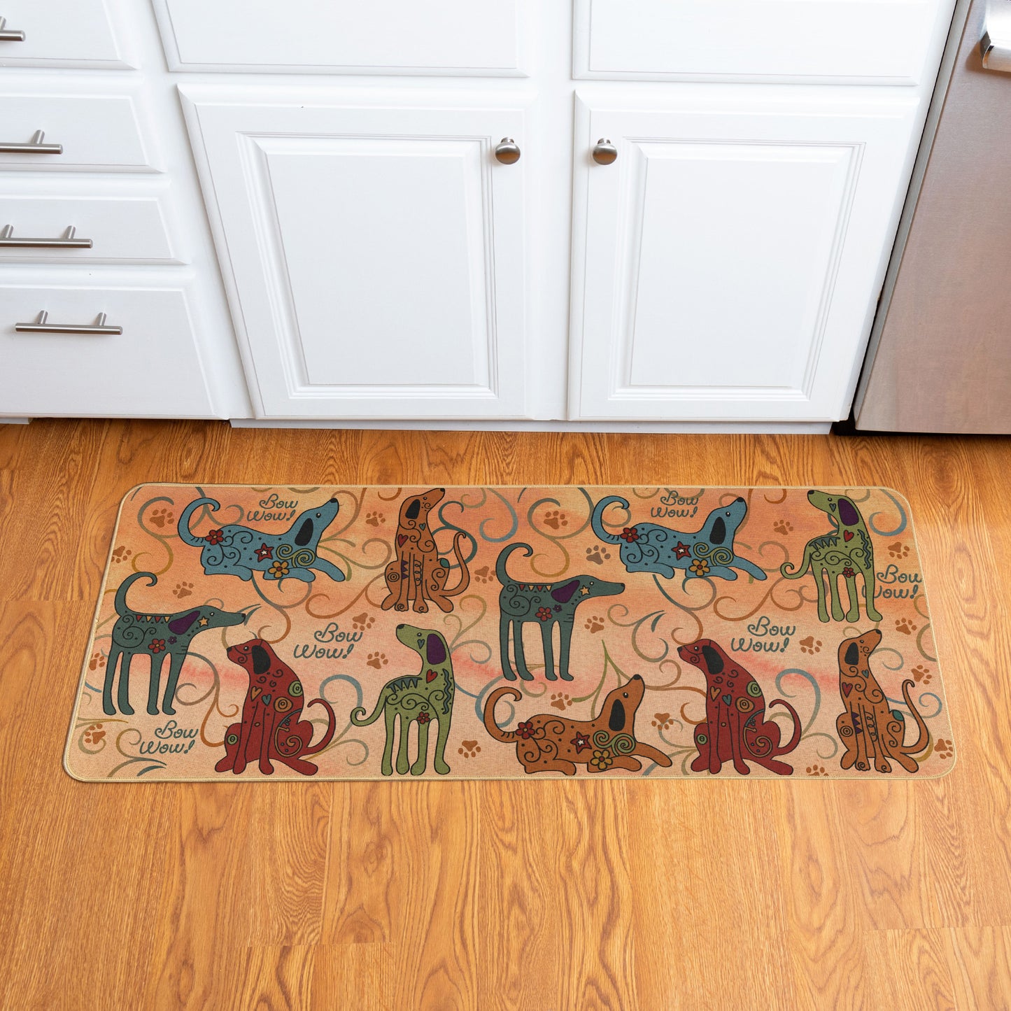 Your favorite furry friends lead the way on this colorful, cushioned floor runner! Made with a natural rubber backing to prevent slipping and a durable polyester top, this low-maintenance floor mat works perfectly in your animal-loving space. Paw-printed whimsy with a functional design!