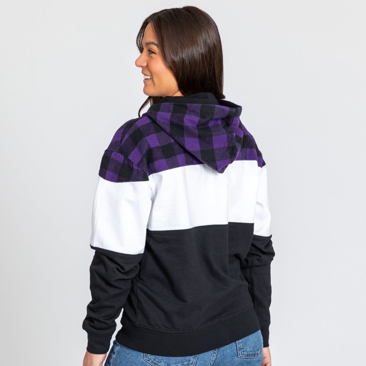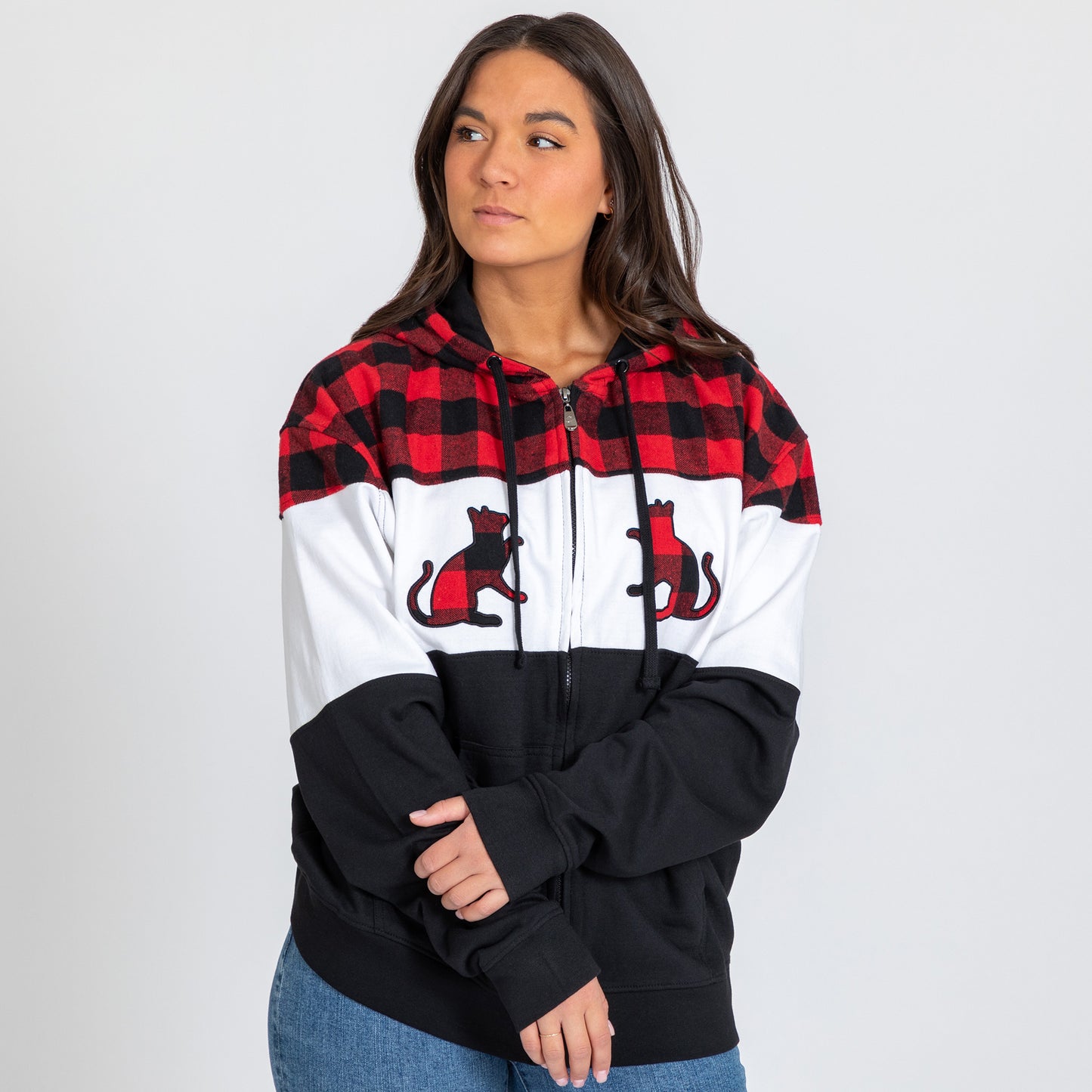 Cooler weather calls for a cozy flannel topped hooded sweatshirt, complete with embroidered paw print, cat, or dog patches inspired by your best furry friend! Made with a lined drawstring hood and cozy front pockets, this white, black, and red or purple plaid print is your go-to piece for chillier days.