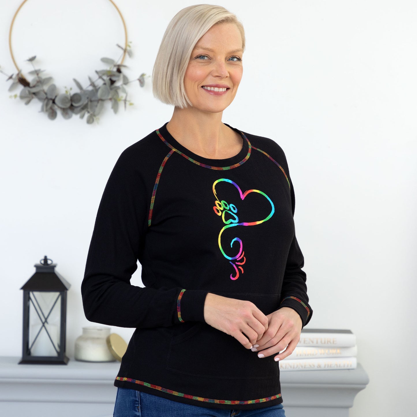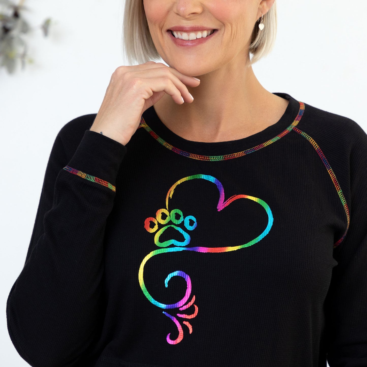Made from a super soft cotton-poly blend with brilliant rainbow colors in the contrast stitching, this cozy thermal top boasts comfort and animal allegiance. Topped with a vibrant paw print and swirling heart rainbow foil design and a front pocket perfect for hiding treats for your four-legged friend!