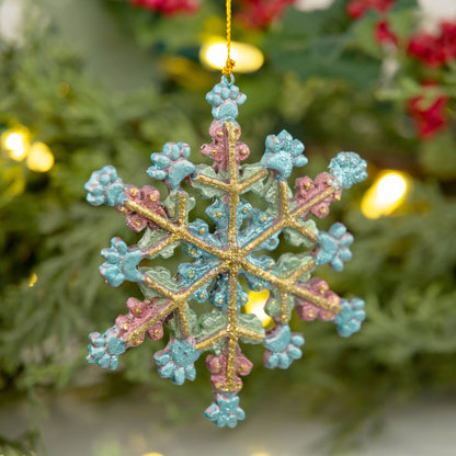 A sparkling snowflake ornament shines brilliantly hanging from your lit-up tree! Featuring paw prints along the edges, each colorful ornament is a sweet, shining symbol of your love for animals.