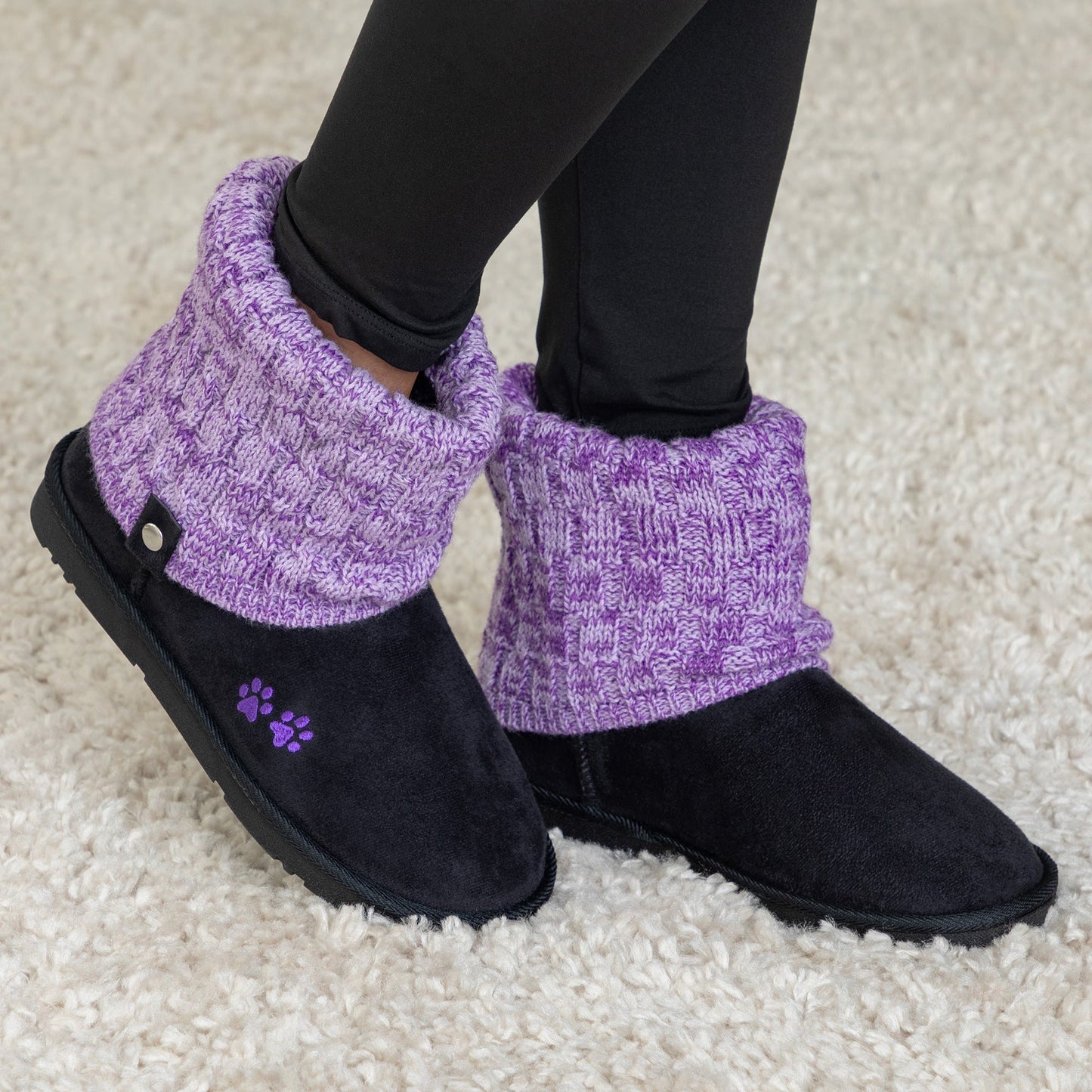 These mid rise knit boots are as cute as they are cozy! A microfiber upper surrounds your feet with a warm faux fur lining the inside, topped off with a knit outer layer with a tiny snap at the bottom. A pair of embroidered paws on the foot of the boot displays the cause that is near and dear to your heart.