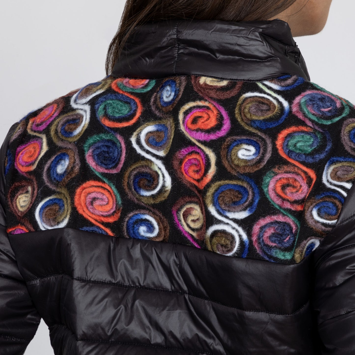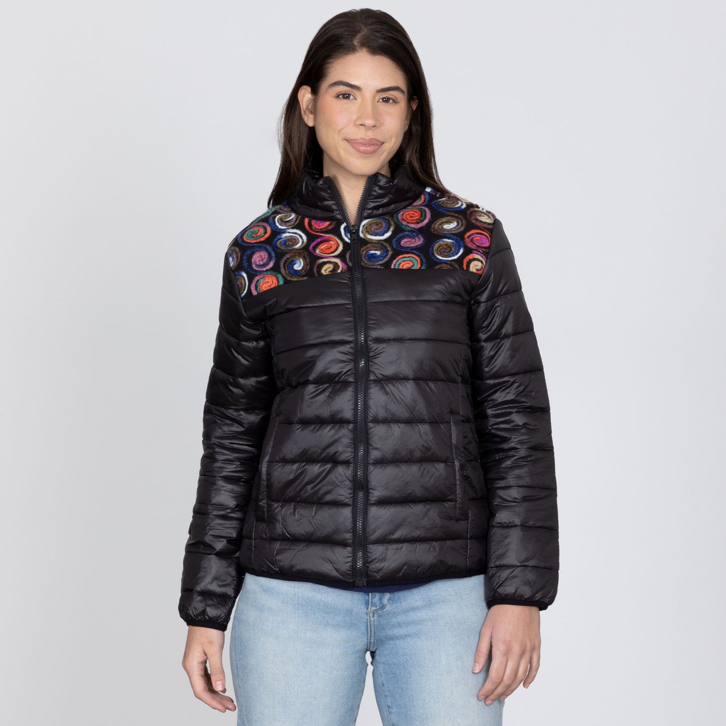 Adventure out in the elements awaits and you'll be ready with this soft, super-insulated jacket. Featuring bright embroidered swirls along the upper yoke, which stands out beautifully on the classic black body and sleeves, this cold-weather favorite helps you stand out even on the coldest days!