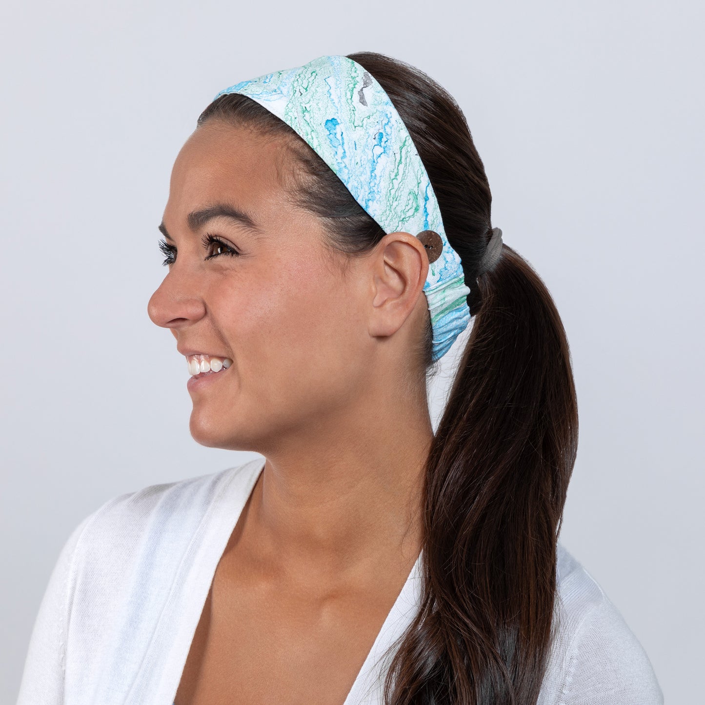Each double-layered face mask is patterned in swirling marbled fabric and topped with elastic, adjustable ear loops made to stay put! Made with a filter pocket, cotton fabric on the inside layer, and textured rayon fabric on the outer layer. The headband is handmade from cotton, with elastic and topped with buttons on each end for looping a mask's ear loops through -- keeping your ears comfortable and reducing any irritation from wearing a mask for an extended time.