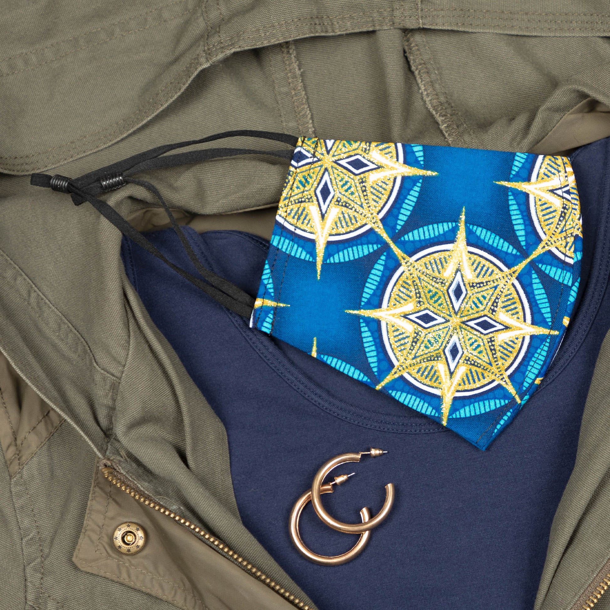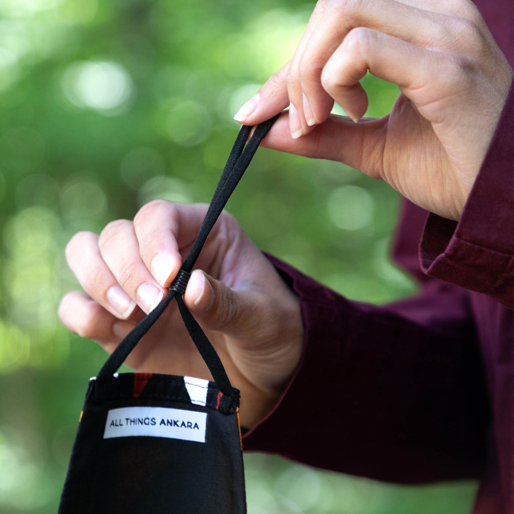 Each double-layered face mask is patterned in gorgeous Ankara African prints and topped with adjustable ear loops for the perfect fit! Handmade in the U.S.A. by designer Nikki Billie Jean, the creator and found of All Things Ankara. Complete with a filter pocket on the side, you can choose to use filters made from household items such as a tissue, a coffee filter, a dried unscented baby wipe -- or use with no filter at all.