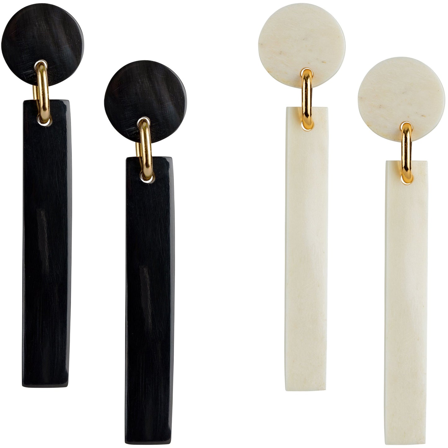 Gorgeously handmade from organic materials, this fair-trade pair is a sleek, simple accessory however you choose to wear it! With a post earring behind the circle, and small brass hoops attaching the lower bar to the earrings, this pair brings movement and versatility to your look.