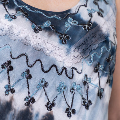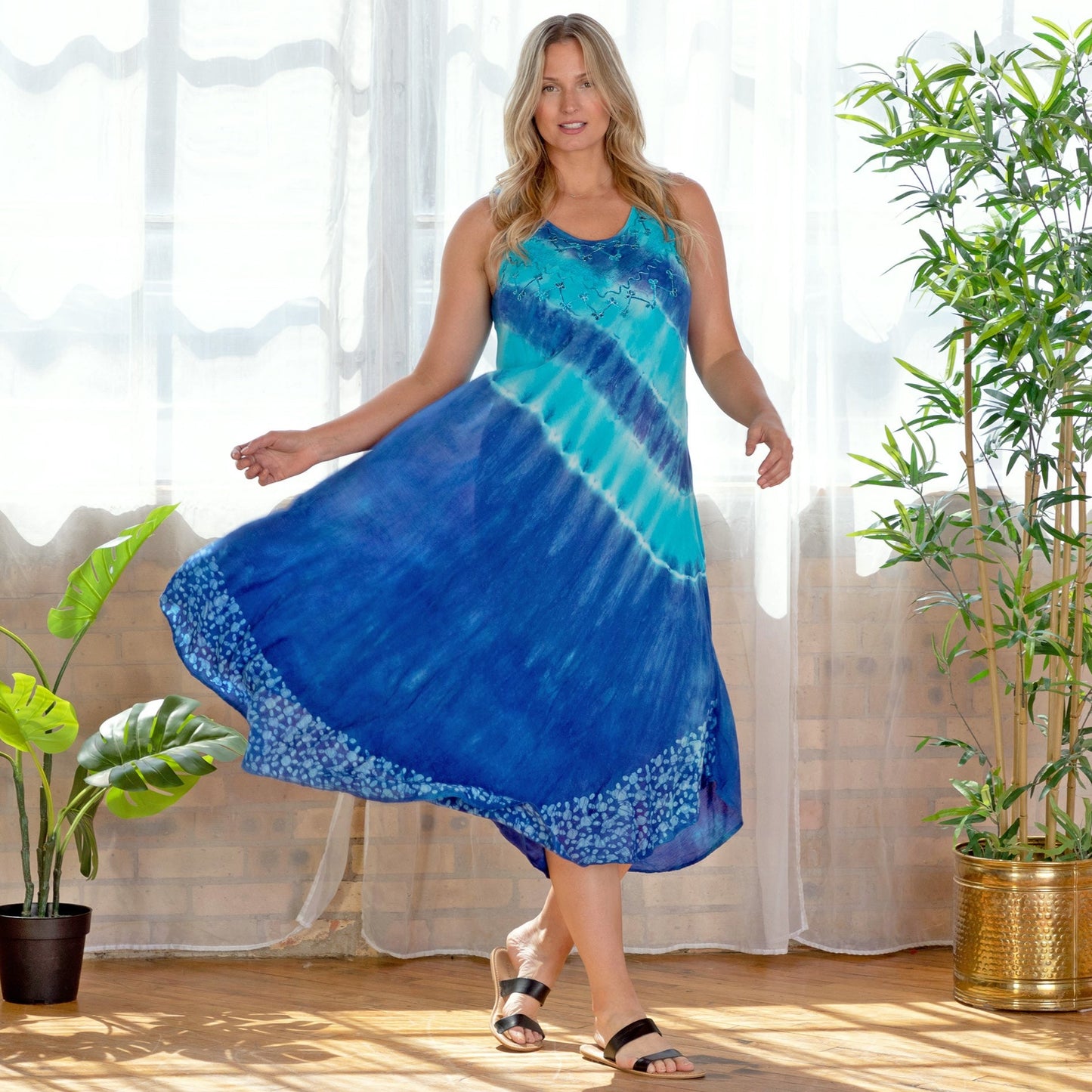 Tie-dyed with intensely rich colors, stripes, patterns along the front hem, and embroidery along the neckline, this sleeveless dress has it all. Made with a soft, easy-to-wear fabric that breathes, this piece is perfectly suited for all of your warm weather plans!
