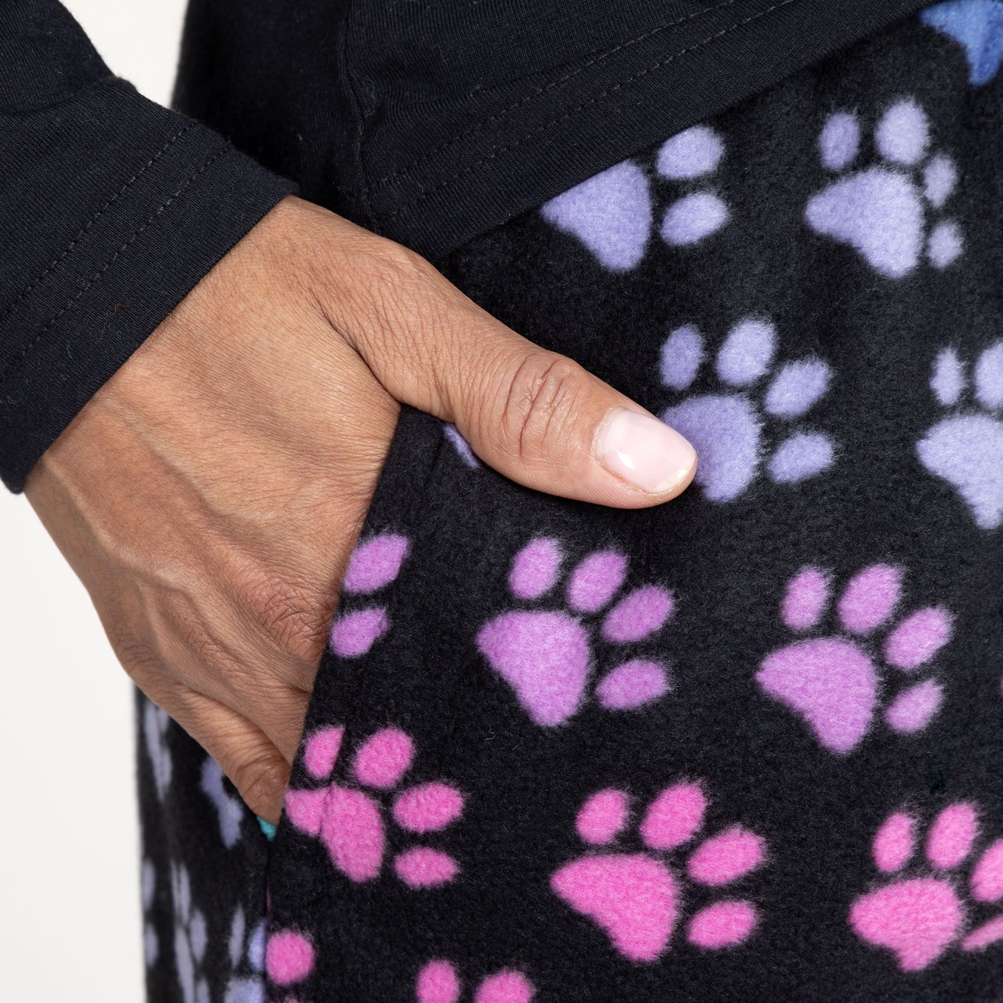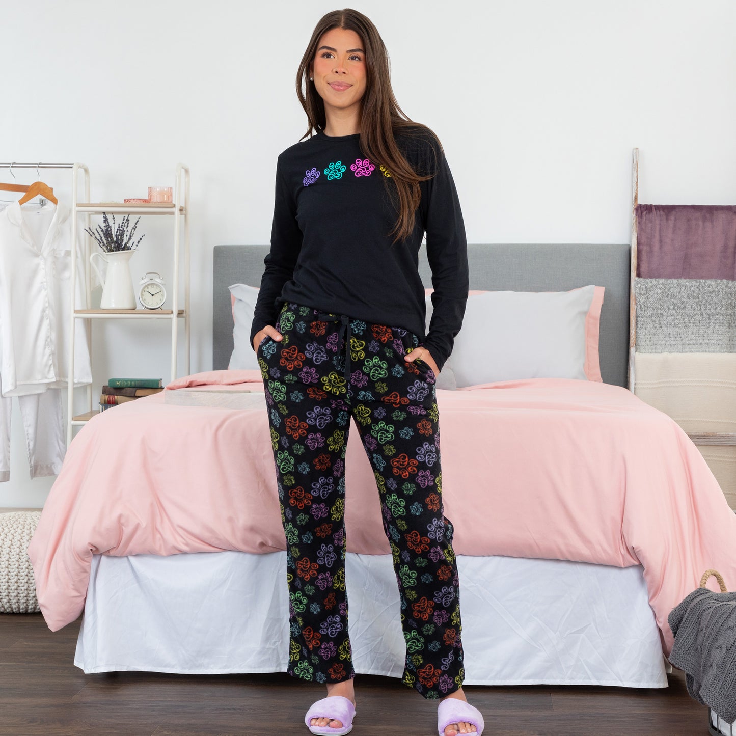 Technicolor paws pattern the pants and parade across the top of this women's pajama set! Featuring cozy soft fleece bottoms with an elastic waistband for the most comfortable fit, and a crew neck long sleeve top in black, which makes the rainbow paw prints pop in full color.