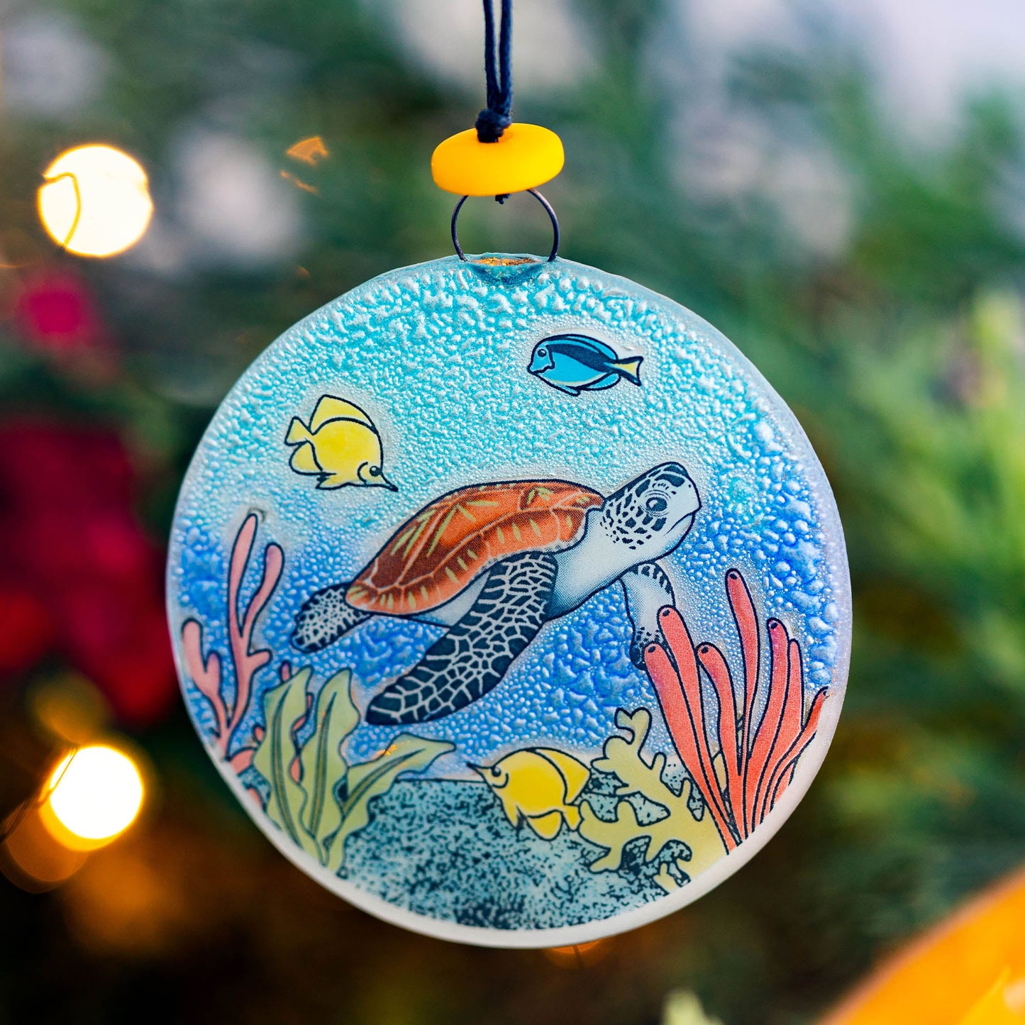 A colorful underwater scene to behold! Handcrafted from recycled glass with bubbles in the glass, and topped with fish, coral, and waves of blue water. This serenely swimming sea turtle makes for a fair-trade bit of decor to your Christmas tree!