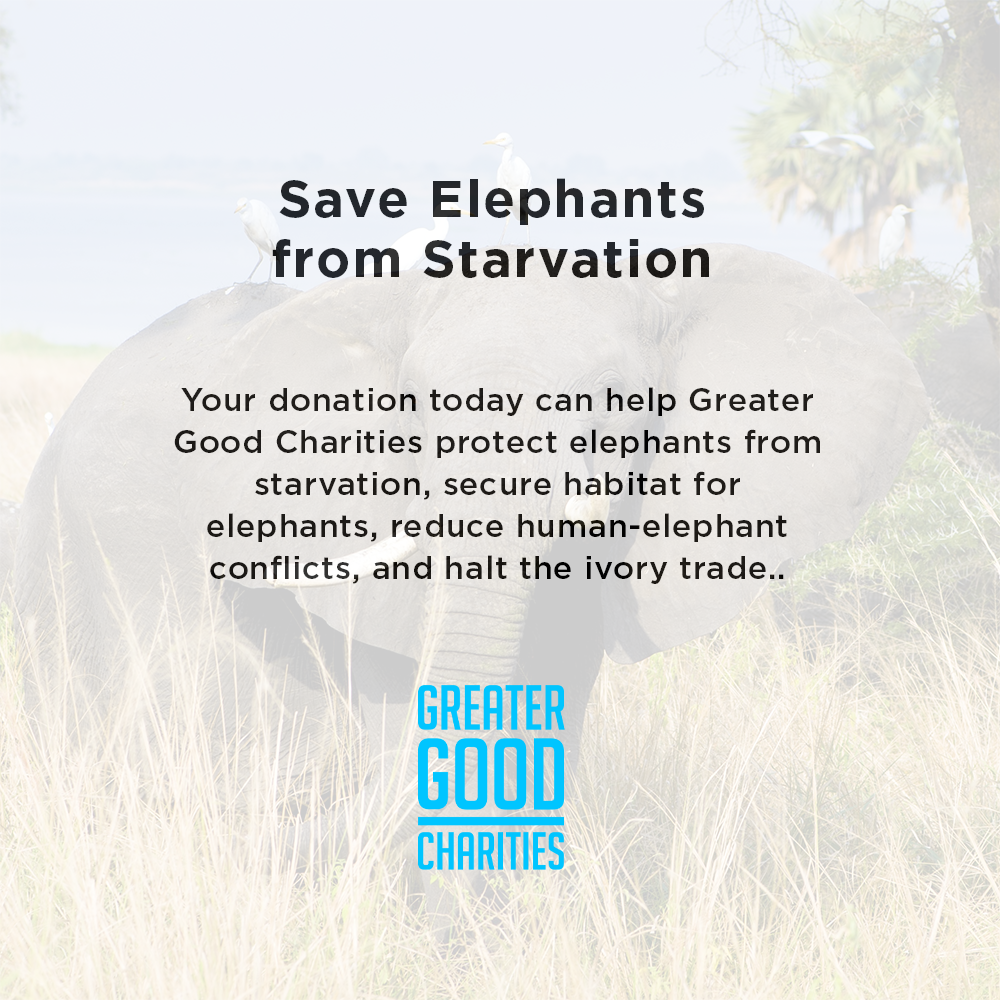 That’s why Greater Good Charities is committed to working with partners across the globe to save elephants from starvation, secure habitat for elephants, reduce human-elephant conflicts, and halt the ivory trade.