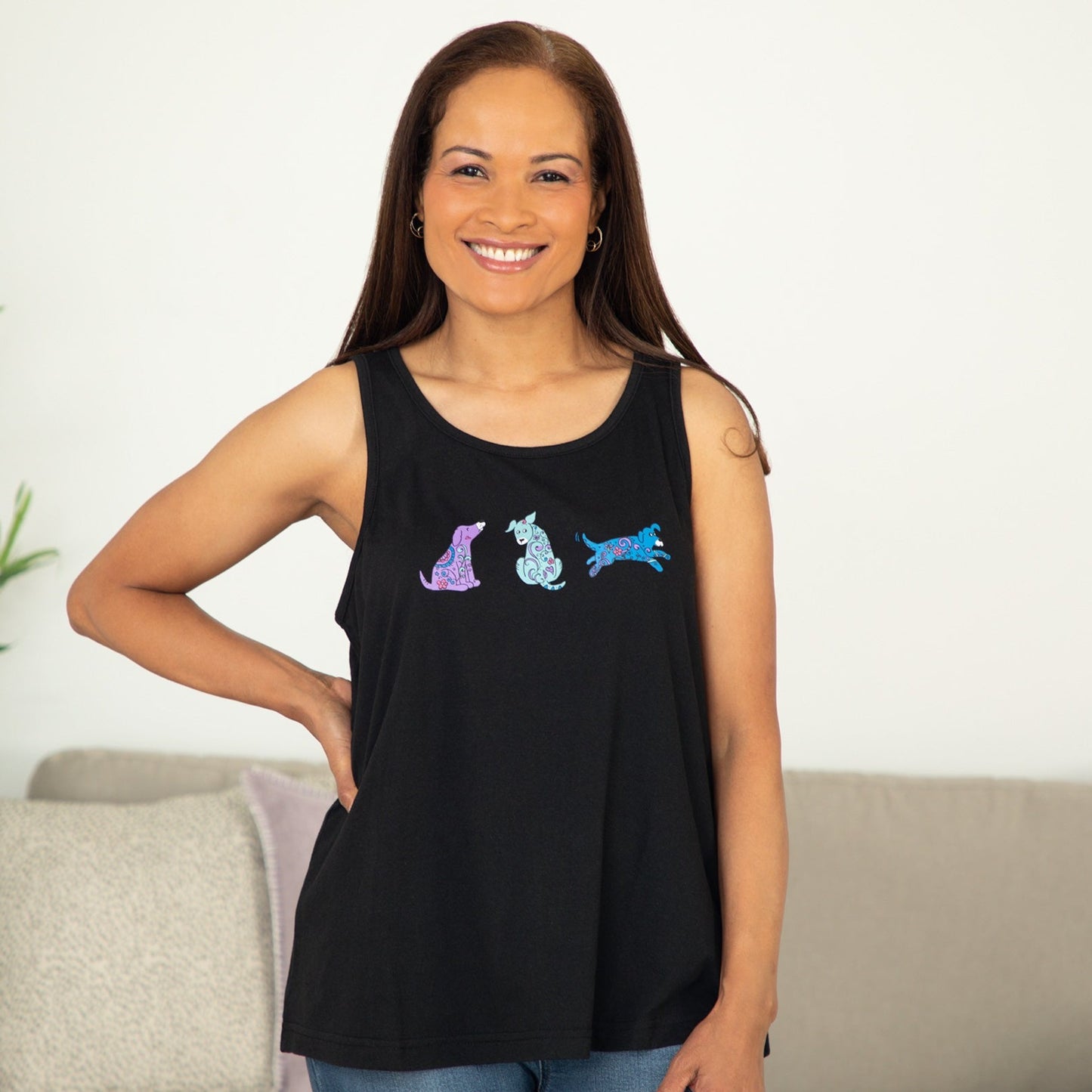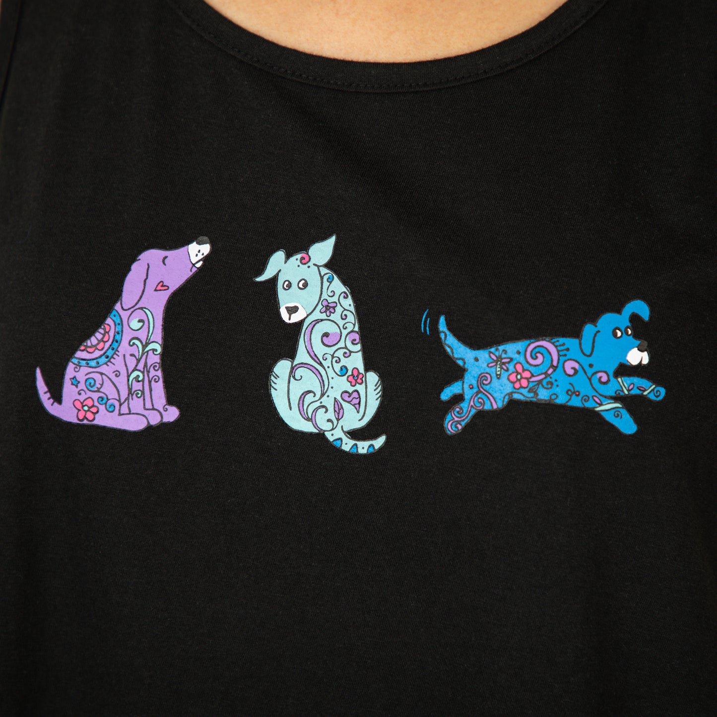 Celebrate your love of animals with a classic black scoop neck tank! Made with a comfortable cotton blend, and a colorful printed design featuring cats or dogs on the front.