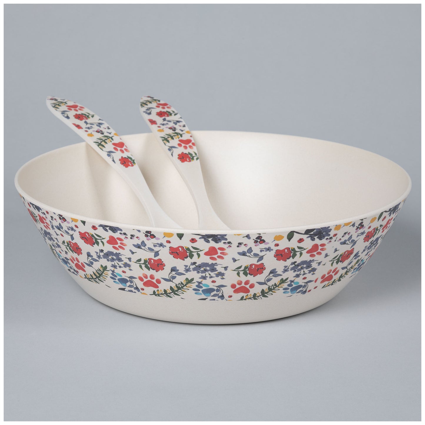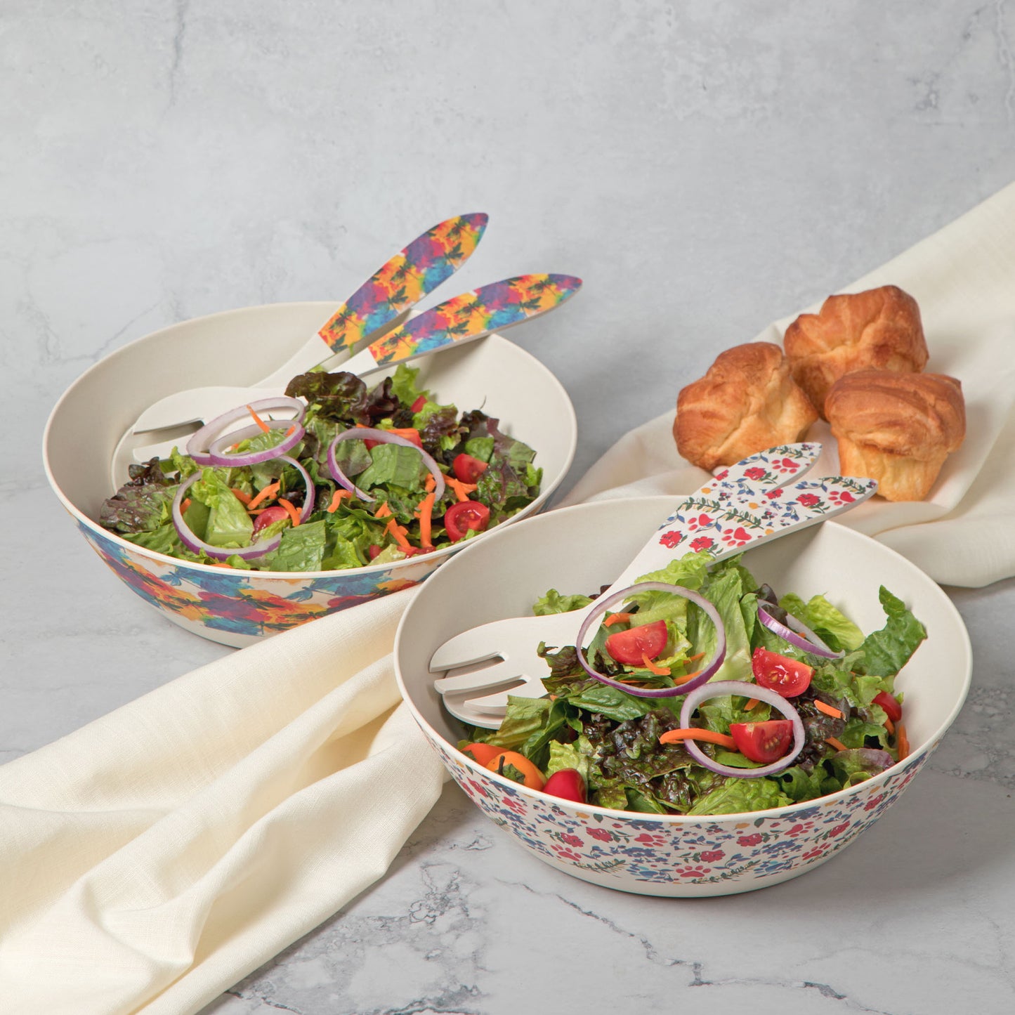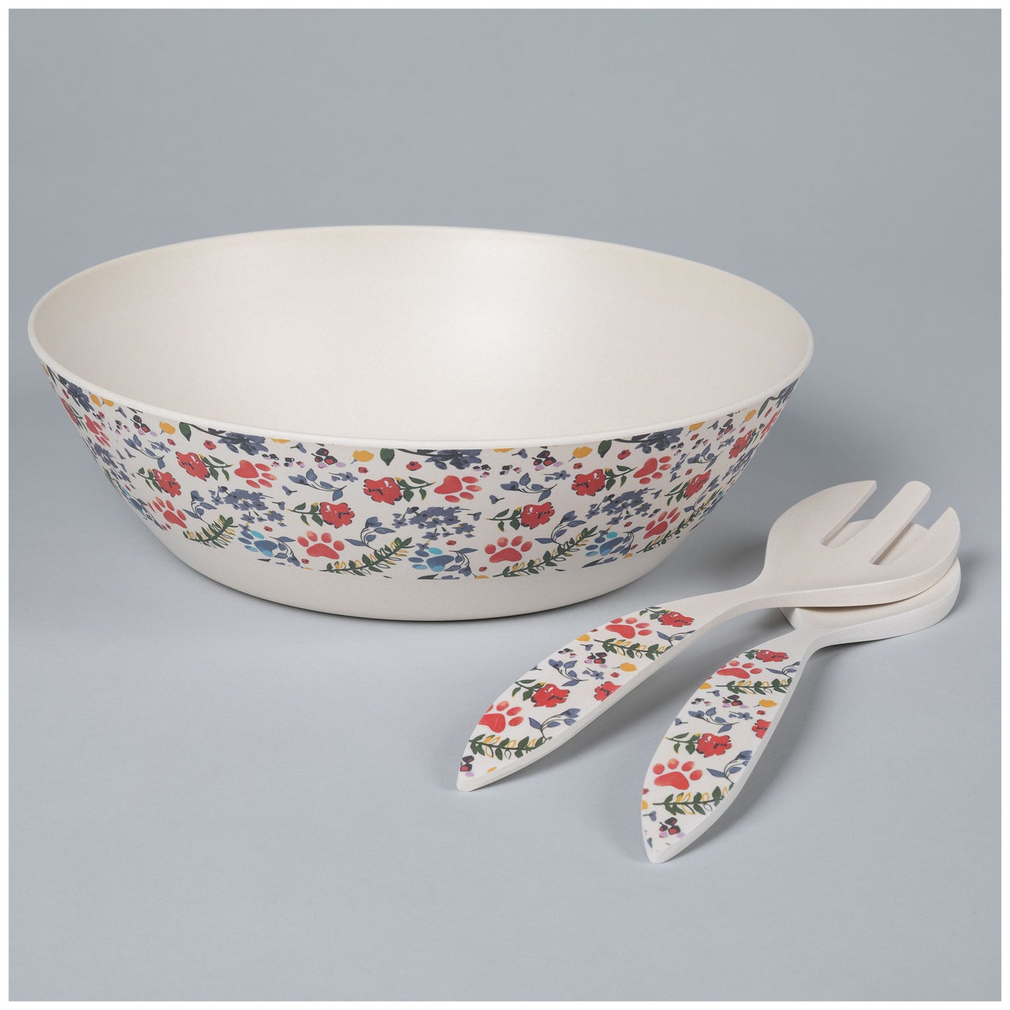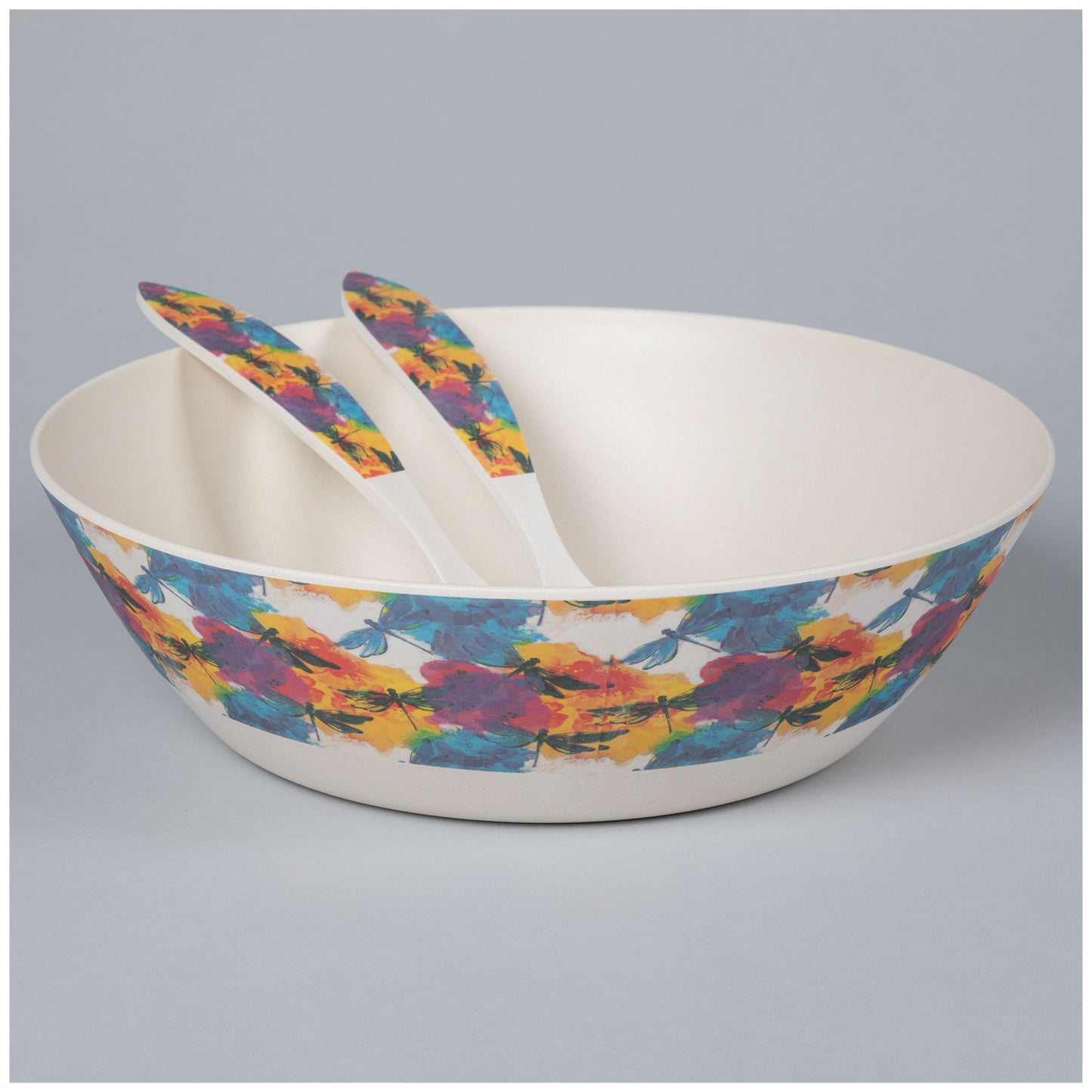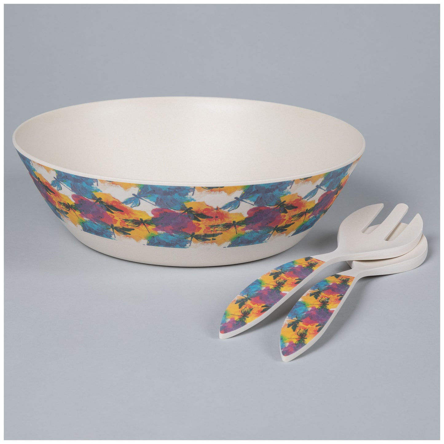 Three bowls with a million different uses! Made with bamboo fiber and melamine, this set of three nesting bowls, or salad bowl with serving utensils -- also a three piece set -- is easy to clean, and hard to break. Choose from rainbow paws or a watercolor dragonfly scene that wraps along the upper half of each bowl, and the handles of the salad servers.