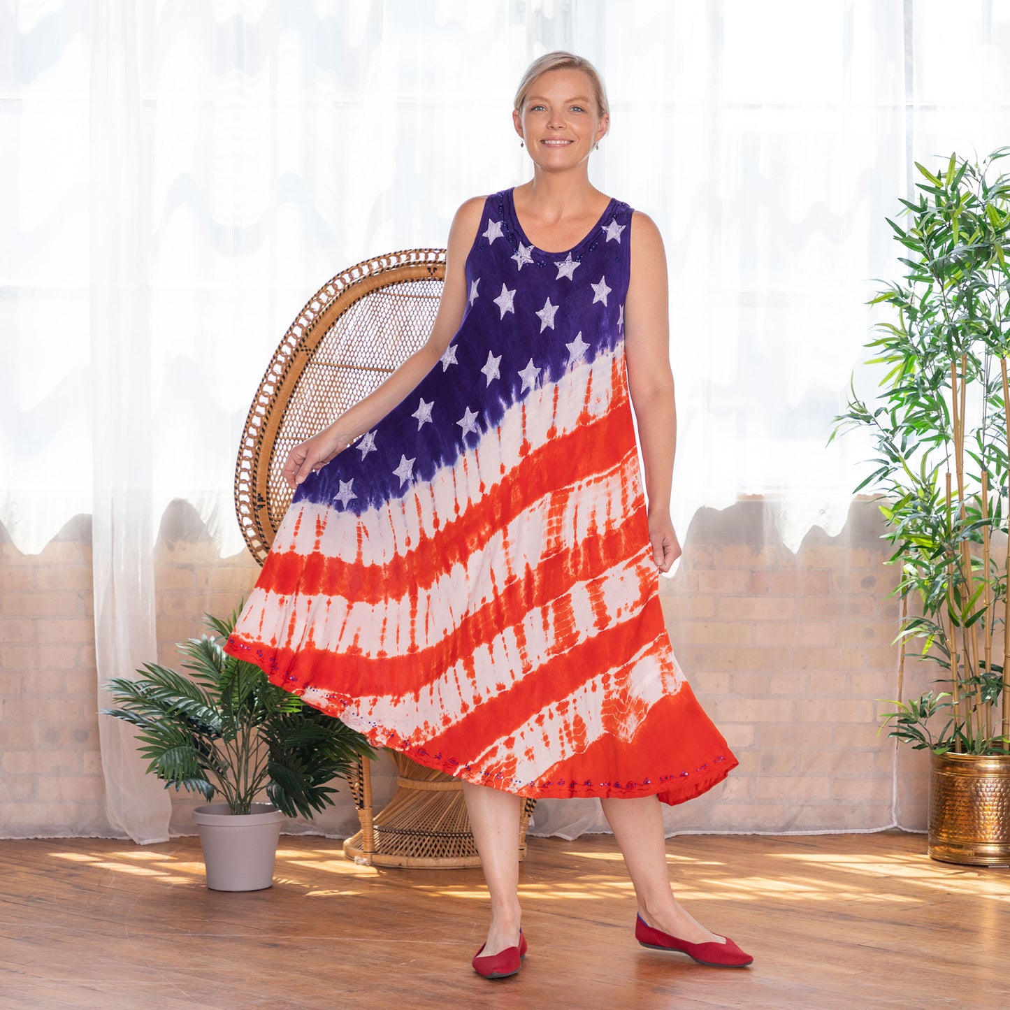 A stunning tribute to freedom, unity, and style. Made from lightweight fabric, this sleeveless dress offers comfort and freedom of movement, perfect for any occasion. The diagonal stars and stripes pattern adorning the dress captures the essence of the American flag, exuding a sense of patriotism and pride. The long, flowing silhouette adds an air of sophistication, while the sleeveless design keeps you cool and comfortable on warm summer days.