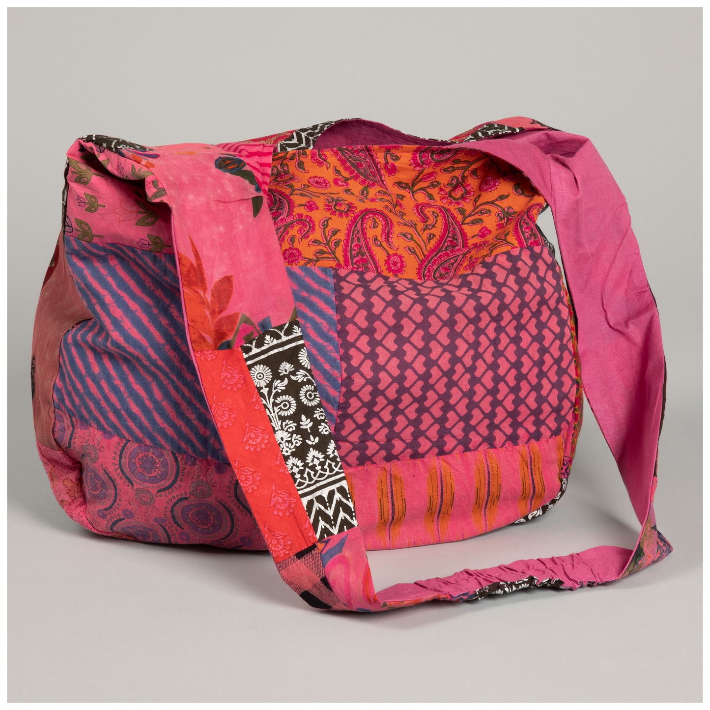A brilliant patchwork design in monochromatic hues makes for colorful everyday accessory. Complete with a wide shoulder strap that makes toting it super comfortable, and knowing that each individual patch of fabric was upcycled for a second life makes it an environmentally conscious choice!
