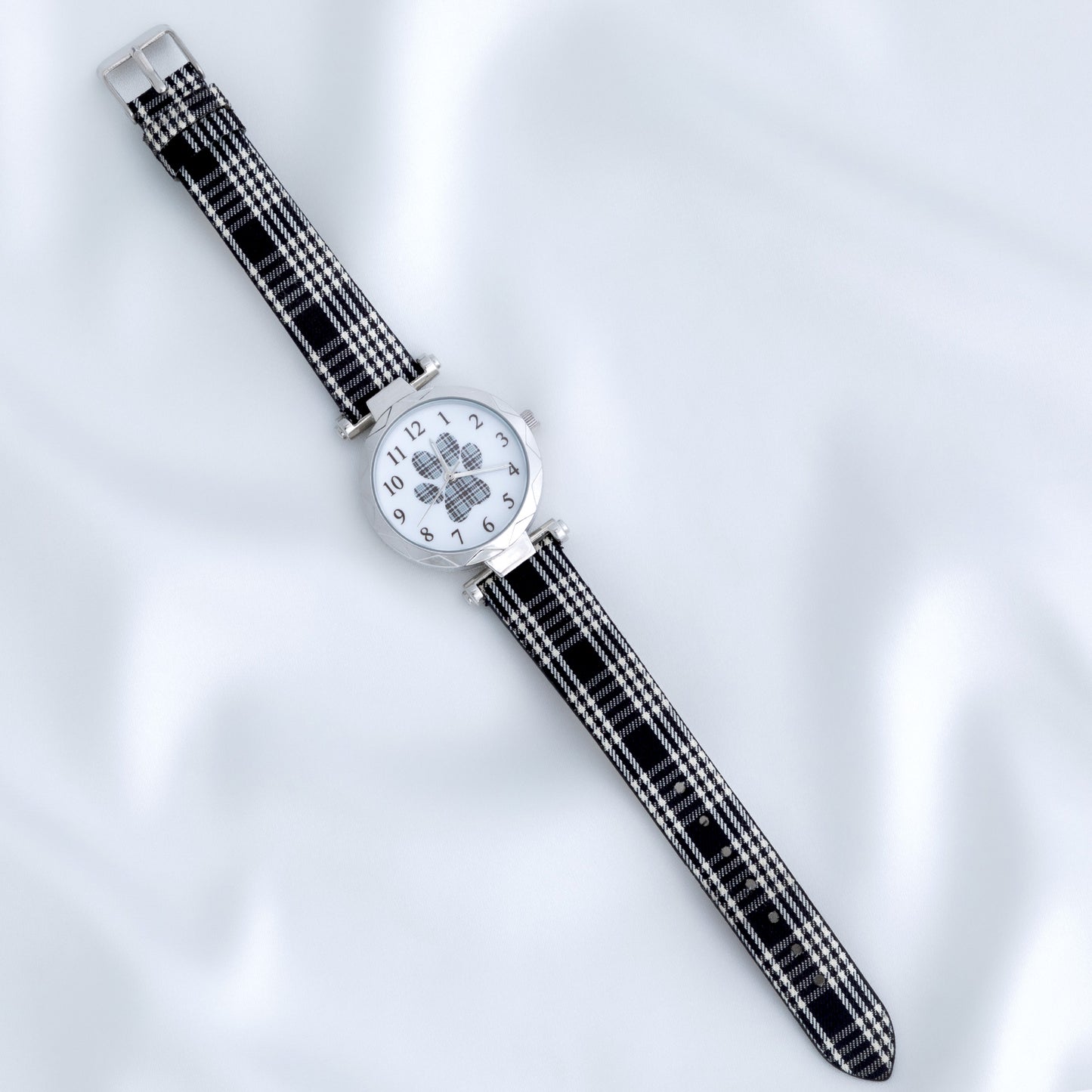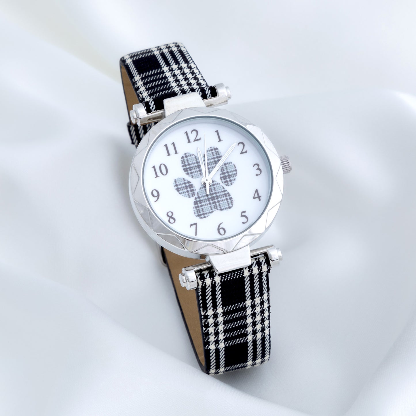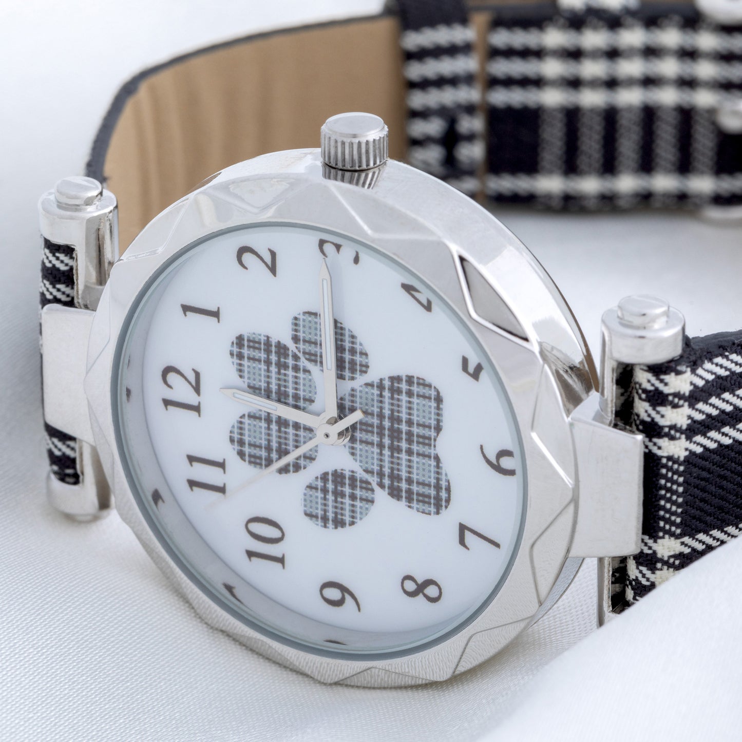 A classic plaid print wraps around the watchband and coordinates with paw print at the center of this charming wrist watch! Made with a stainless steel in silver or rose-gold tone, and complete with a water resistant face, this adjustable watch keeps you running on time, with a look that goes with everything.