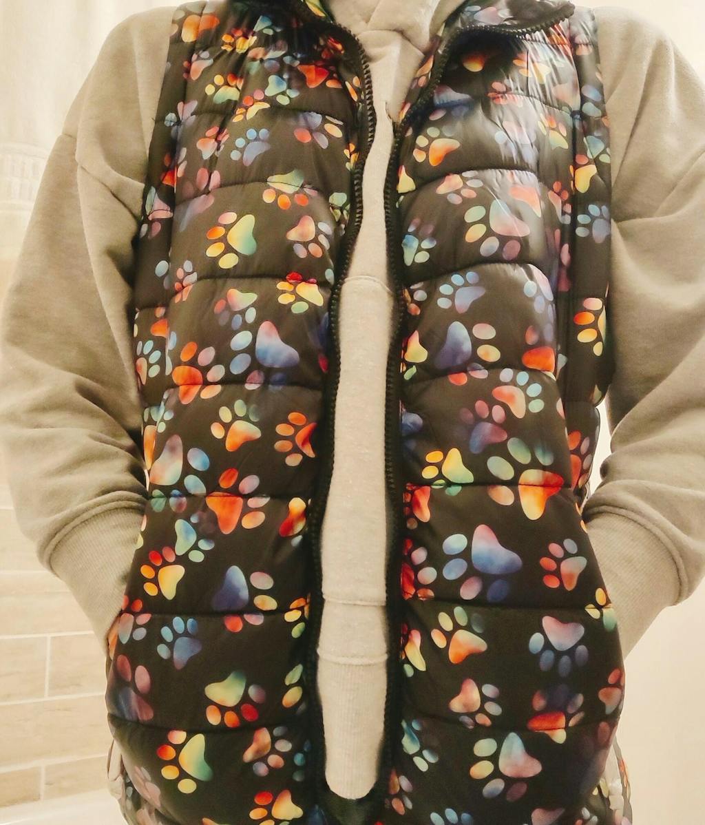Transition into cooler weather with the perfectly paw-printed quilted vest! Rainbow paws on a black quilted vest make for a versatile and playful layering piece, topped with a high neck and two front pockets, keeping you extra toasty.