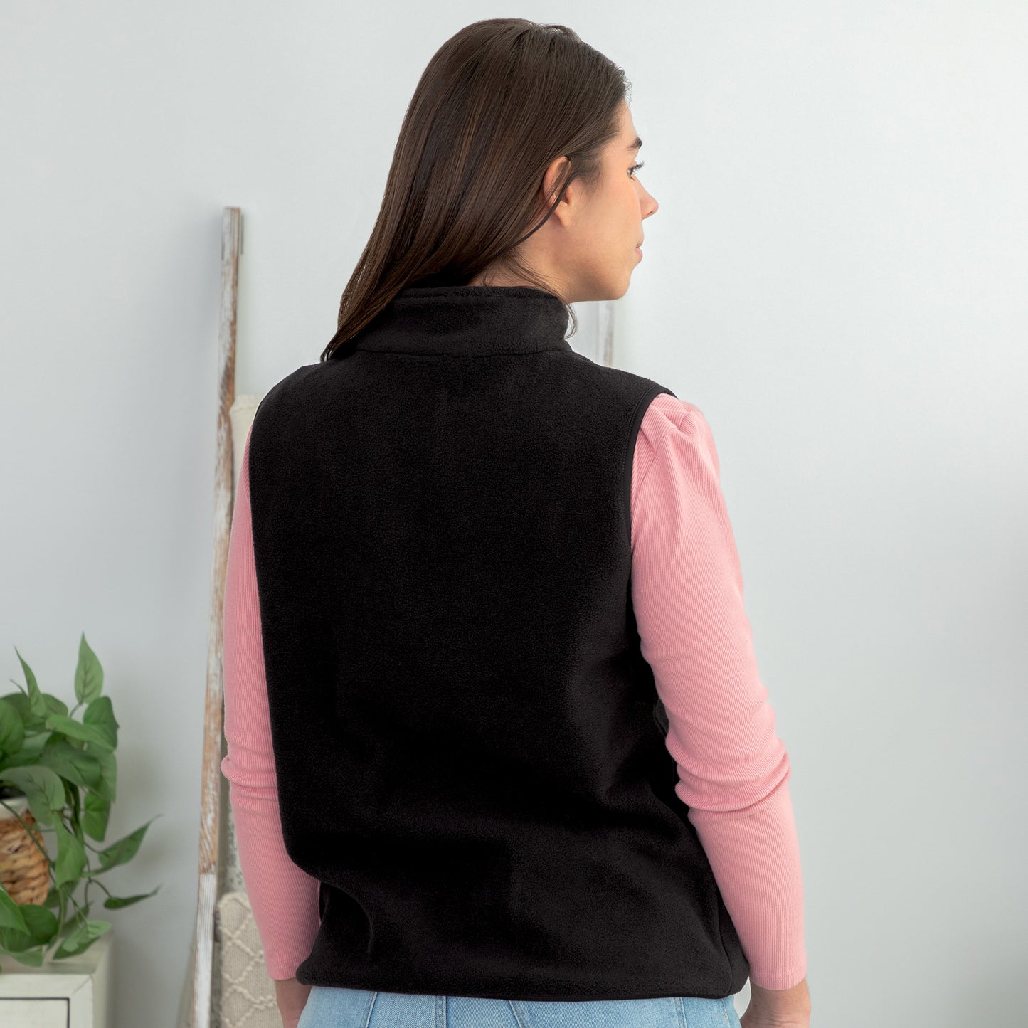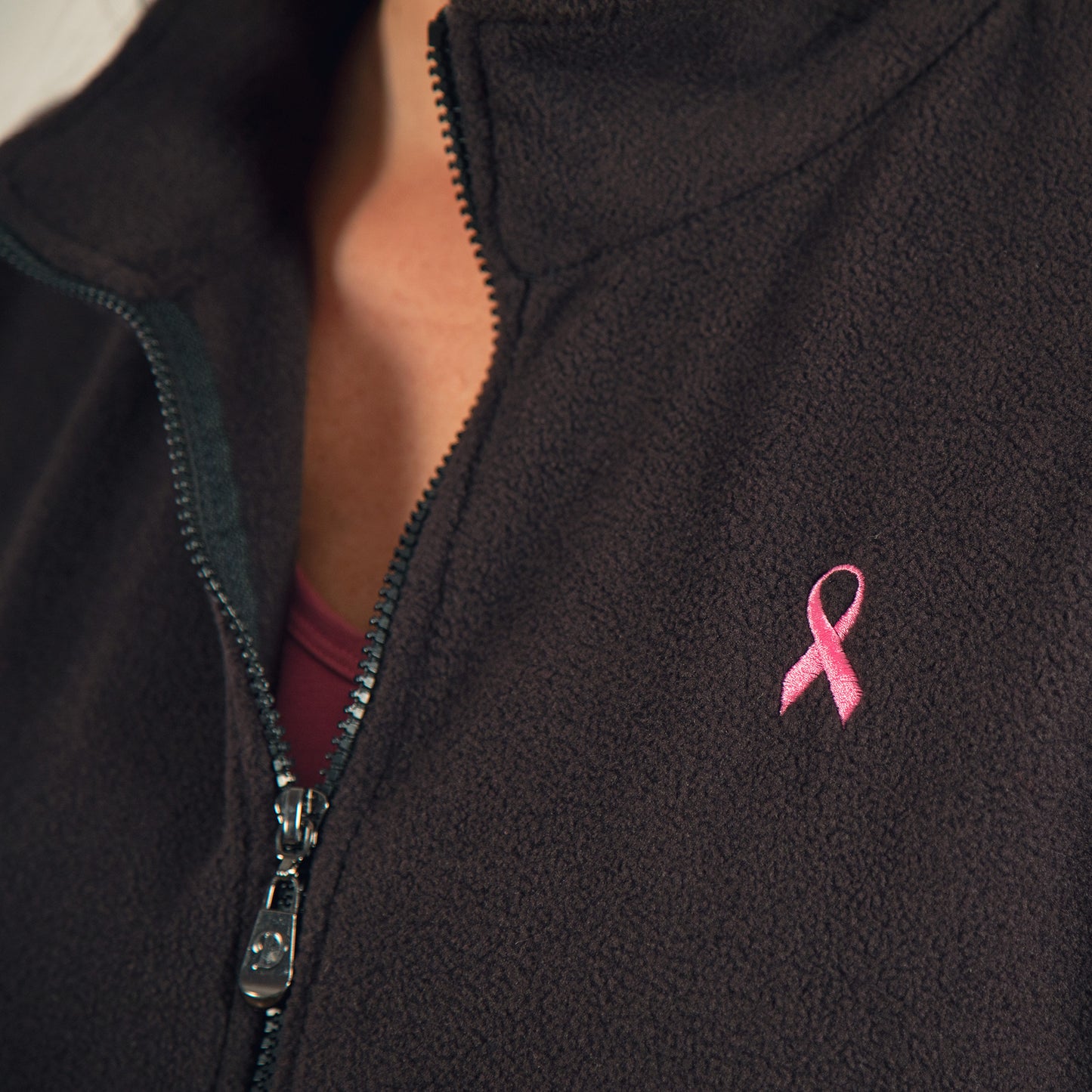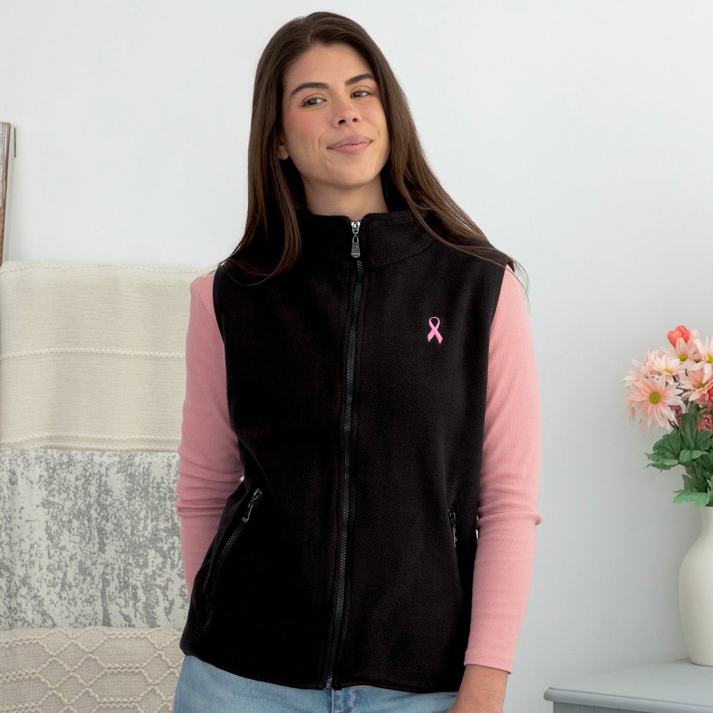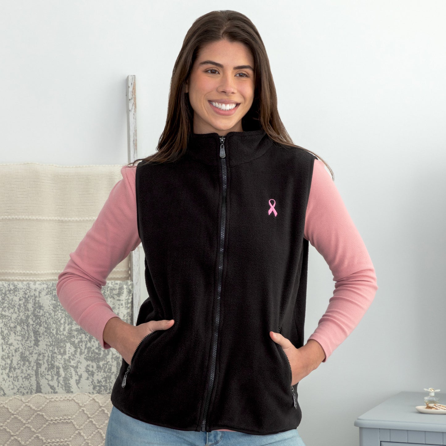 Support breast cancer awareness in this embroidered pink ribbon vest that features a high neckline to keep you warmer on those chillier days.