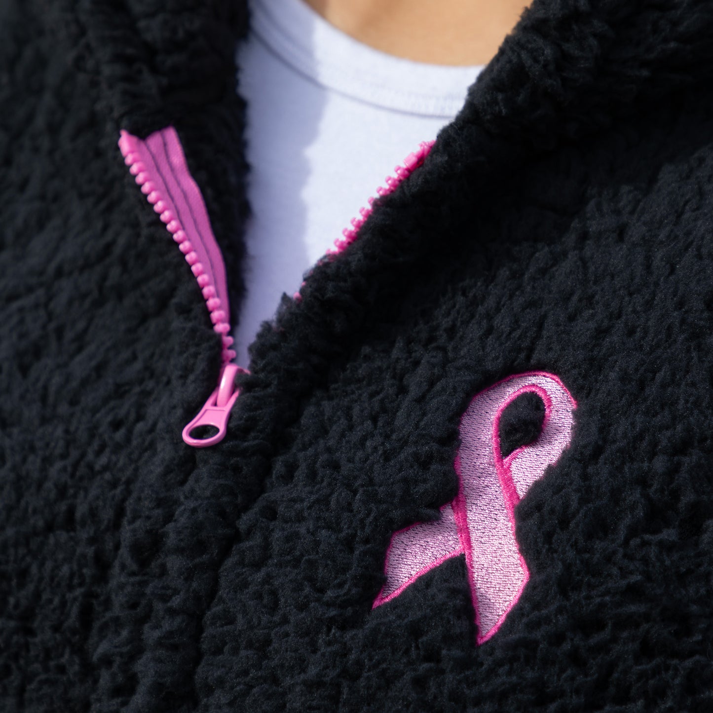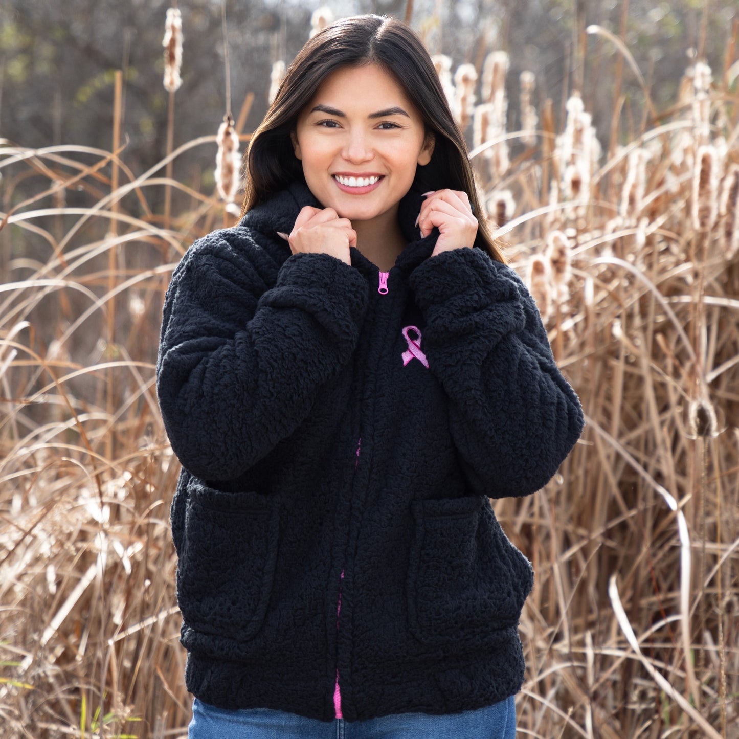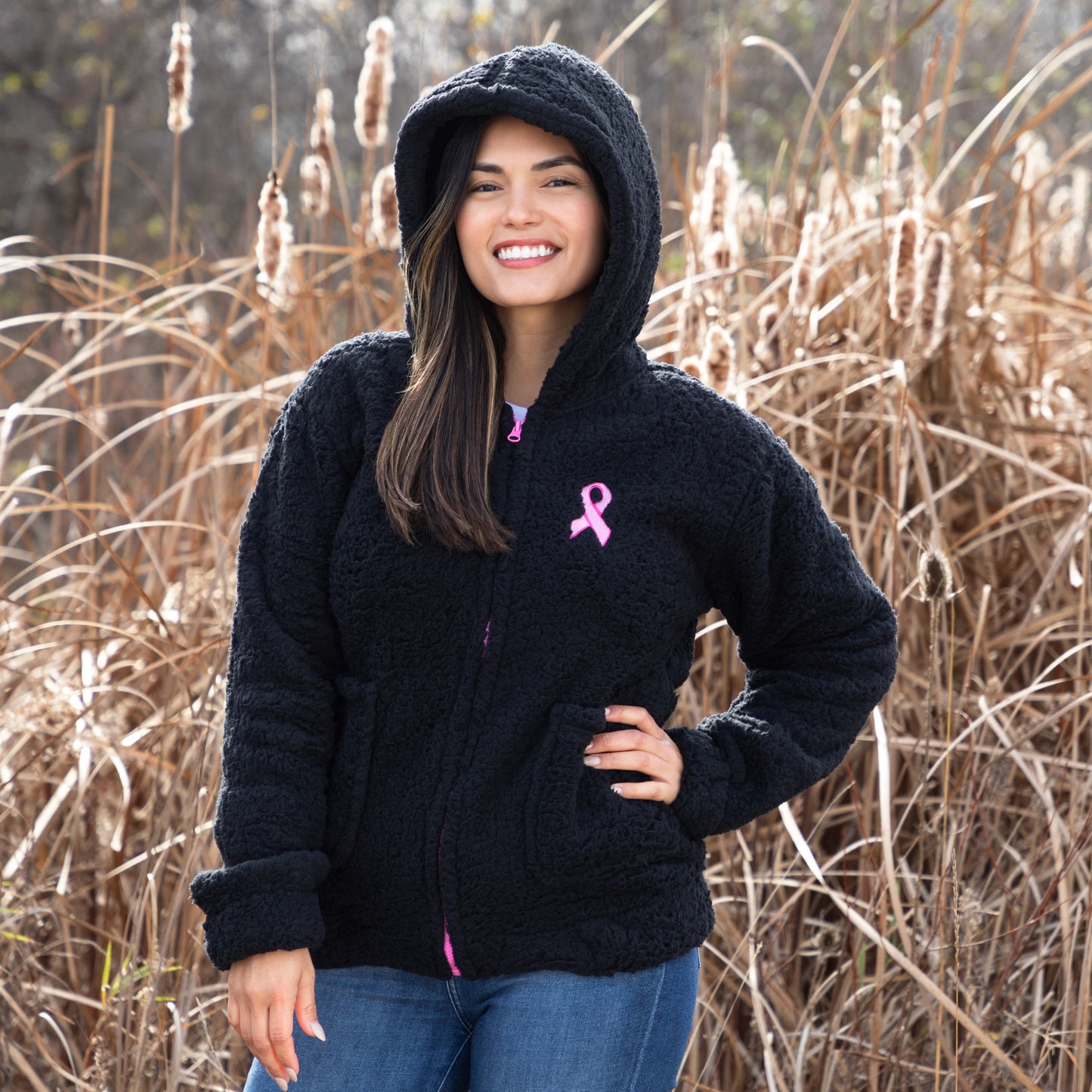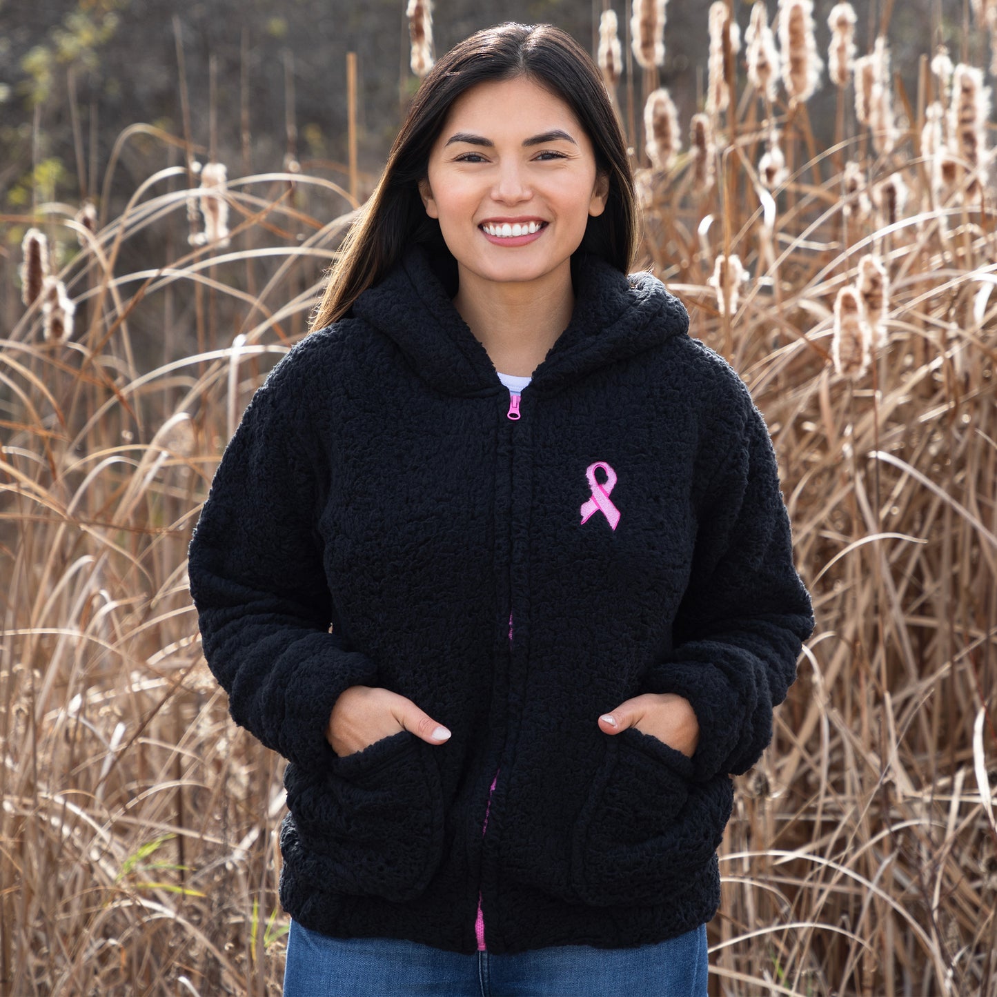 Your new favorite plush fleece hooded jacket features a full zip design, two pockets, and a contrast pink zipper that matches the pink ribbon embroidered on the chest. Enjoy the cozy sherpa fleece that wraps you in warmth while spreading an important message of breast cancer awareness. Explore more ways to shop and support Breast Cancer Awareness.