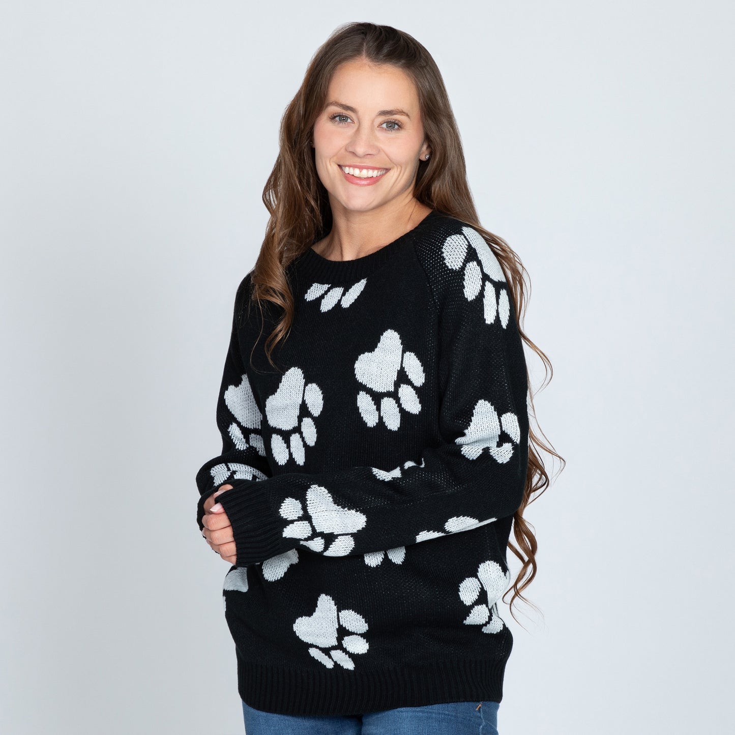 A classic crew neck sweater with a sweet paw-printed design. Featuring an intricate knit that is made with acrylic so it's not itchy like wool, plus it's machine washable!