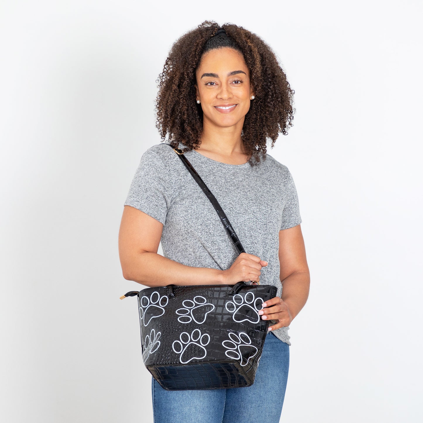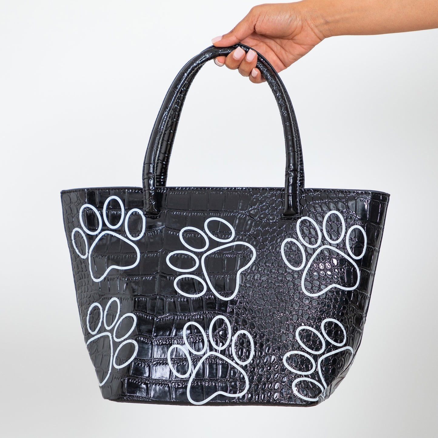 The outlines of paw prints pattern this alligator inspired faux patent leather bag! Made with a classic black and white design, a structured feel, fixed handles as well as an adjustable shoulder strap for an accessory that can do it all.