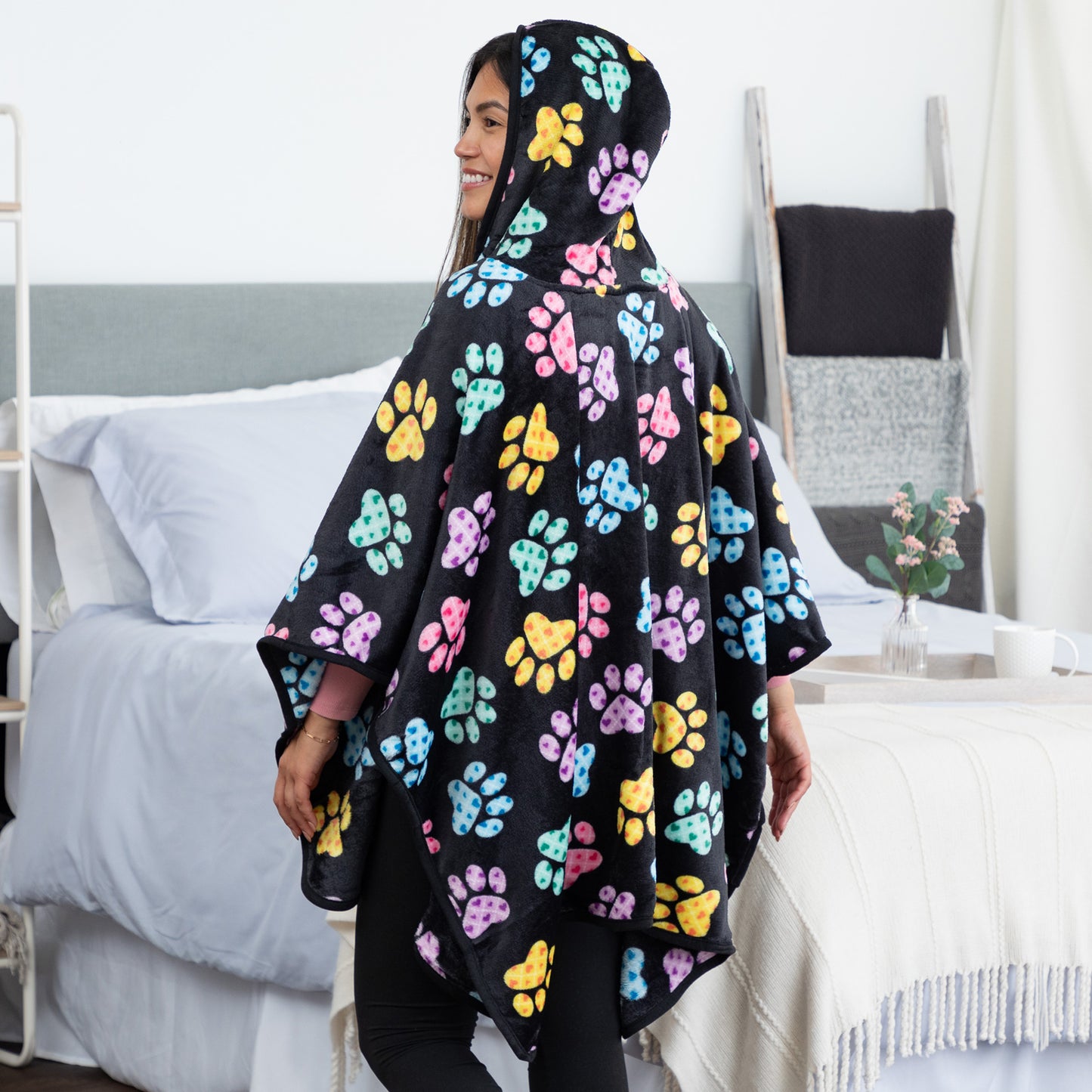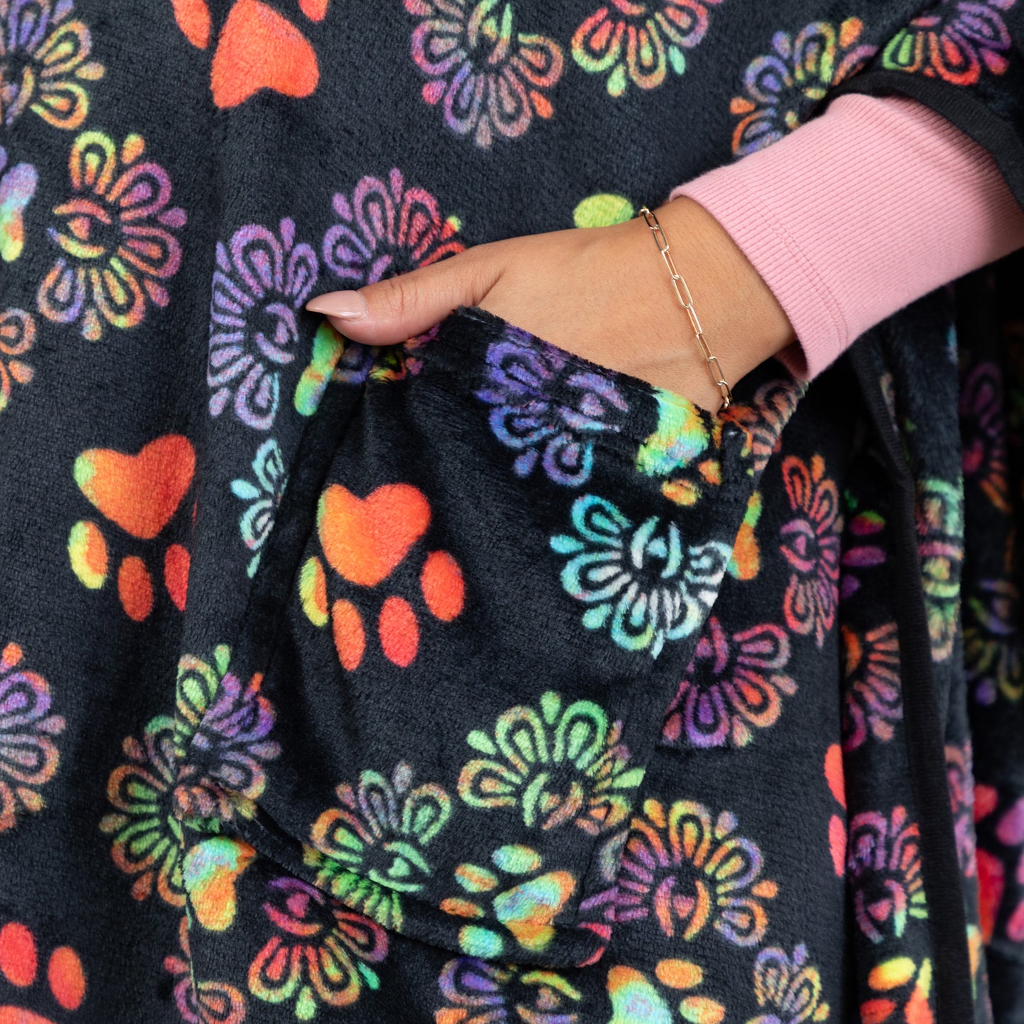 Made with a soft, lightweight fleece, this colorful wrap is effortlessly thrown over your shoulders for a cozy way to share your dedication to animal causes! Complete with hood and two front pockets for warming up your own paws or carrying a few essentials.