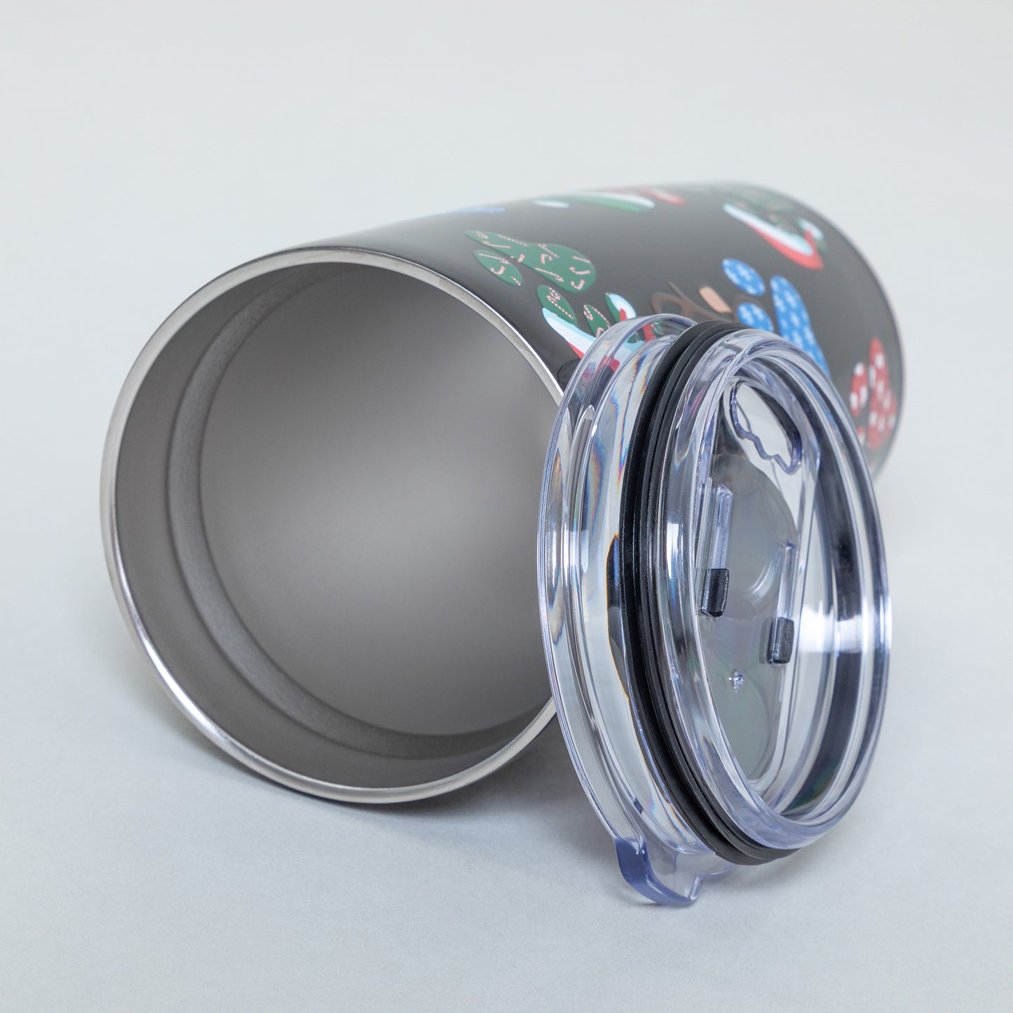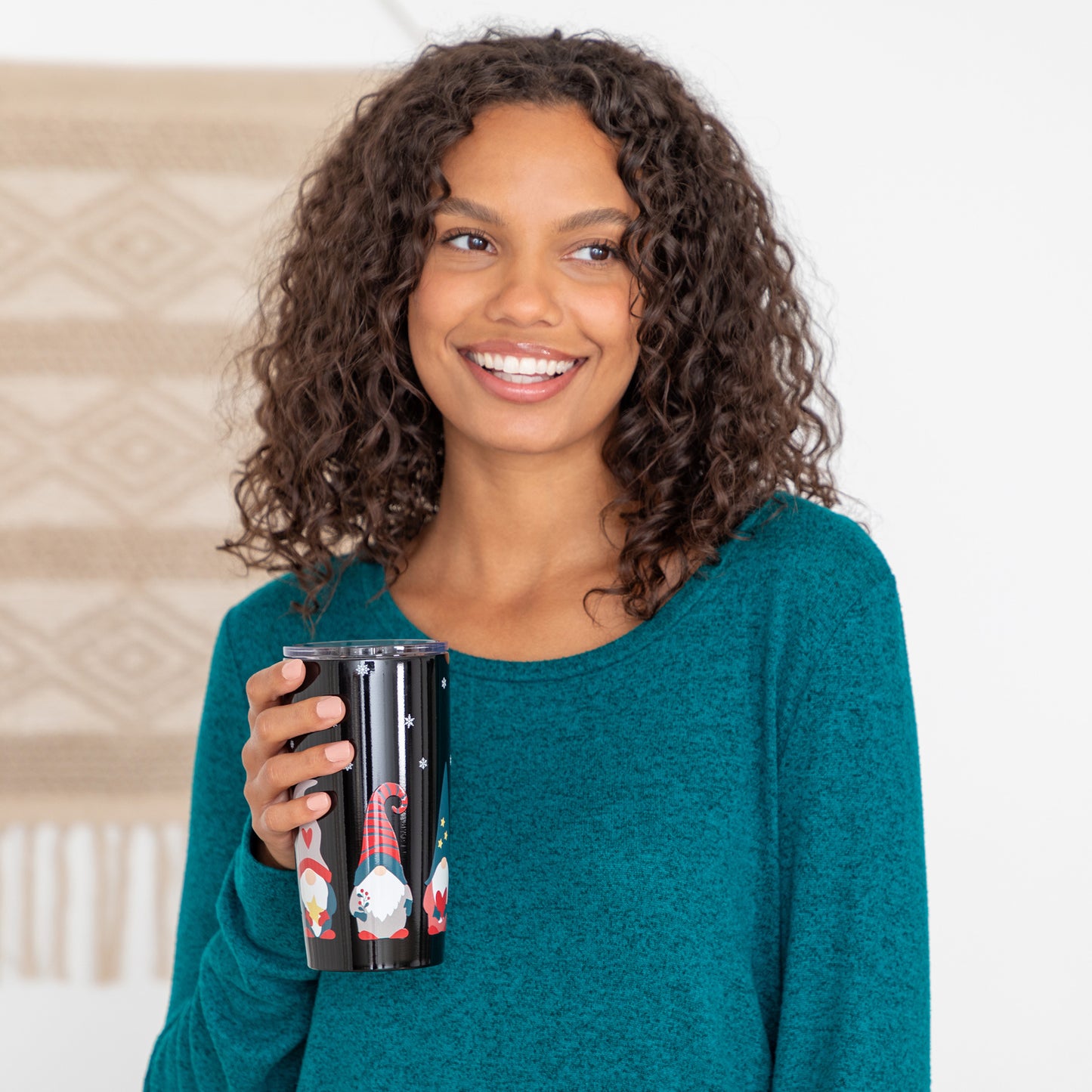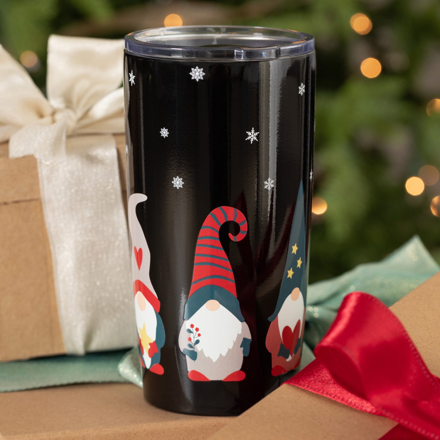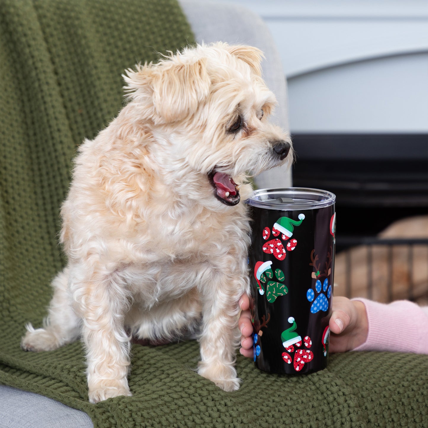 Enjoy your morning coffee or a steaming cup of hot cocoa in this adorable winter-themed travel mug. Festive gnomes or cheerful paw prints in Christmas colors wrap around the tumbler for an uplifting way to keep your favorite drinks hot!