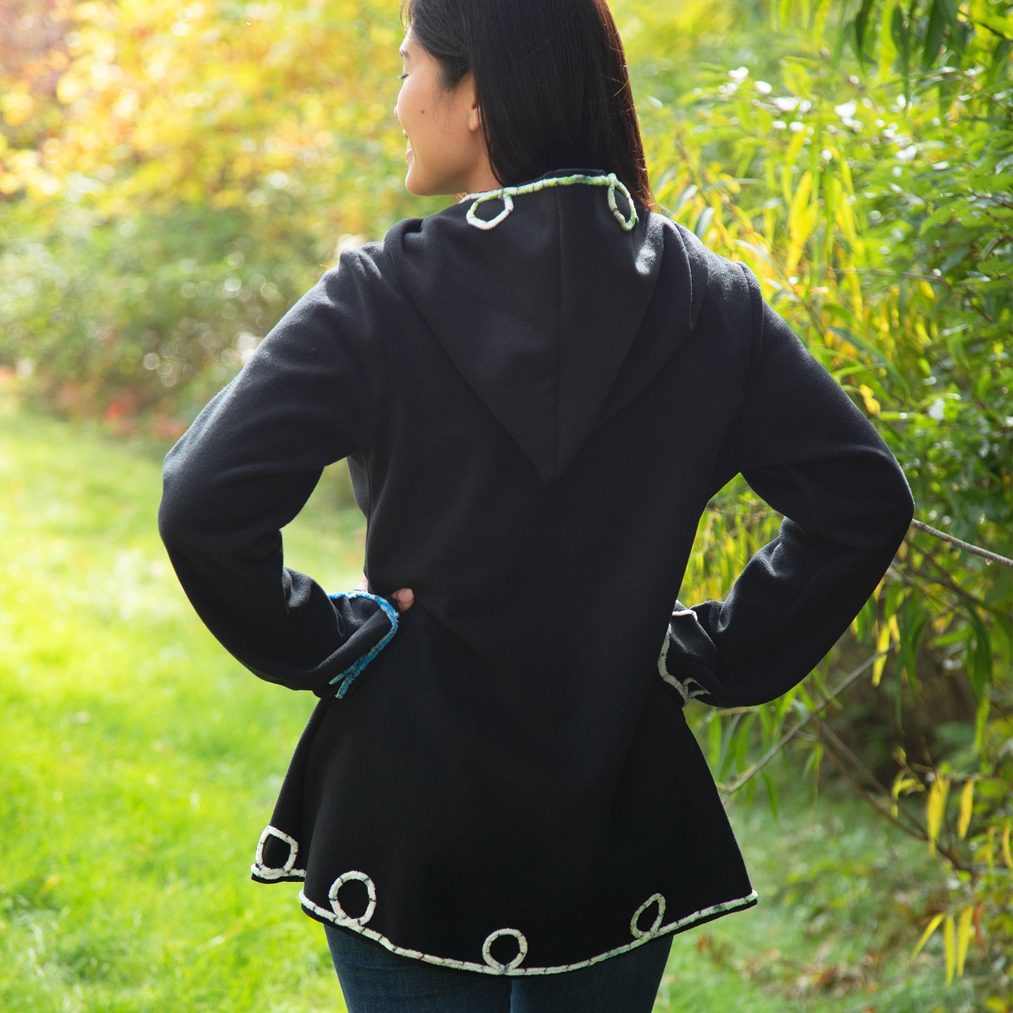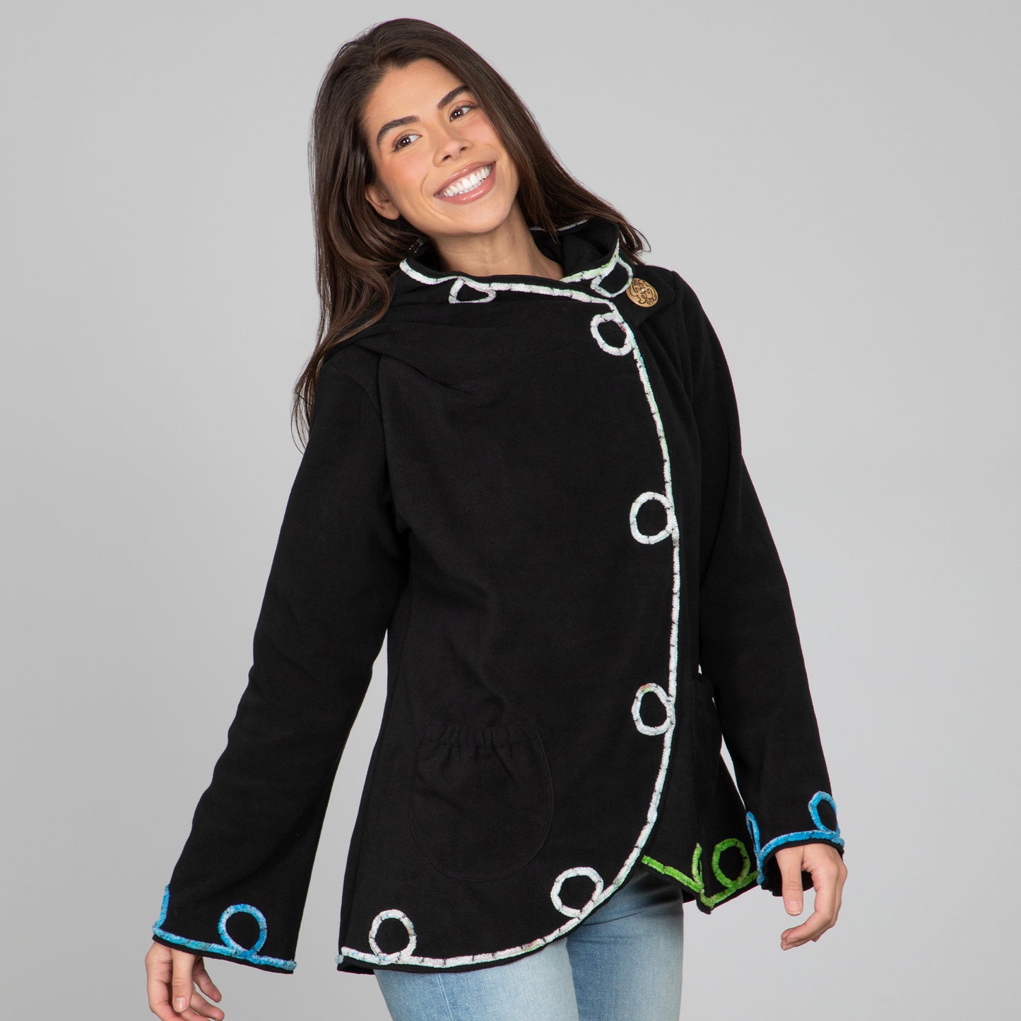 Ward off the chill in this charming embroidered, black fleece wrap jacket. Made with an extra wide collar to pull up for warmth and an easy-to-secure top button for effortless comfort and style!