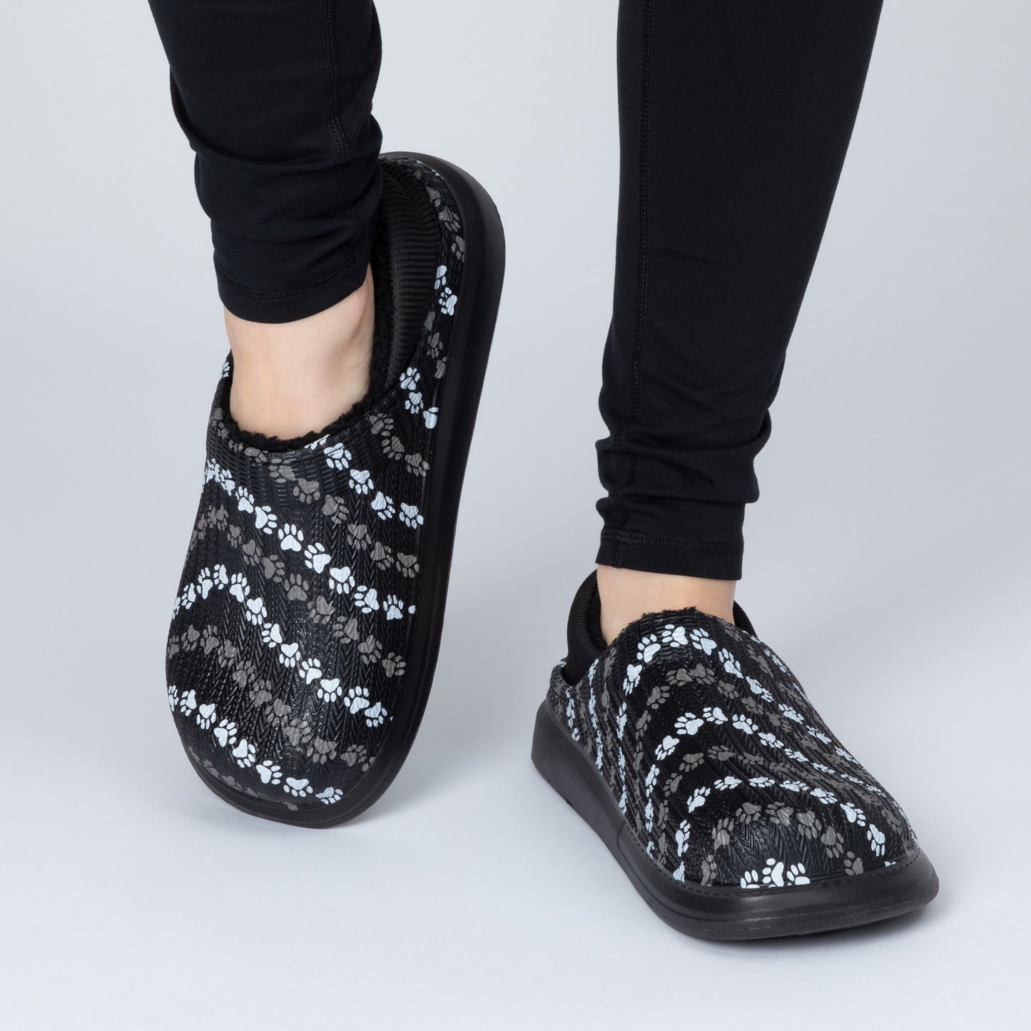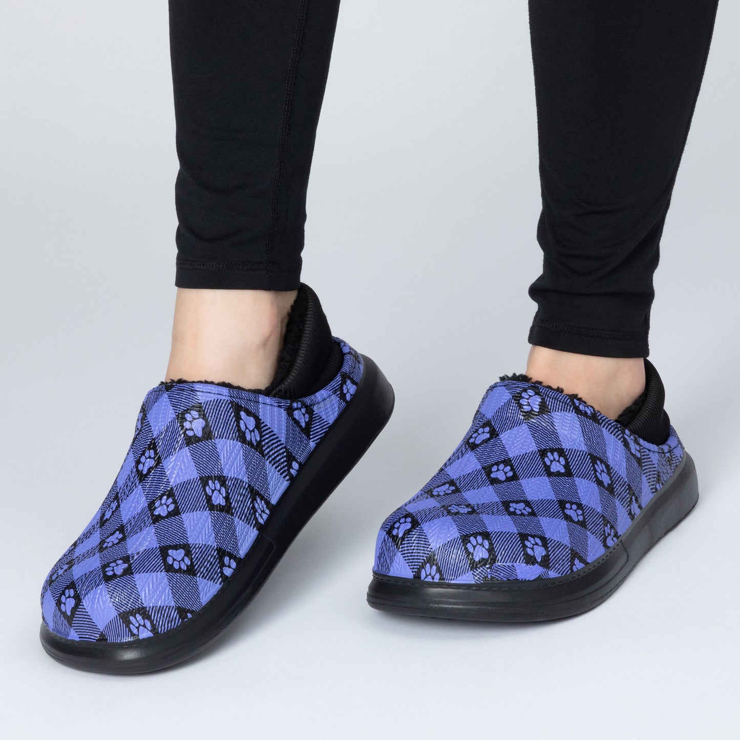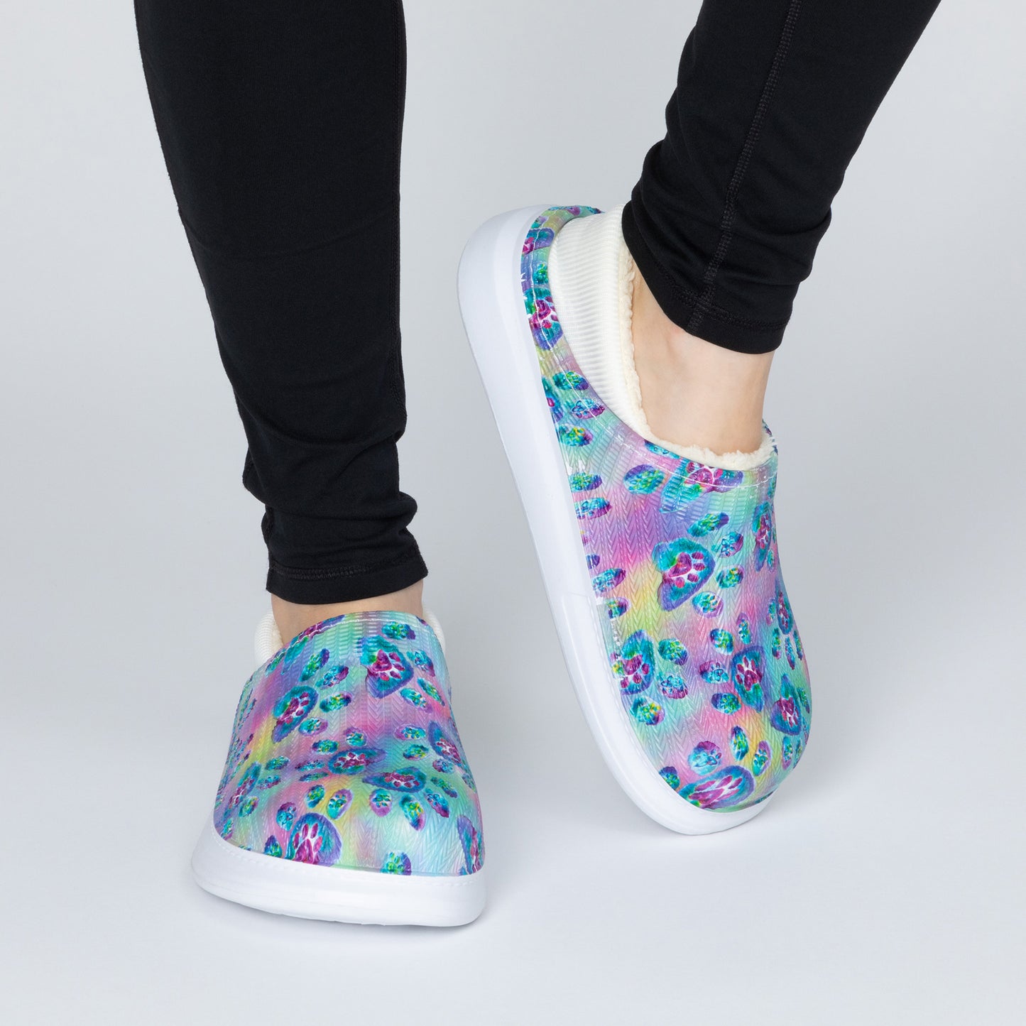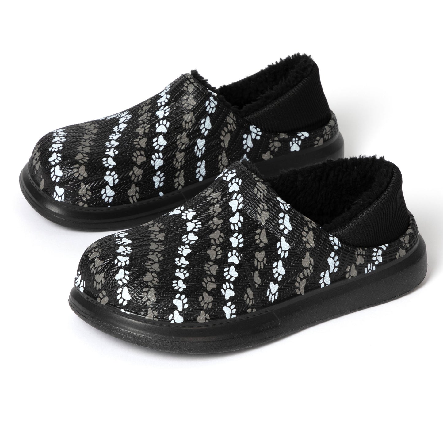 The simplicity of a slip-on shoe with the soft, fuzzy faux fur lining of a slipper! Made with a colorful paw-printed upper in an easy-to-clean EVA material, this pair of slippers is complete with an elastic backing that holds your heel comfortably in place. Plus, the lightweight cushioned EVA soles offer support while also being versatile for indoor or outdoor wear!