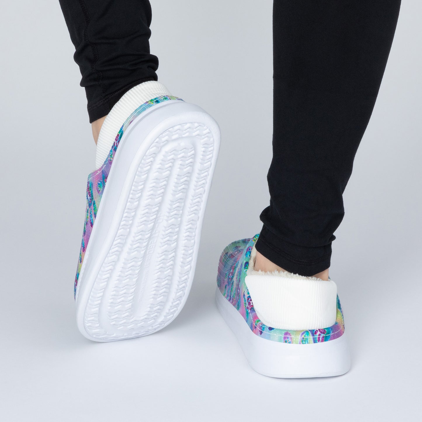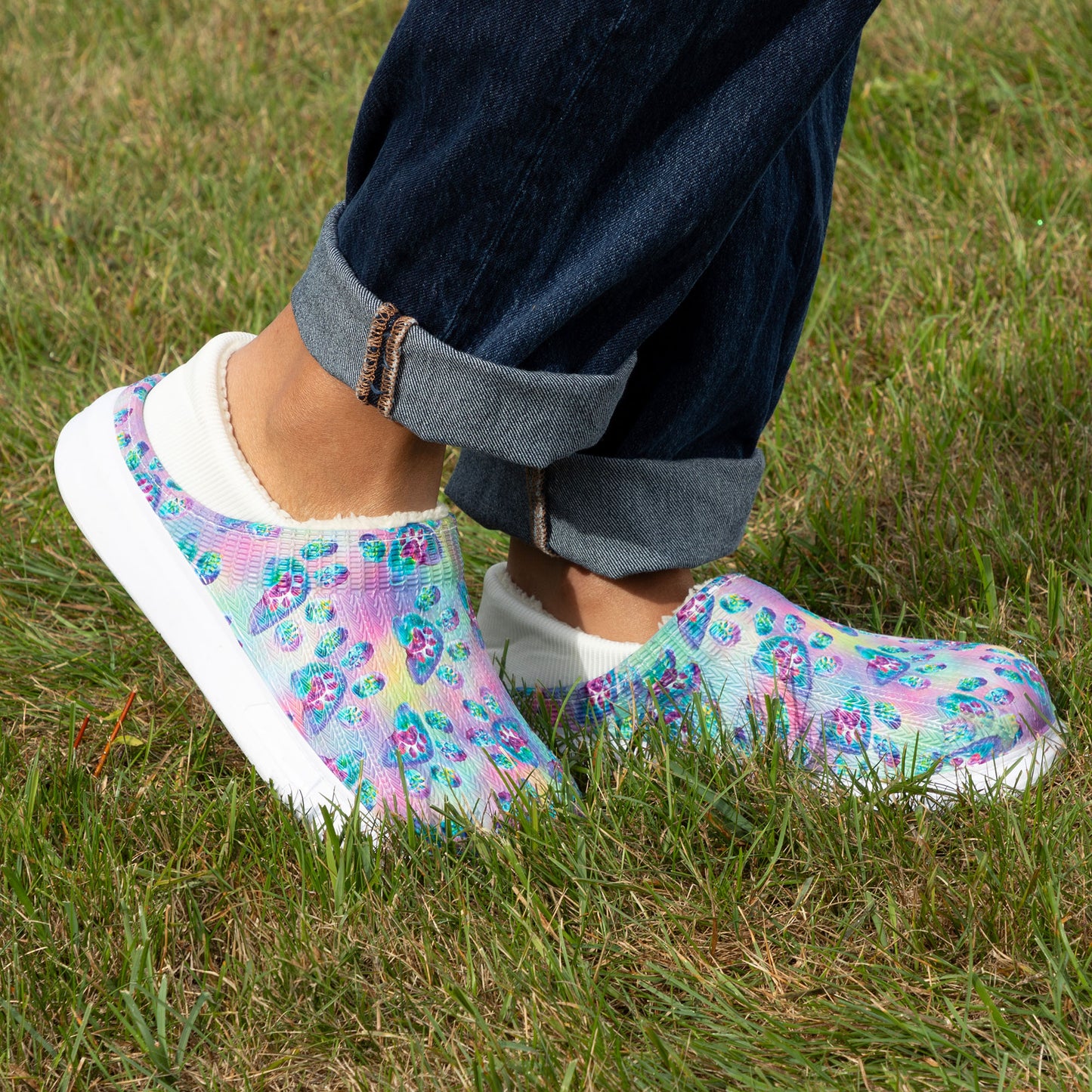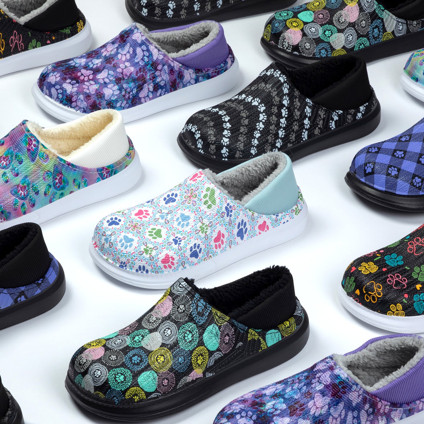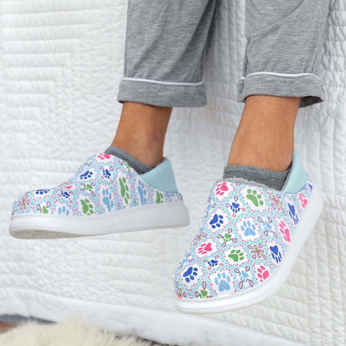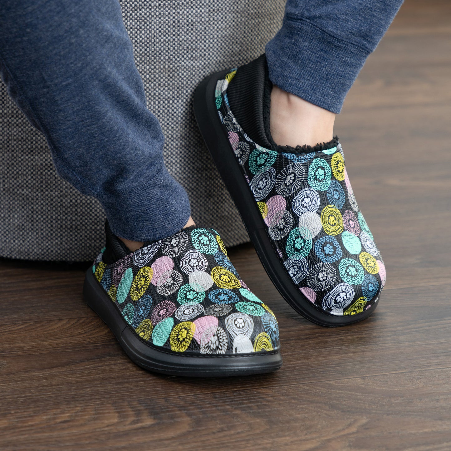 The simplicity of a slip-on shoe with the soft, fuzzy faux fur lining of a slipper! Made with a colorful paw-printed upper in an easy-to-clean EVA material, this pair of slippers is complete with an elastic backing that holds your heel comfortably in place. Plus, the lightweight cushioned EVA soles offer support while also being versatile for indoor or outdoor wear!