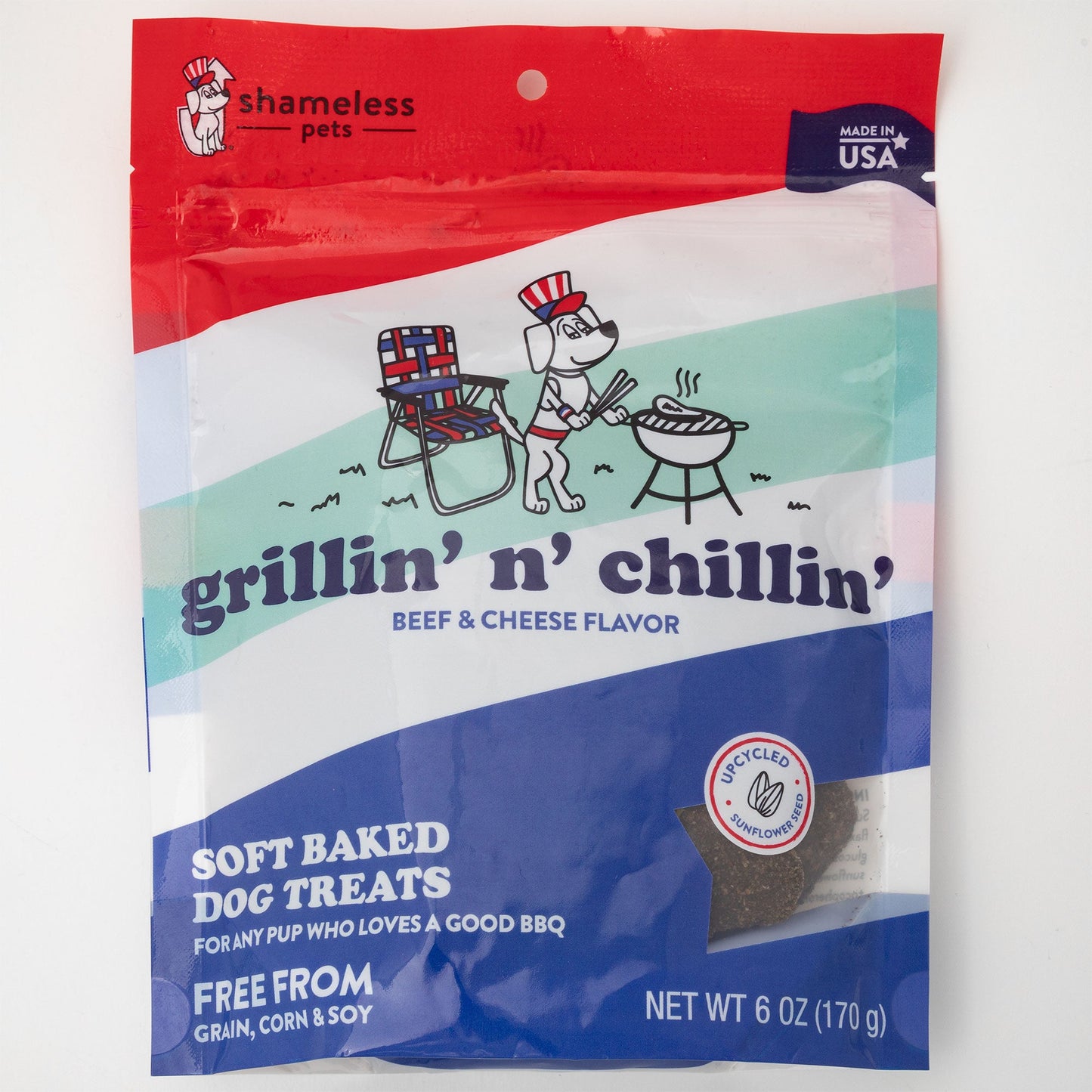 Shameless Pets new summertime flavor, Grillin' N' Chillin' is a delicious blend of beef and cheese, made with 25% of upcycled sunflower seeds!
