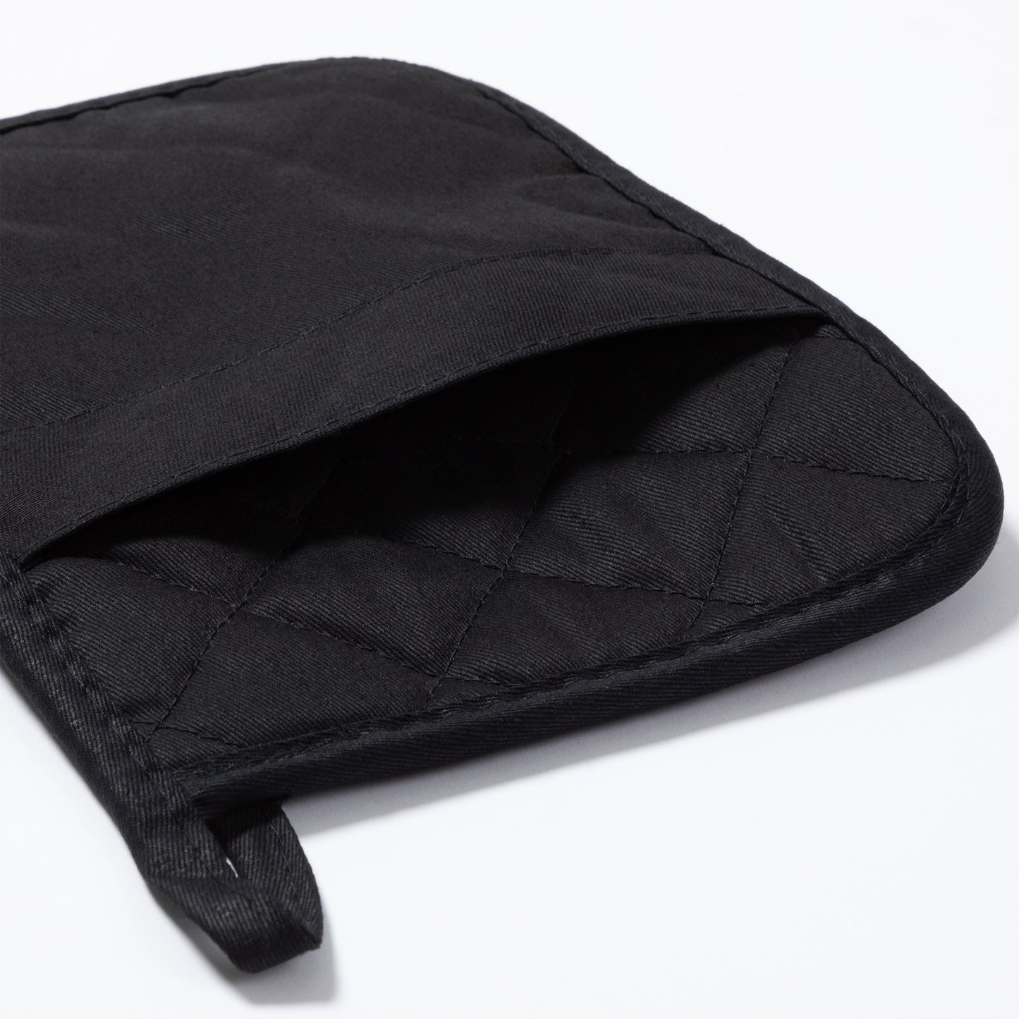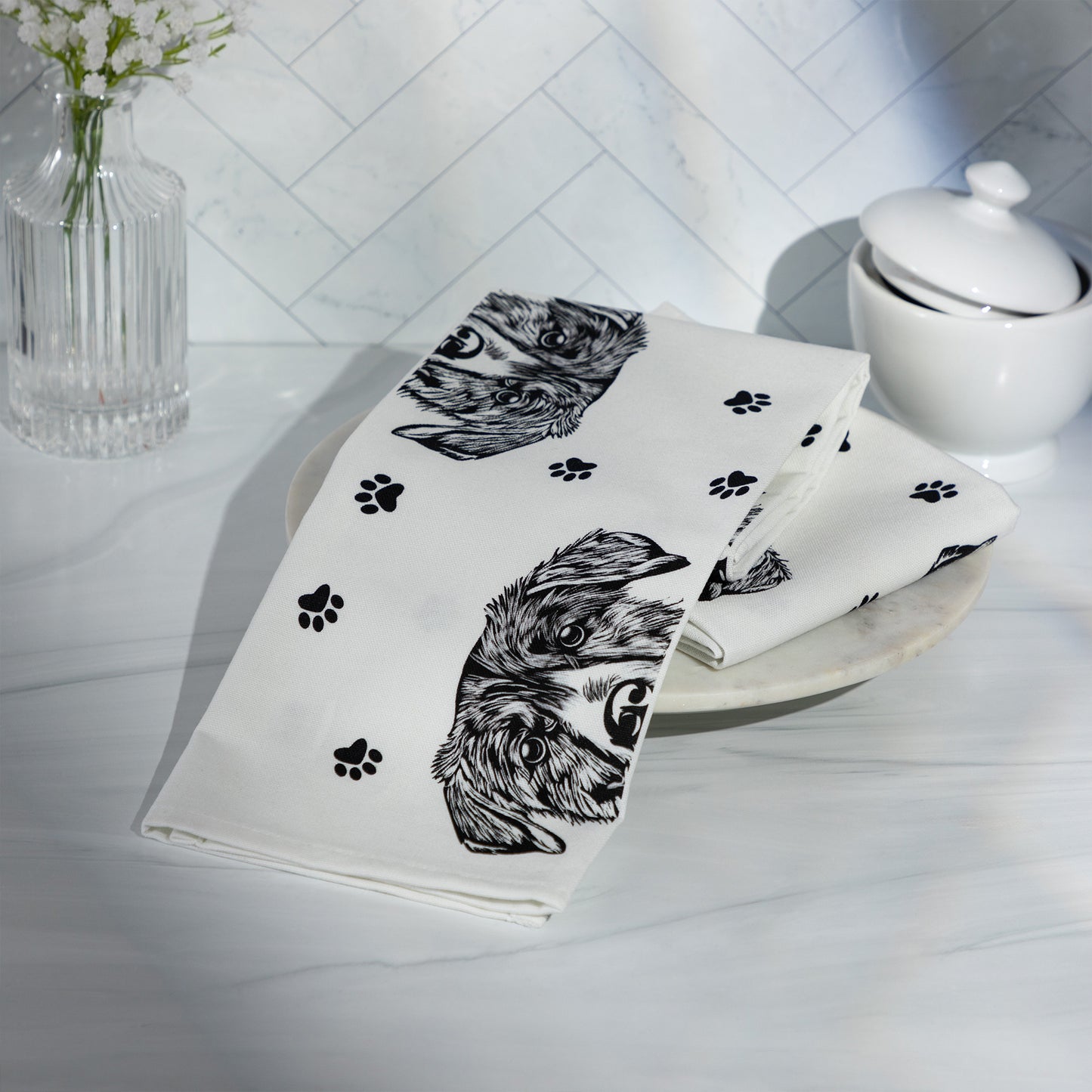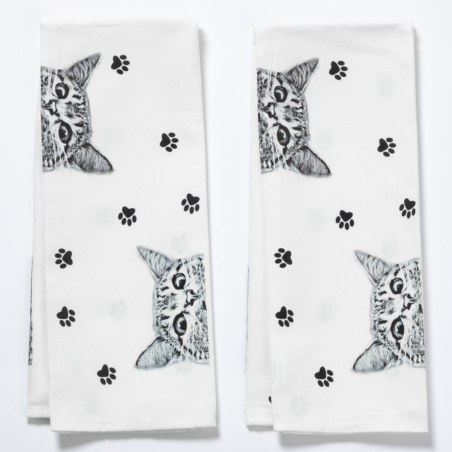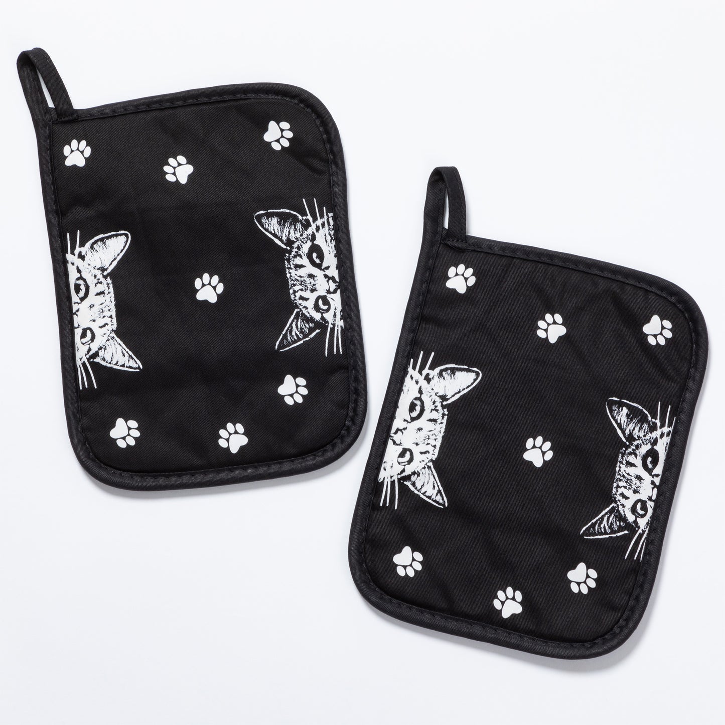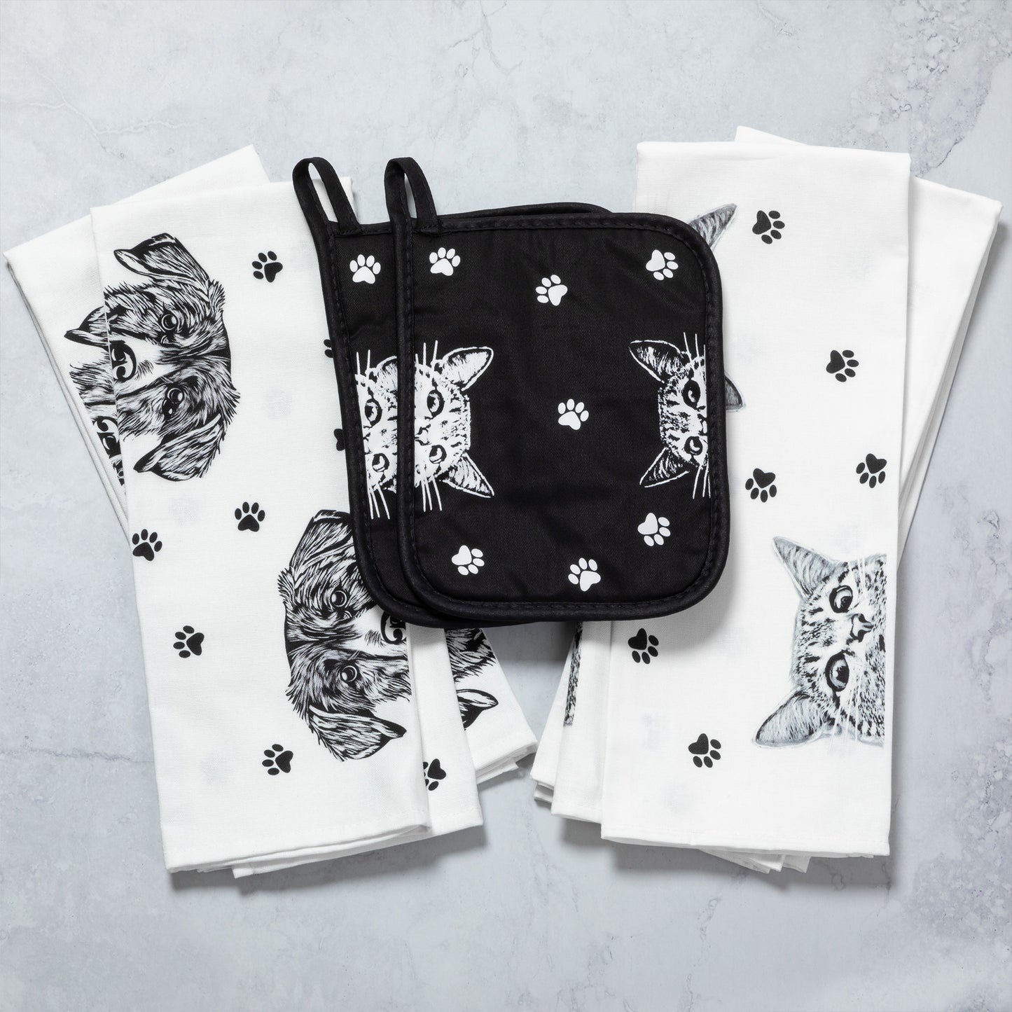 Adorably peeking out of the side of each set of two kitchen towels or pot holders are whiskered feline faces or precious pups! Paw prints also pattern this black and white themed set, made with 100% cotton for a modern yet playful addition to your kitchen.
