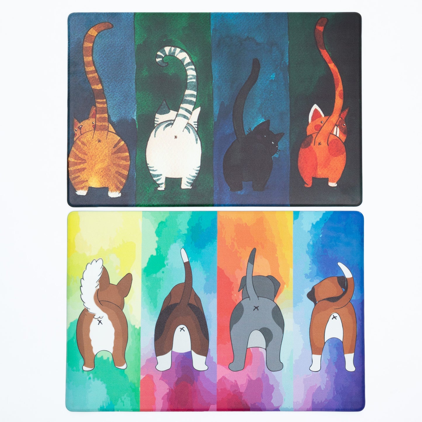 Guess what? Cat and dog butts! Welcome your guest to your animal loving home with this colorful and fun welcome mat. A comfortable mat with anti-slip backing, this mat is great to put in your entryway or by the sink or stove as you get chores done around the house.