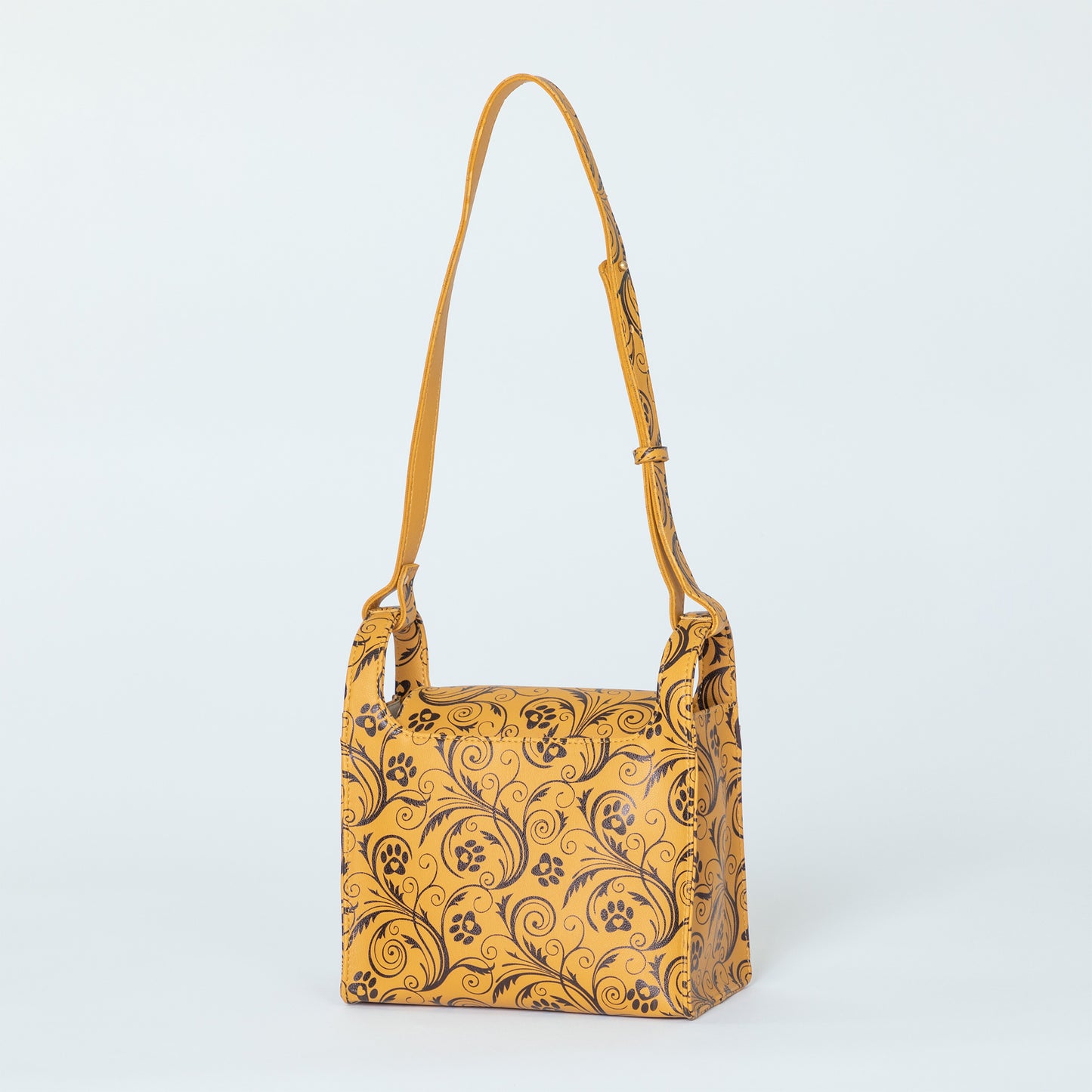 Swirls and paw prints pattern this structured and simple handbag -- your new everyday accessory! Made with a smooth, faux leather in a warm carmel color, a fixed shape so your items are easy to find, and a magnetic button closure.