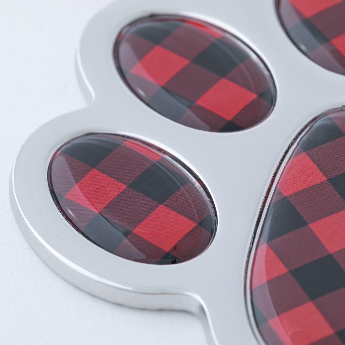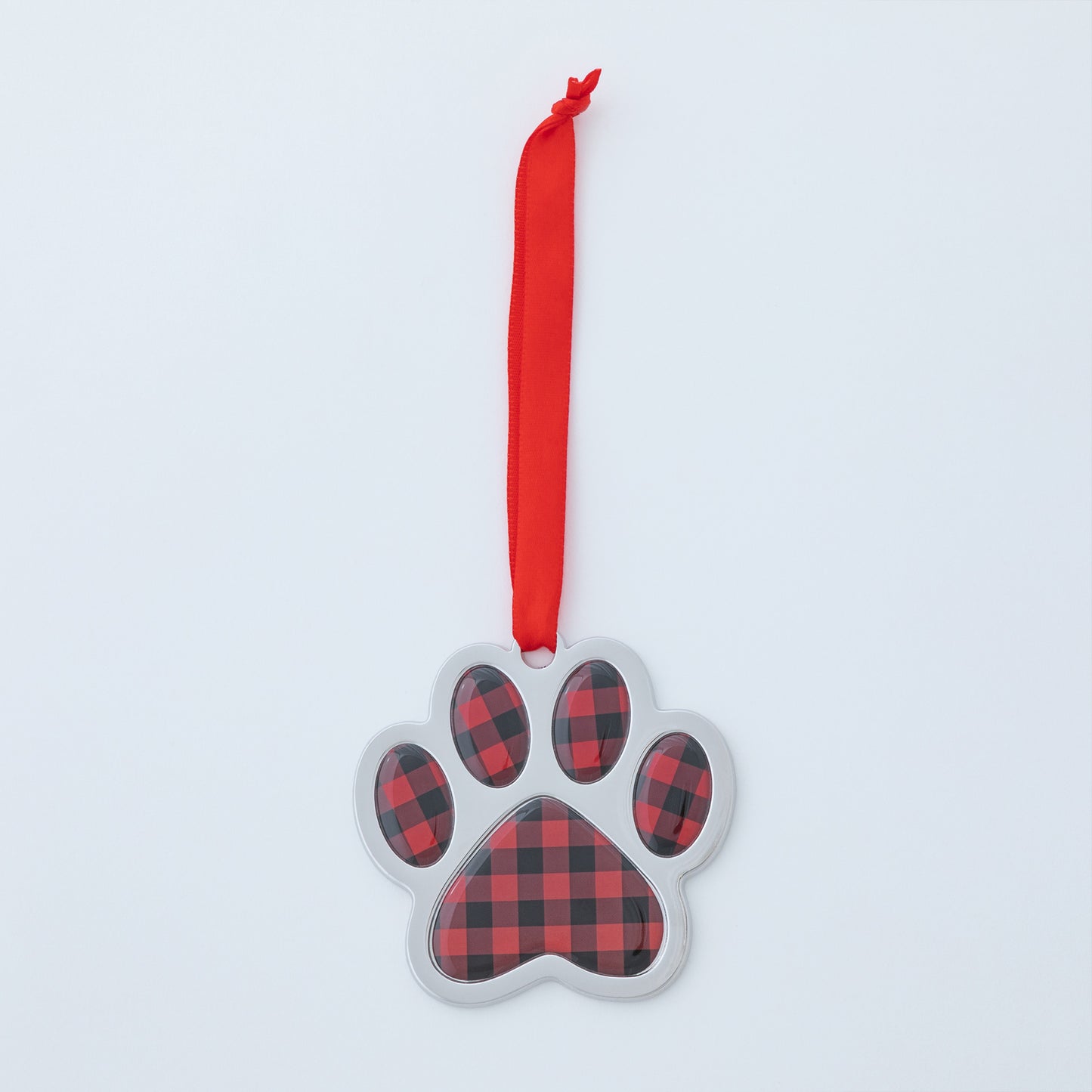 A classic gingham print fills this silver tone paw print ornament, adding a bit of classic charm to your tree. Topped with a red ribbon, this piece hangs from your tree as a brilliant symbol of your love and dedication to animal rescue causes.