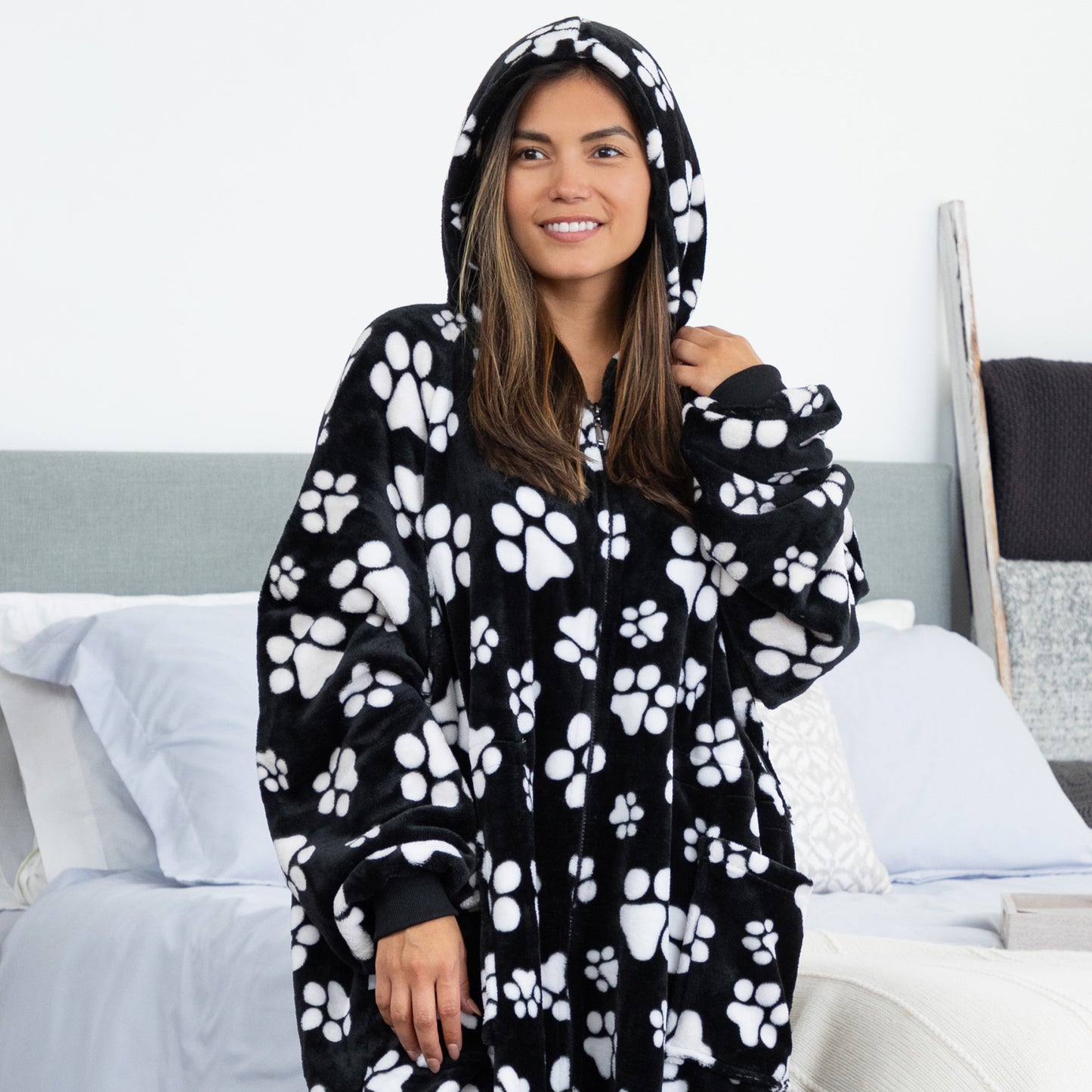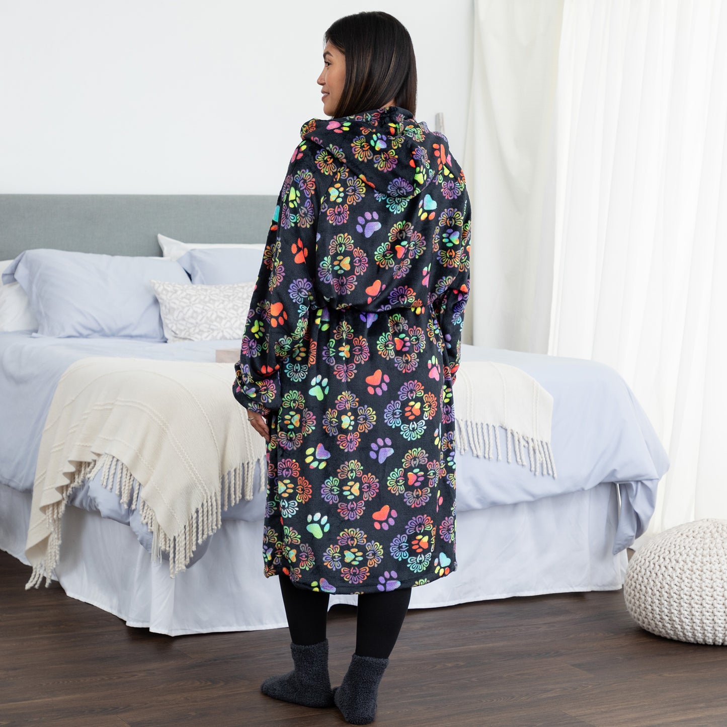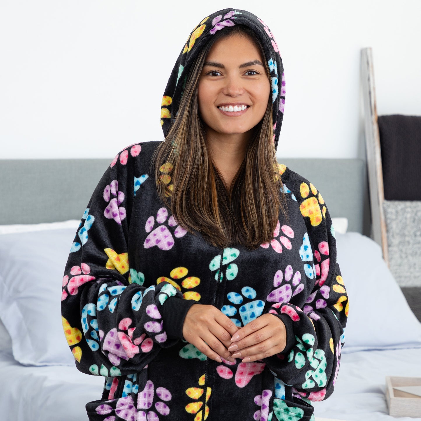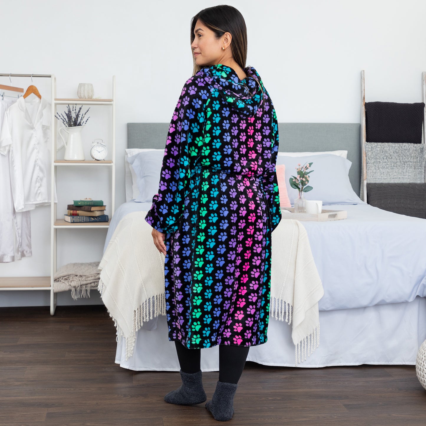 Indulge in the unparalleled comfort of our Super Cozy™ fleece, transformed into the ultimate blanket hoodie for those chilly days and nights! Designed to fit most, this wearable fleece blanket is not only incredibly warm but also wonderfully stylish, adorned with charming paw print designs.