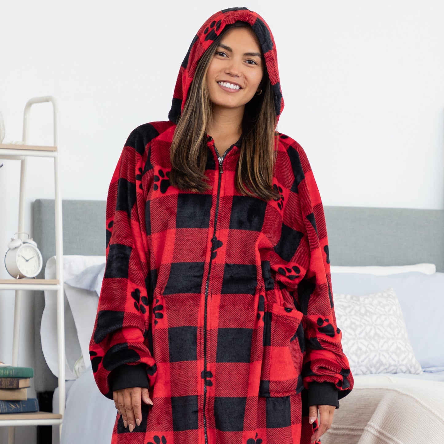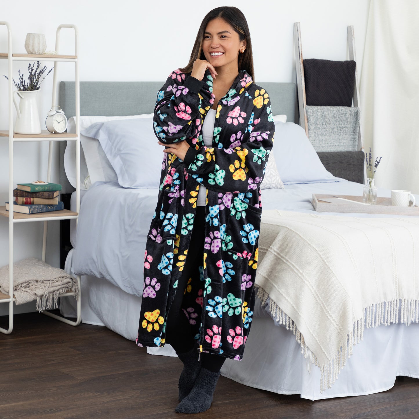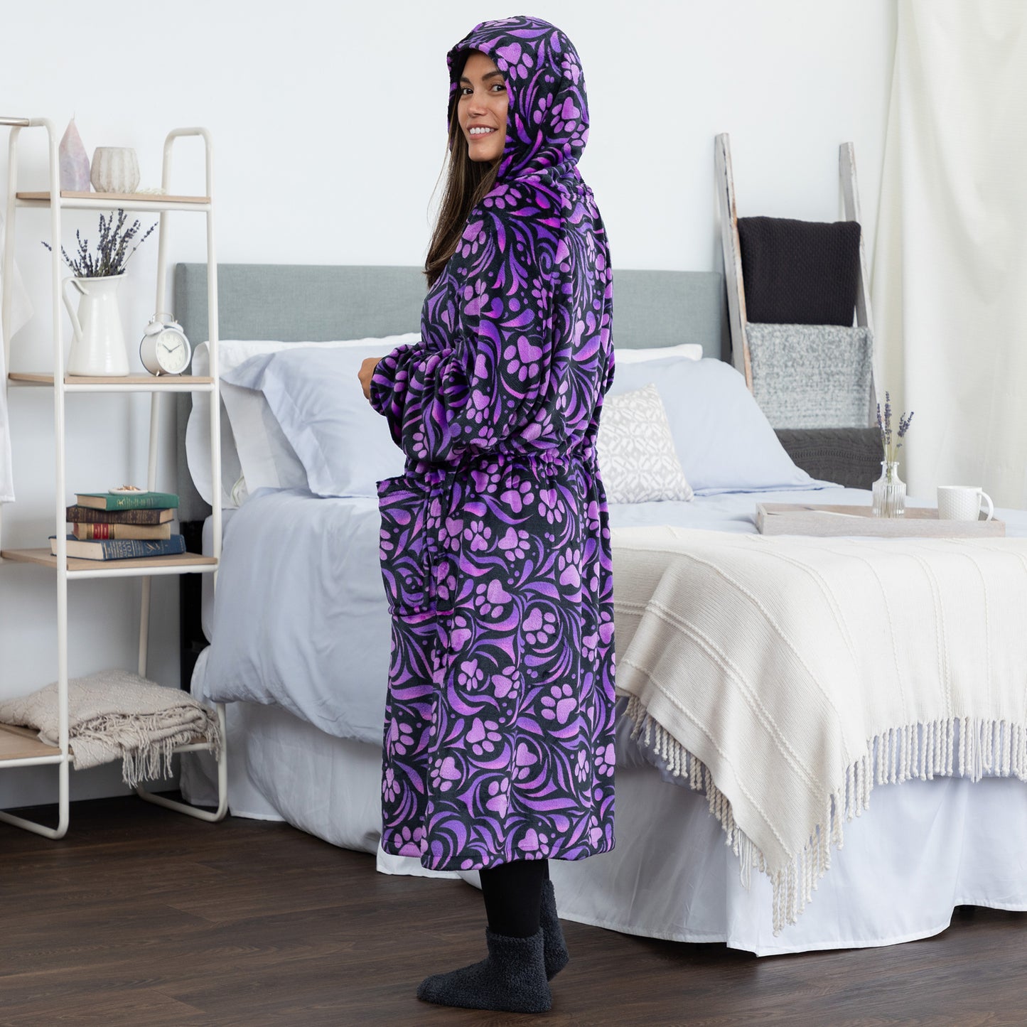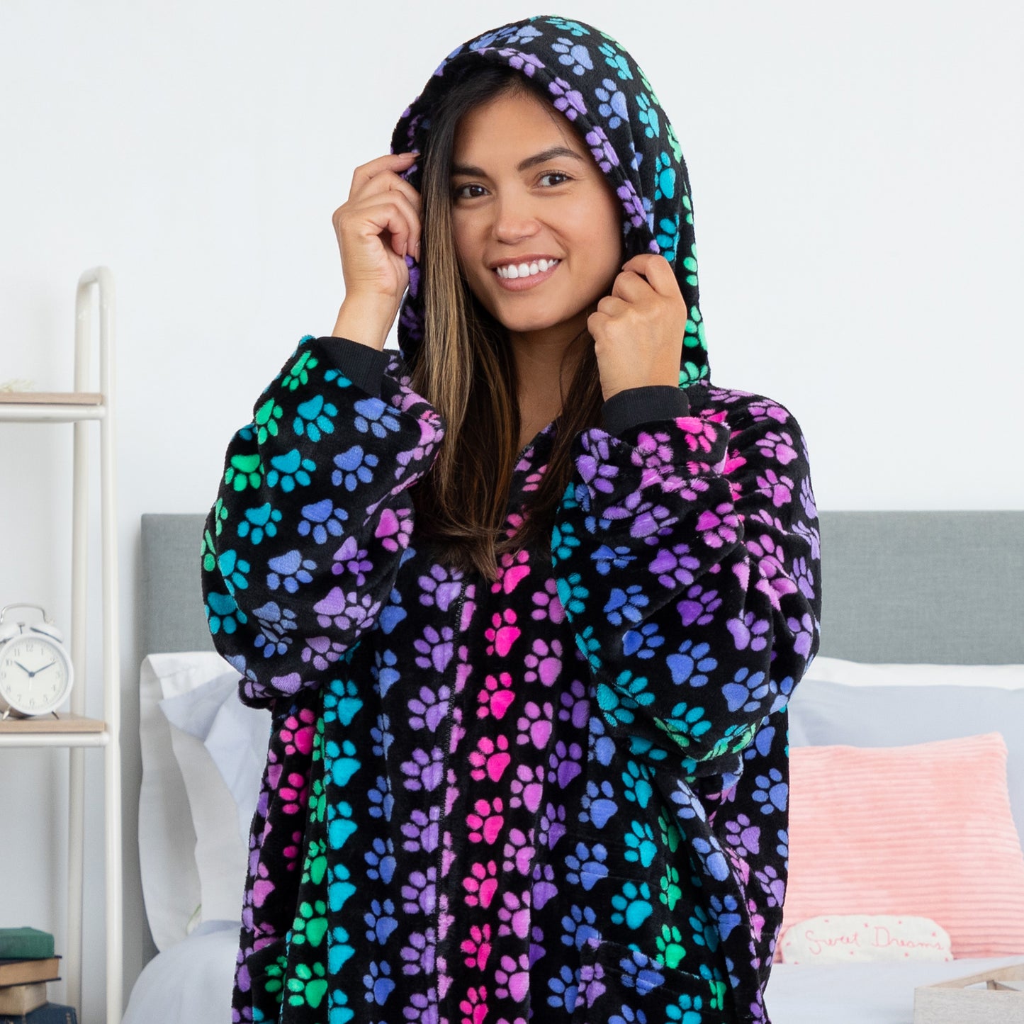 Indulge in the unparalleled comfort of our Super Cozy™ fleece, transformed into the ultimate blanket hoodie for those chilly days and nights! Designed to fit most, this wearable fleece blanket is not only incredibly warm but also wonderfully stylish, adorned with charming paw print designs.