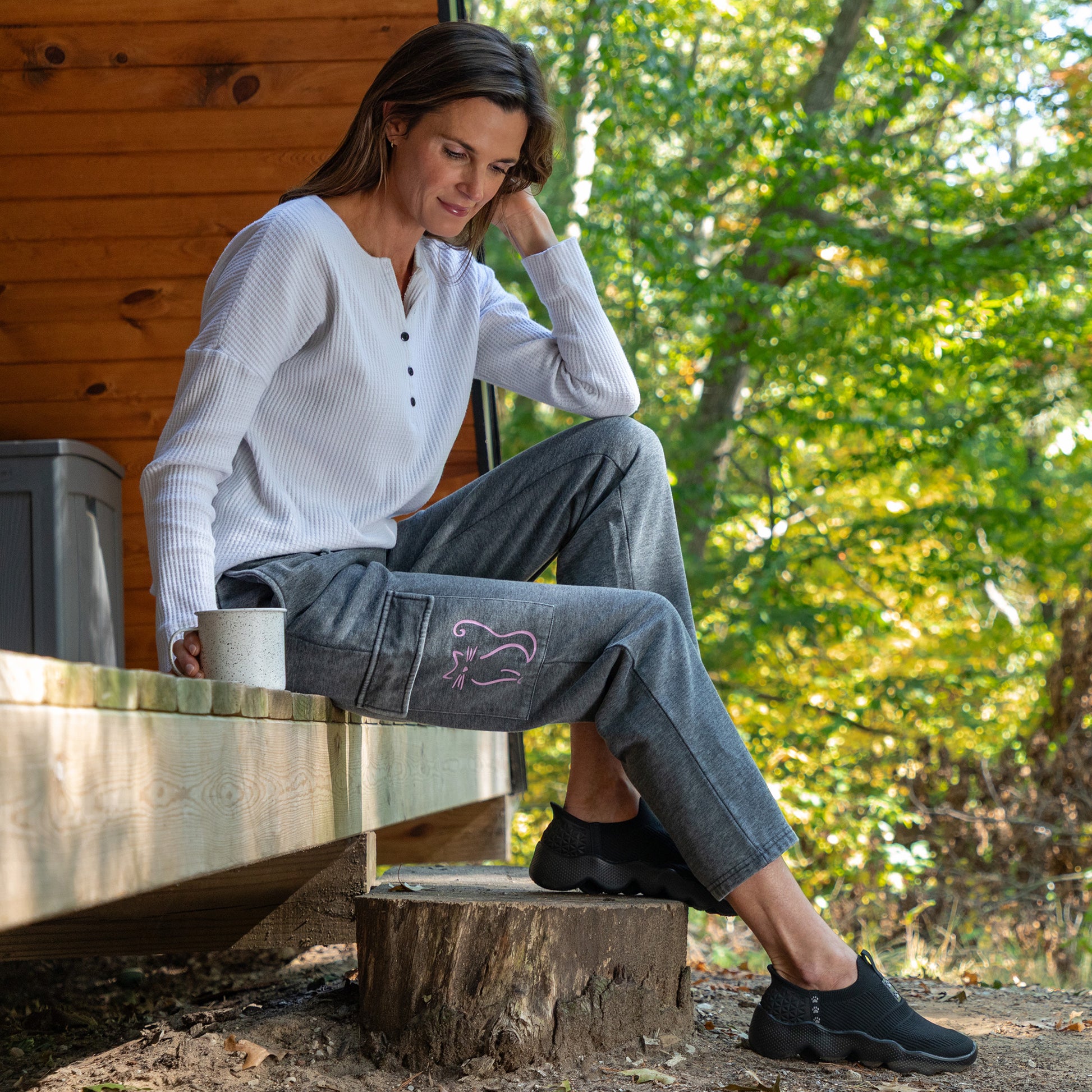 Cute, comfortable, and totally lounge-worthy! Made with a soft cotton blend in a burnout fabric, this lightweight pair flaunts an open leg that isn't constricting at the hems, a comfortable drawstring waist, and pockets. Topped with a rainbow colored zebra print paw on the cargo pocket as a symbol of your animal advocacy!
