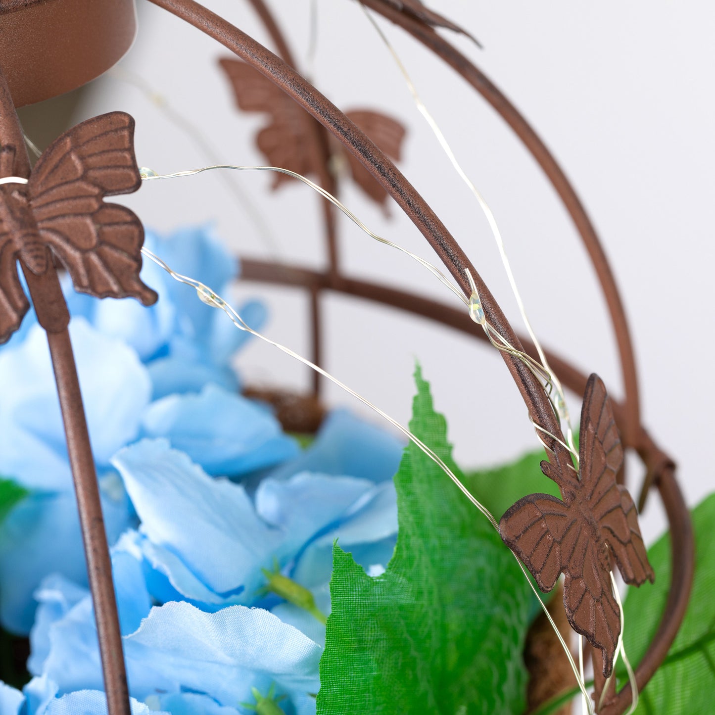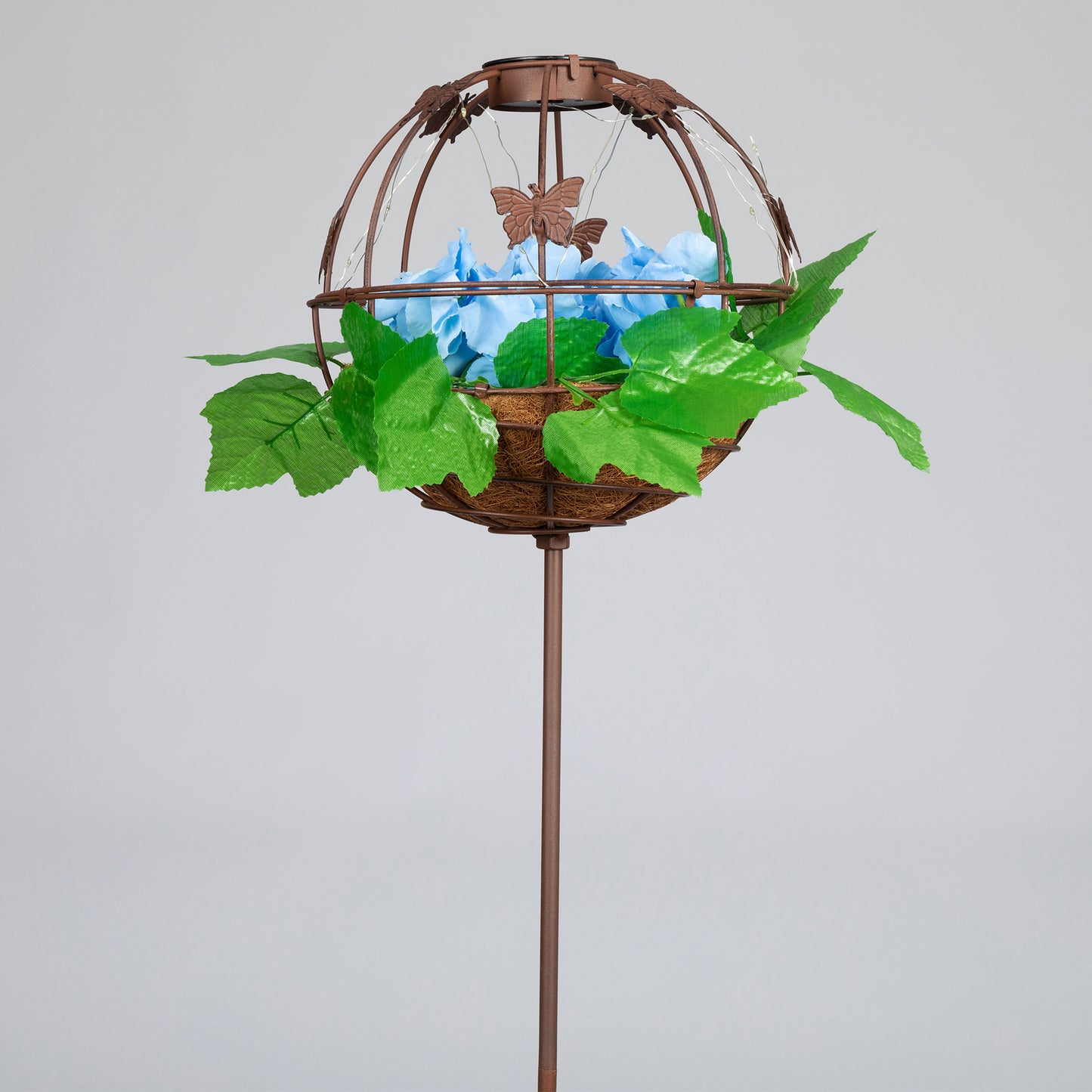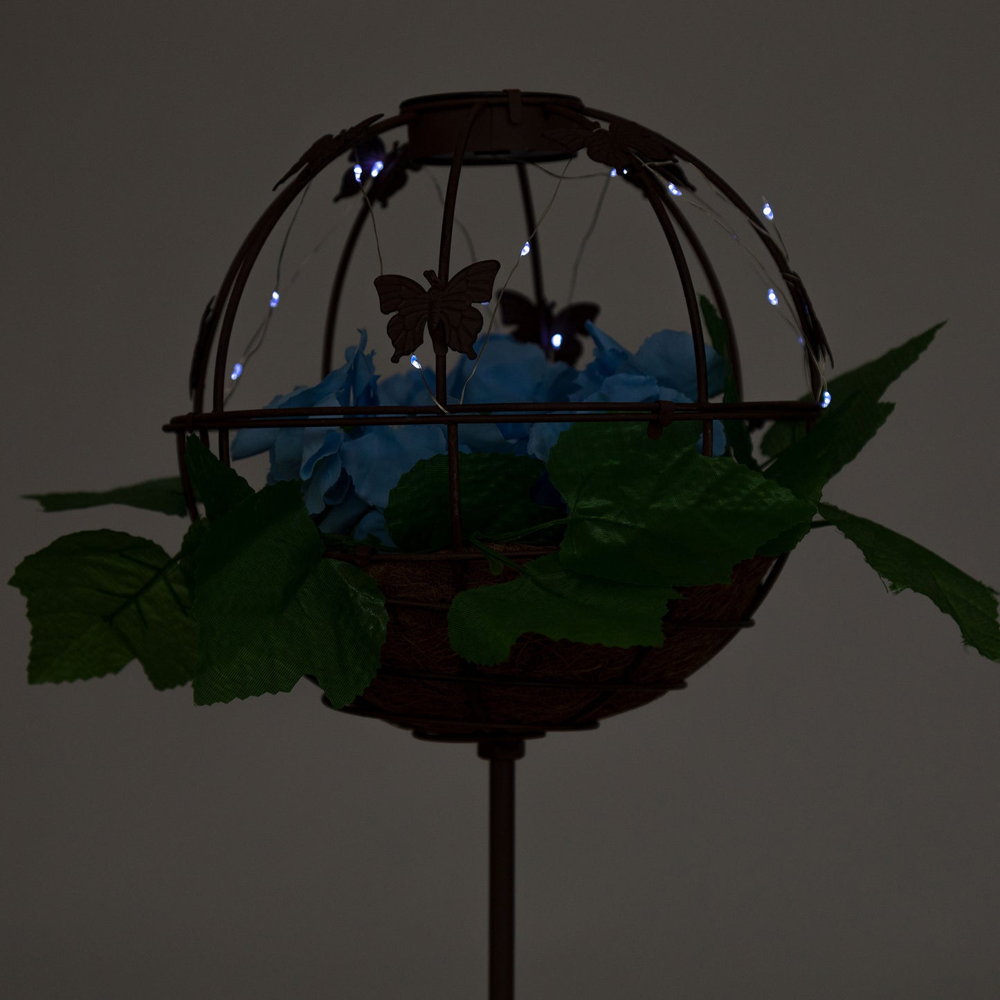 Turn your outdoor space into an ethereal place to relax! Easily stake this sphere planter into the ground with the solar panel in full sun to charge, and enjoy the butterflies or bees that flutter throughout the design! Topped with colorful faux flowers and greenery to enjoy during the day, and softly glowing LED lights that shine all night.